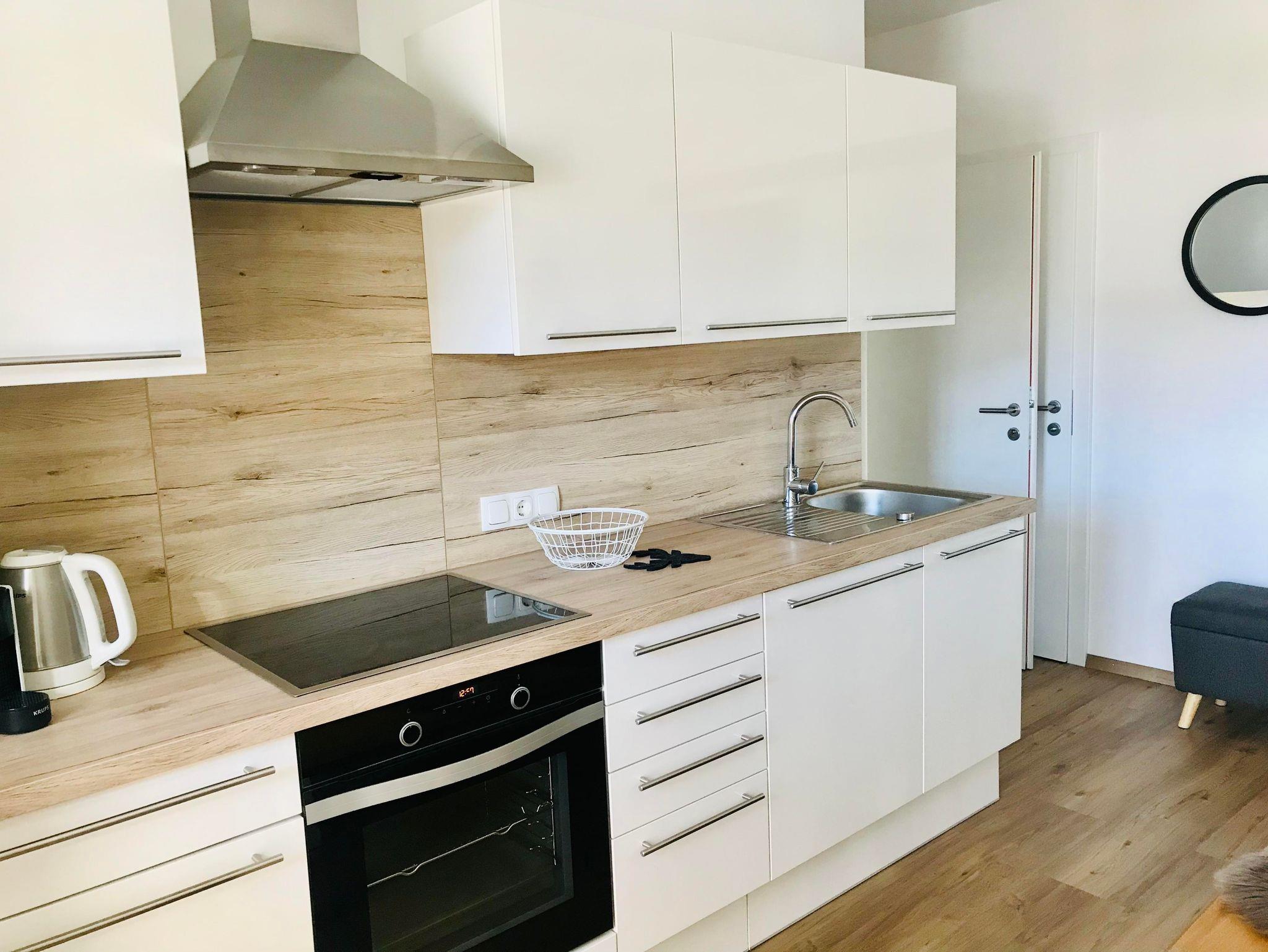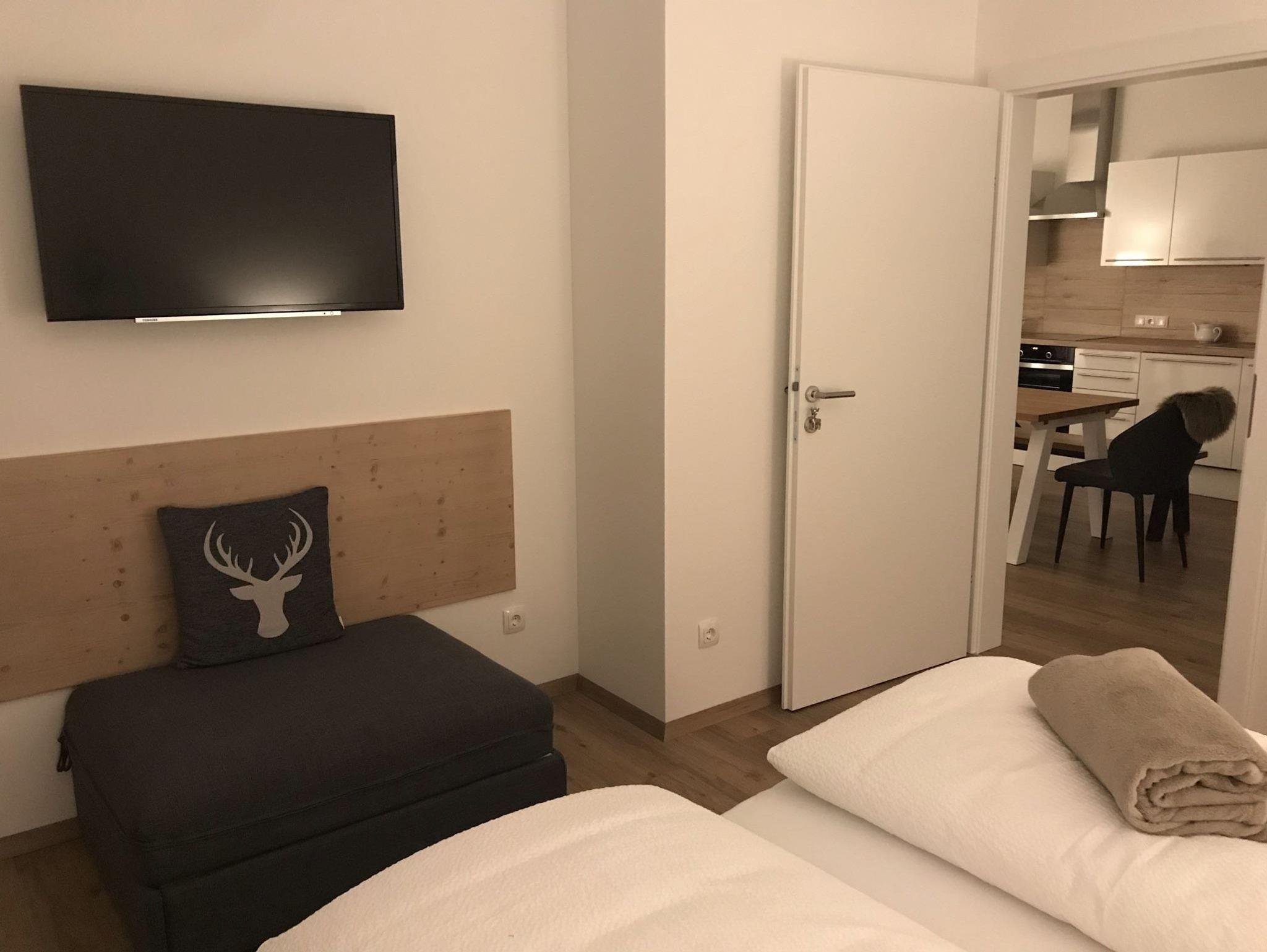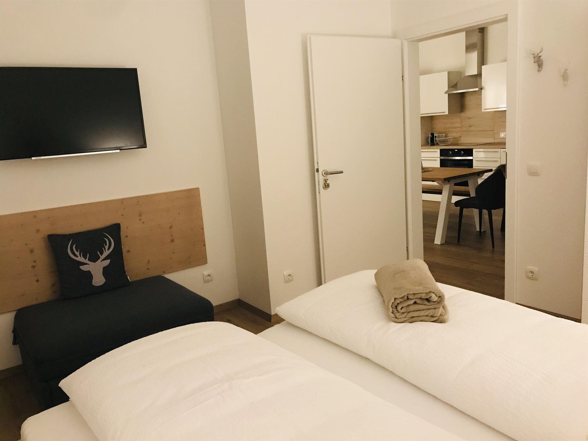 Schönes Wohlfühlappartement für bis zu 5 Personen, mit 2 Wohlfühl-Schlafzimmern, ausgestattet je mit eigenem LCD-TV und Bettwäsche, gemütliche Küche mit Sitzbereich und Zugang zum Wintergarten-Balkon, schönes Badezimmer mit Waschtisch aus Eichenholz, ebenerdiger Dusche sowie Haarfön und Handtücher, getrenntes WC.
