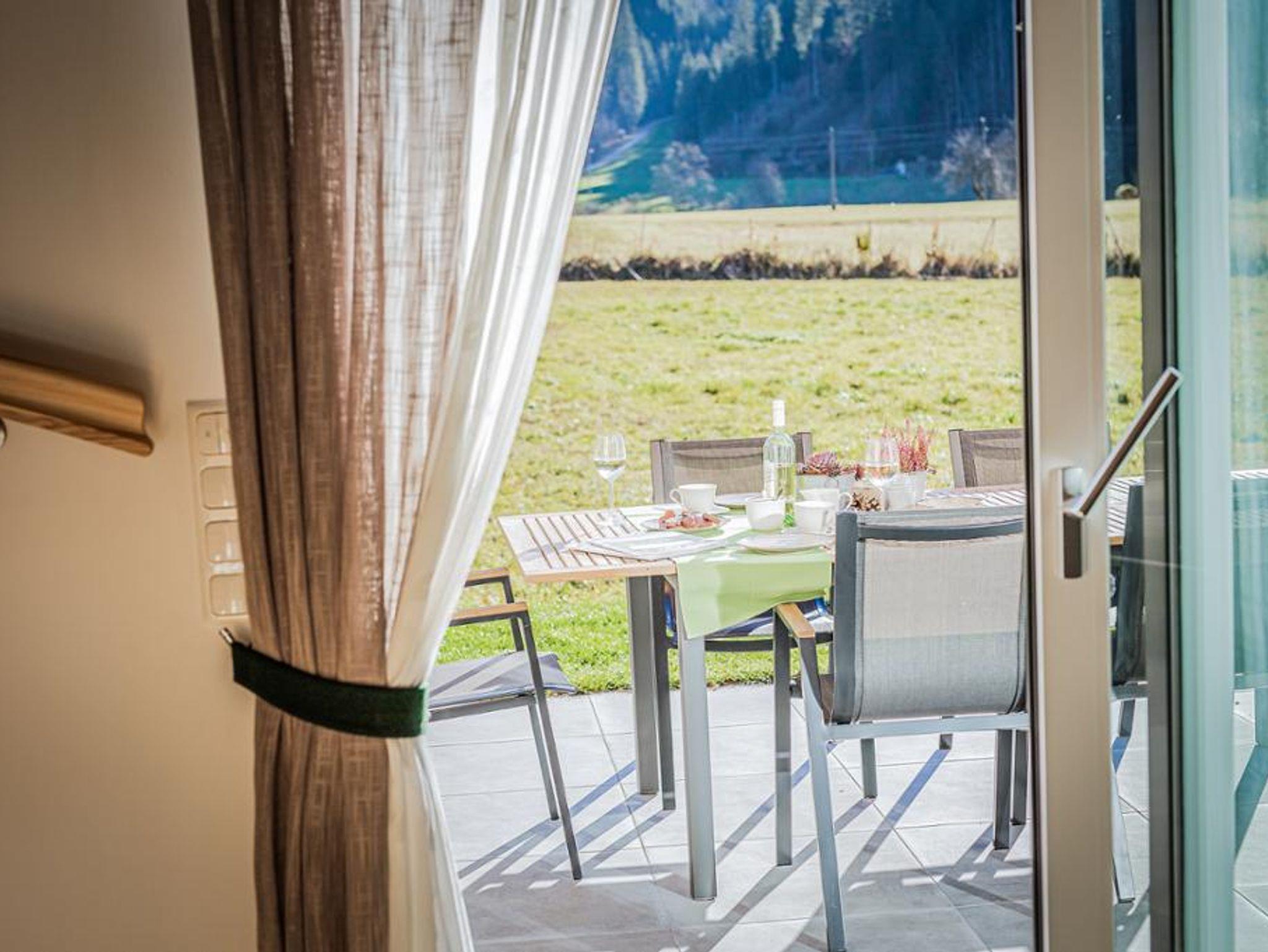 Durch eine große Schiebetür gelangen sie auf die sonnige Terrasse.