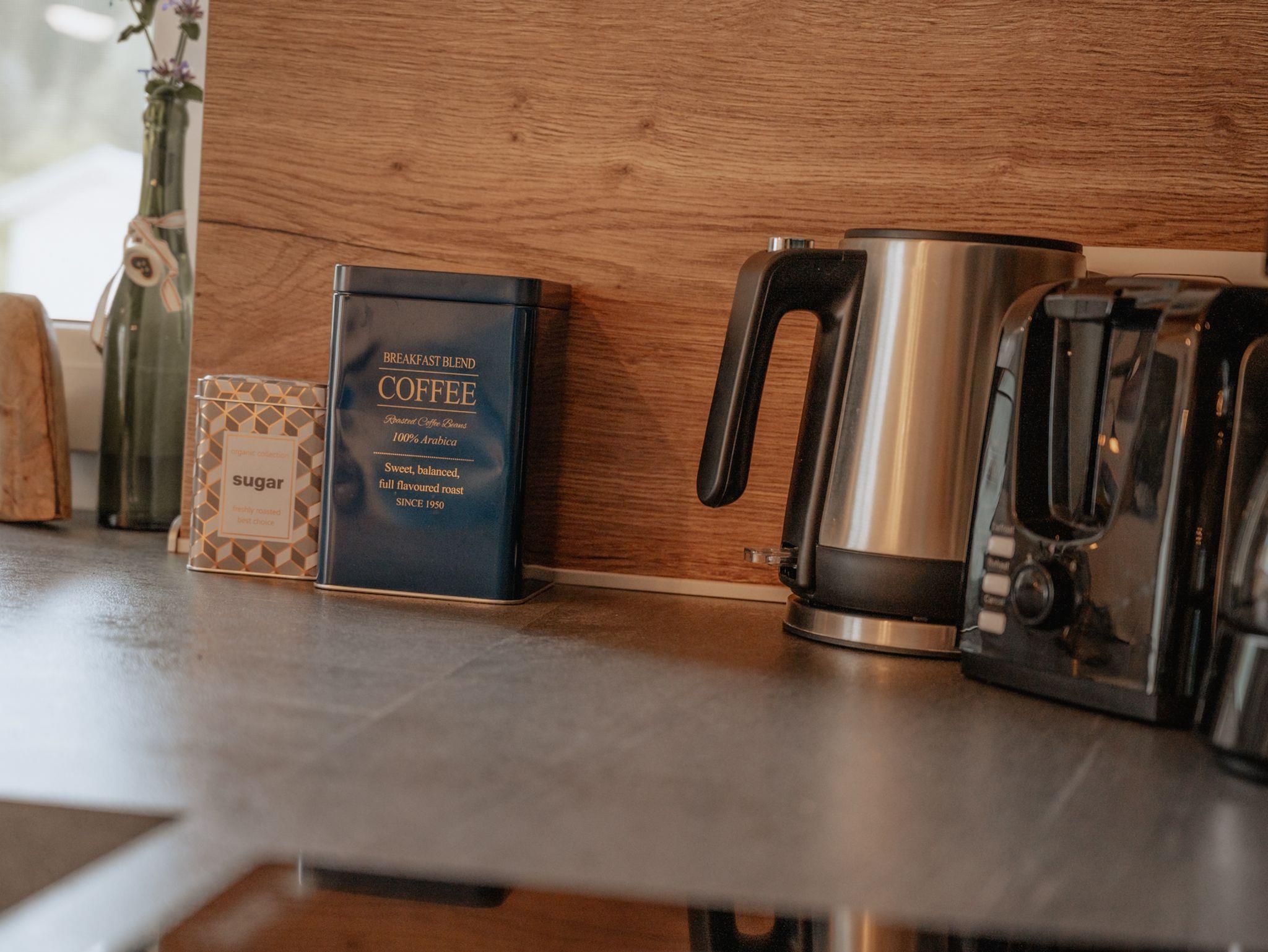 Die modern eingerichtete Küche im Erdgeschoß beinhaltet E-Herd, Kühlgefrierschrank, Geschirrspüler, Toaster Wasserkocher, Kaffeemaschine, sämtliches Geschirr sowie Reinigungsmittel.