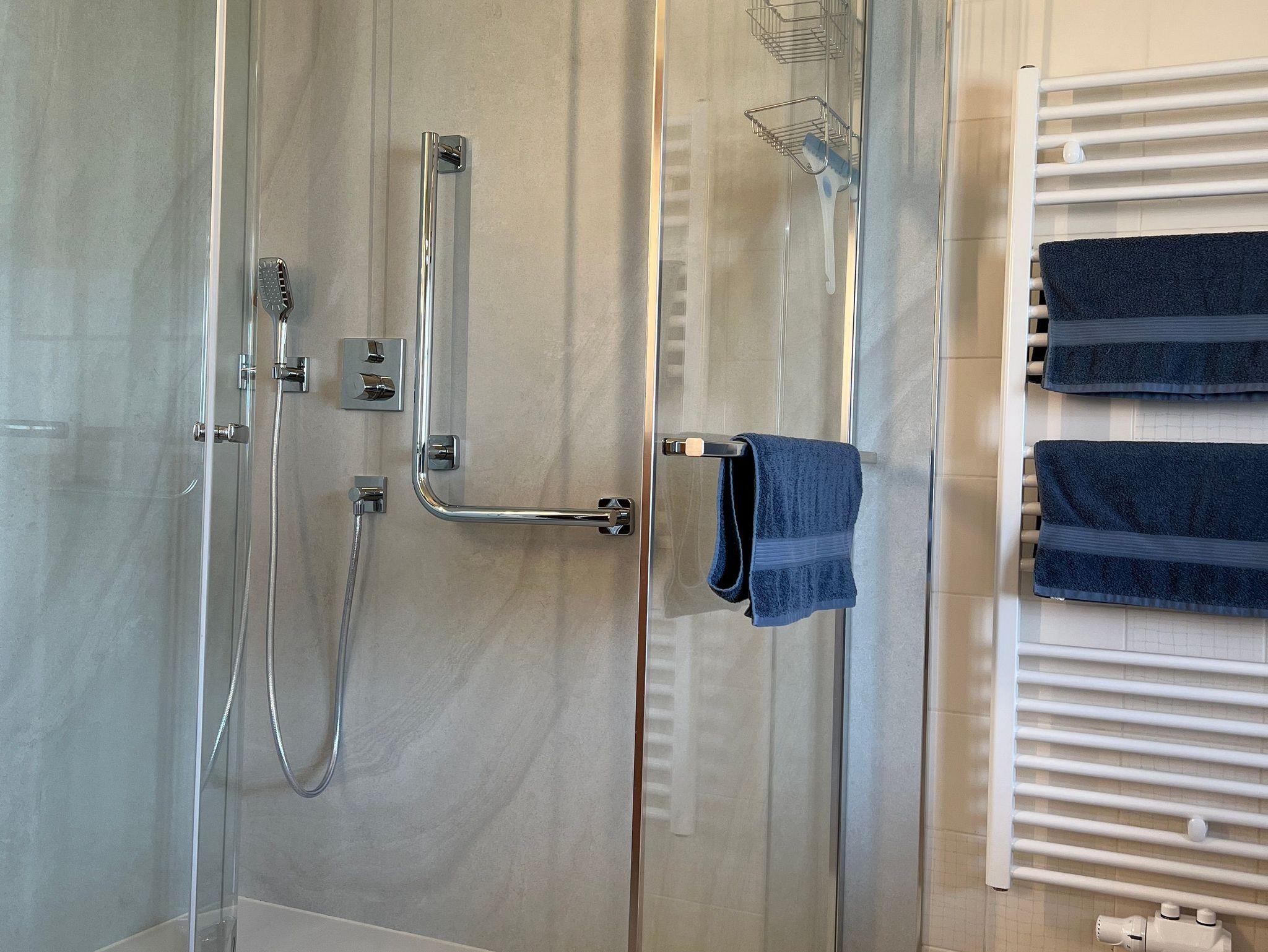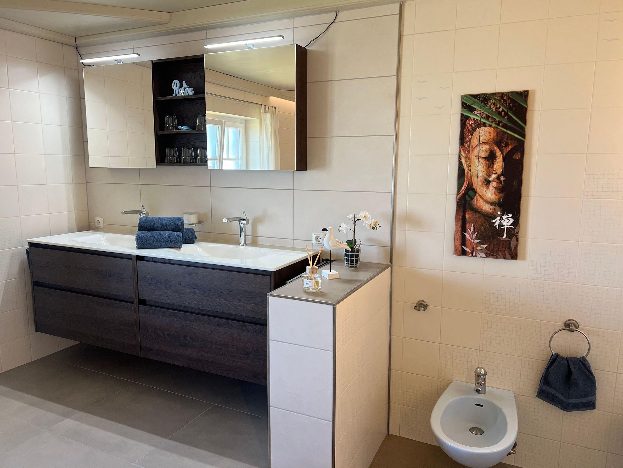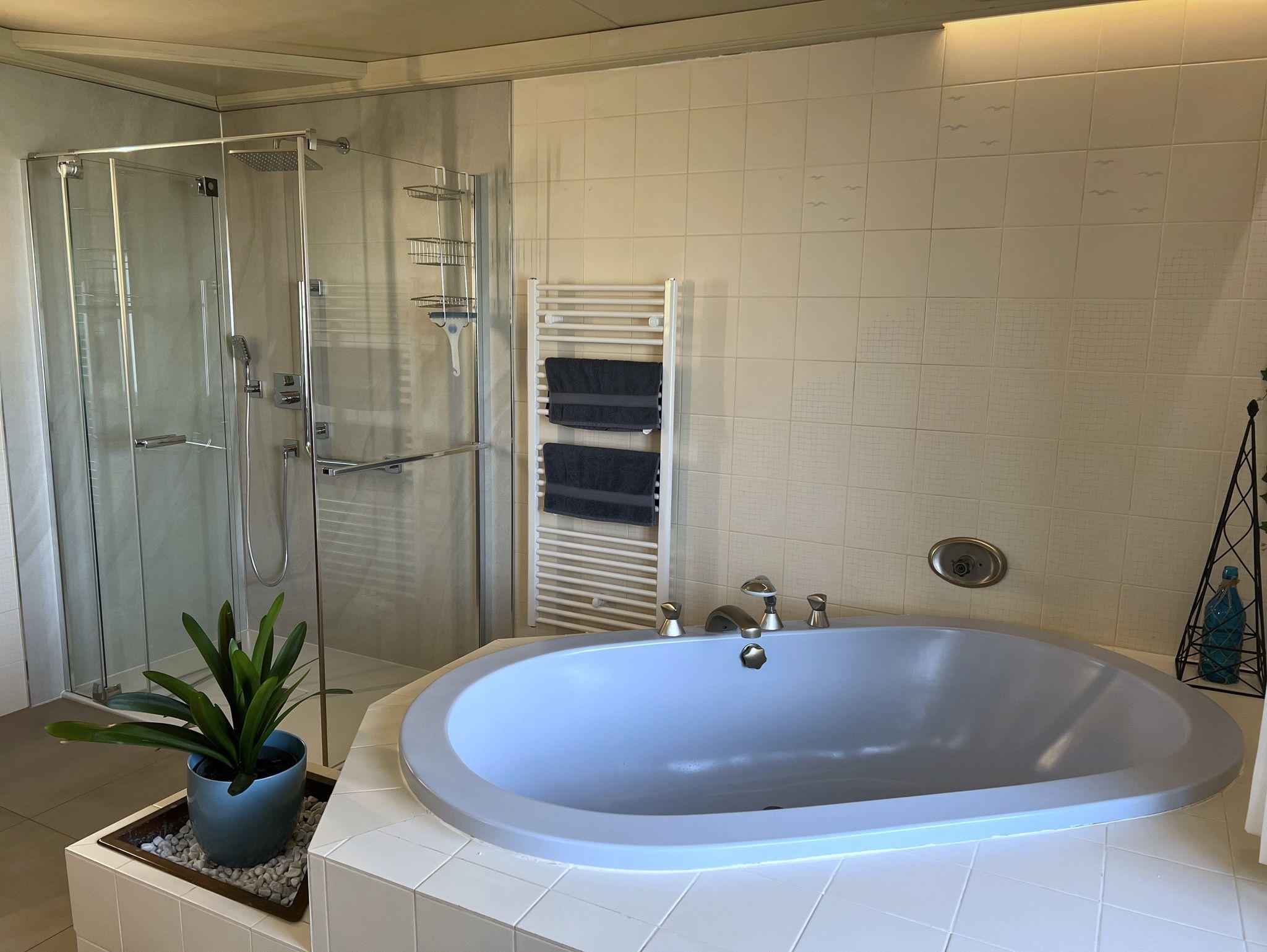 Die Wohnung beinhaltet 4 Schlafzimmer mit je einem Doppelbett 180x200, eine voll ausgestattete Küche und einen Esstisch im Inneren sowie auch im Freien. Außerdem verfügt die Wohnung über einen Garten, zwei Balkone, ein Bad und ein extra WC.