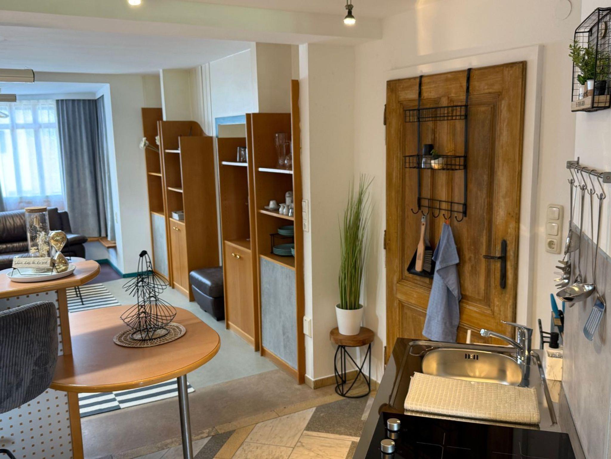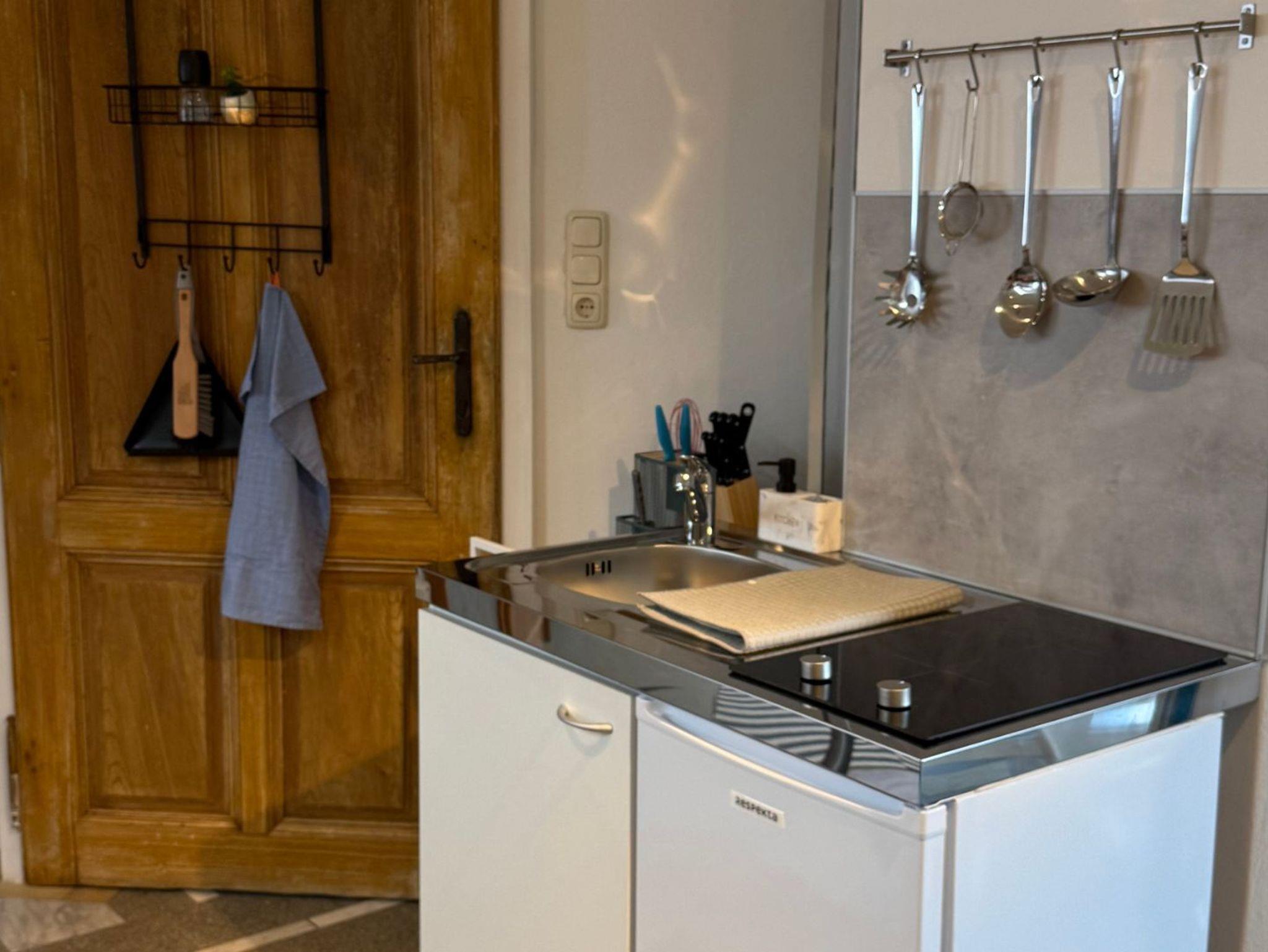 Kochnische: Ihre kleine Küchenzeile ist mit einer Spüle, zwei Cerankochfeldern und einem Kühlschrank mit Gefrierfach ausgestattet. Töpfe, Pfannen und Kochutensilien stehen bereit, um kulinarische Köstlichkeiten zu zaubern.