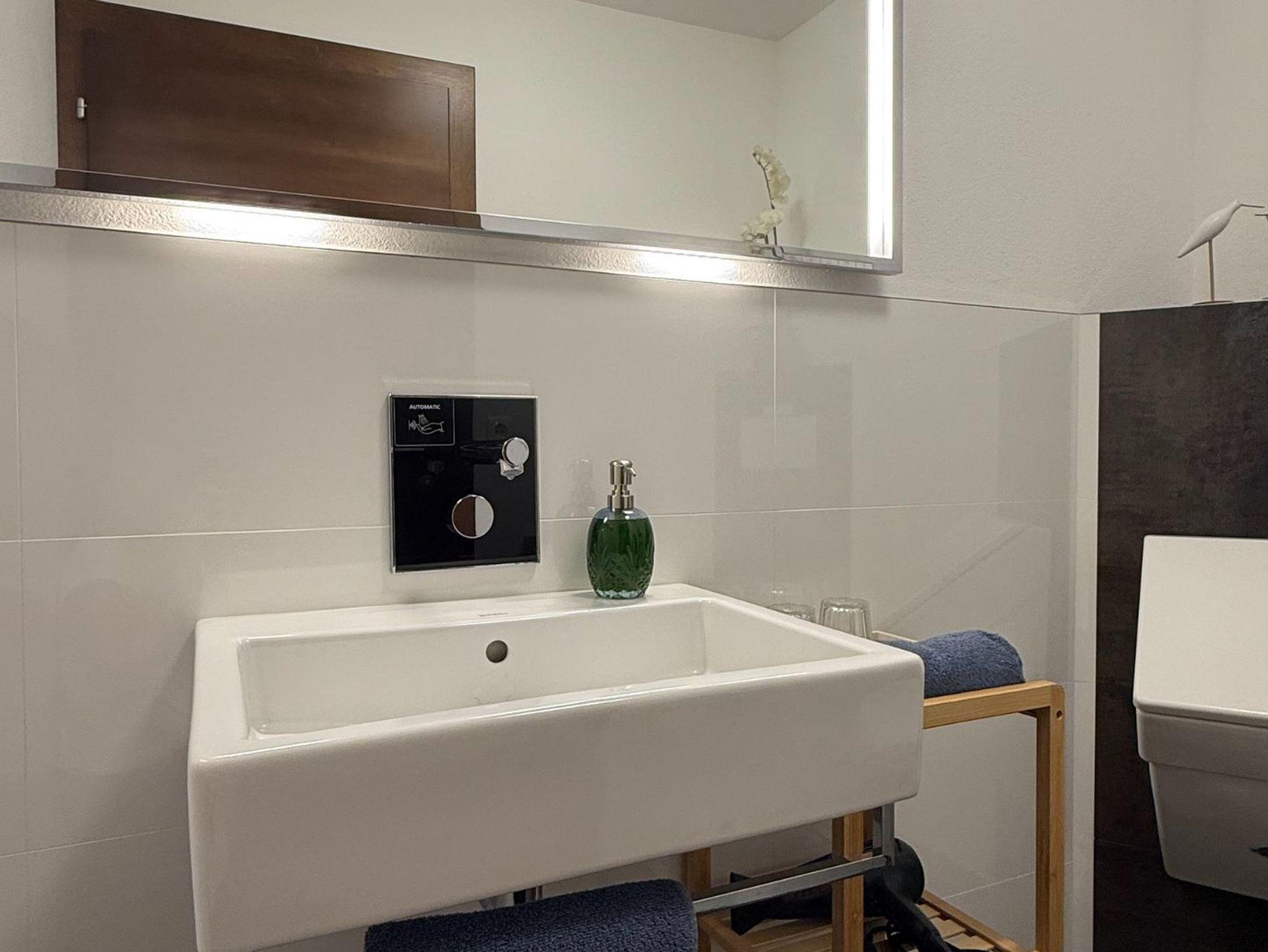 Badezimmer: Der separate Sanitärbereich bietet Ihnen einen modernen Waschtisch mit berührungsloser Armatur, ein WC und ein Pissoir. Ein großzügiger, beleuchteter Spiegel ergänzt das Badezimmer.