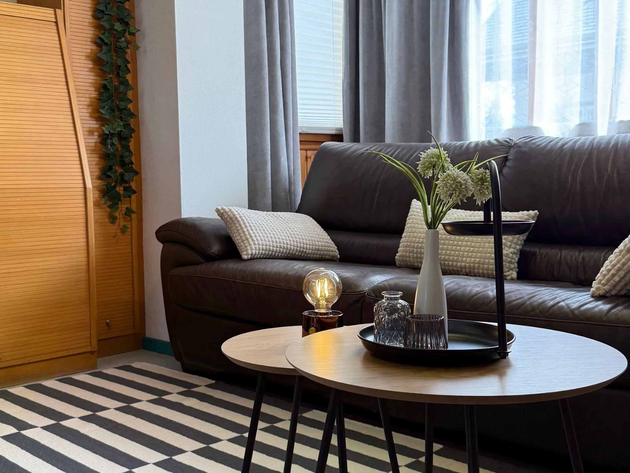 • Wohnbereich: Entspannen Sie auf der bequemen Ledercouch. Der Smart-TV kann mühelos in den Wohnbereich geschwenkt werden, damit Sie keine Ihrer Lieblingssendungen verpassen.