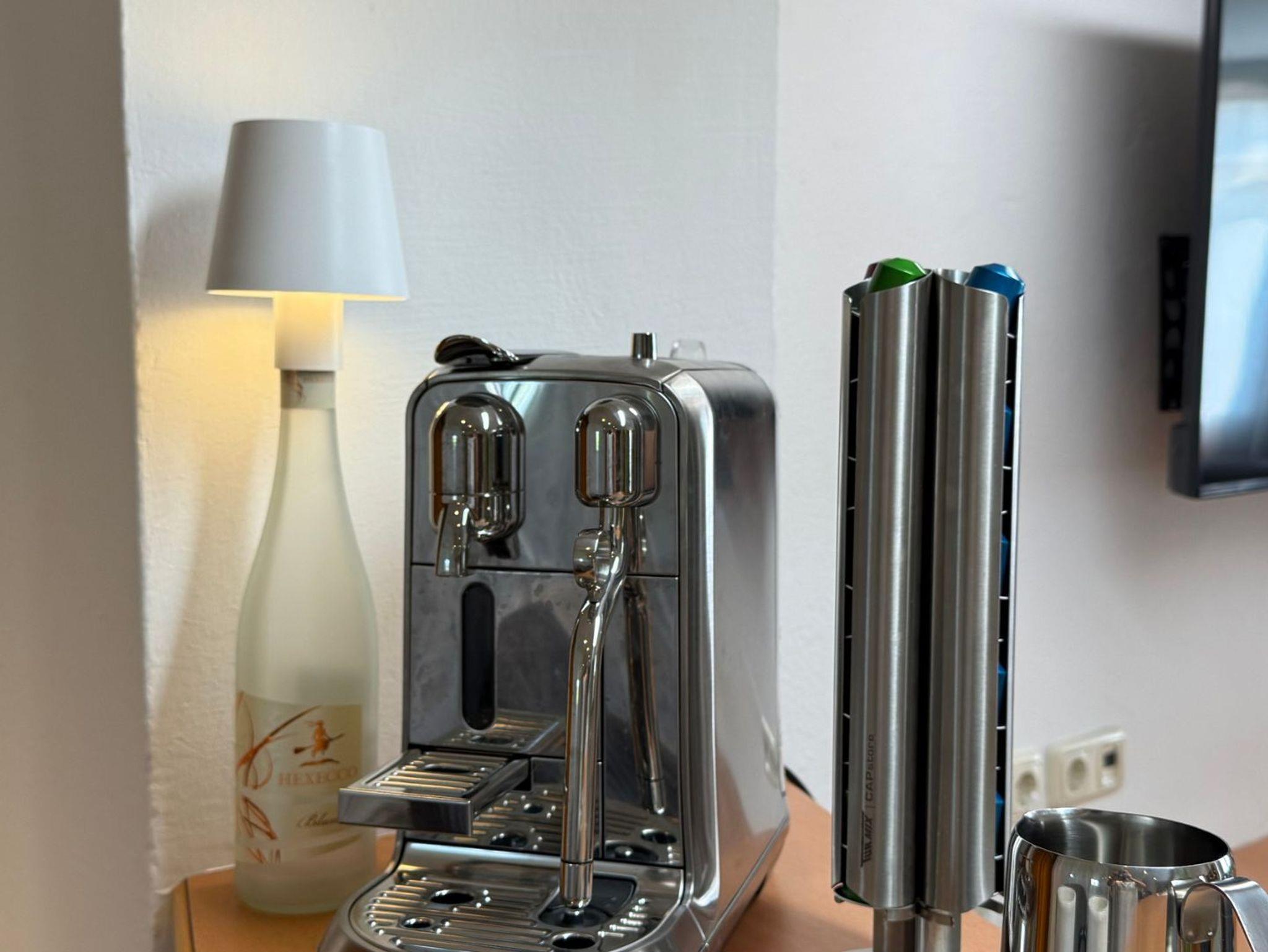 Barbereich: Hier erwarten Sie zwei stylische Hocker und eine Sage Nespresso Kaffeemaschine. Kaffeekapseln sind vor Ort gegen Gebühr erhältlich, damit Sie Ihren Morgenkaffee in vollen Zügen genießen können.