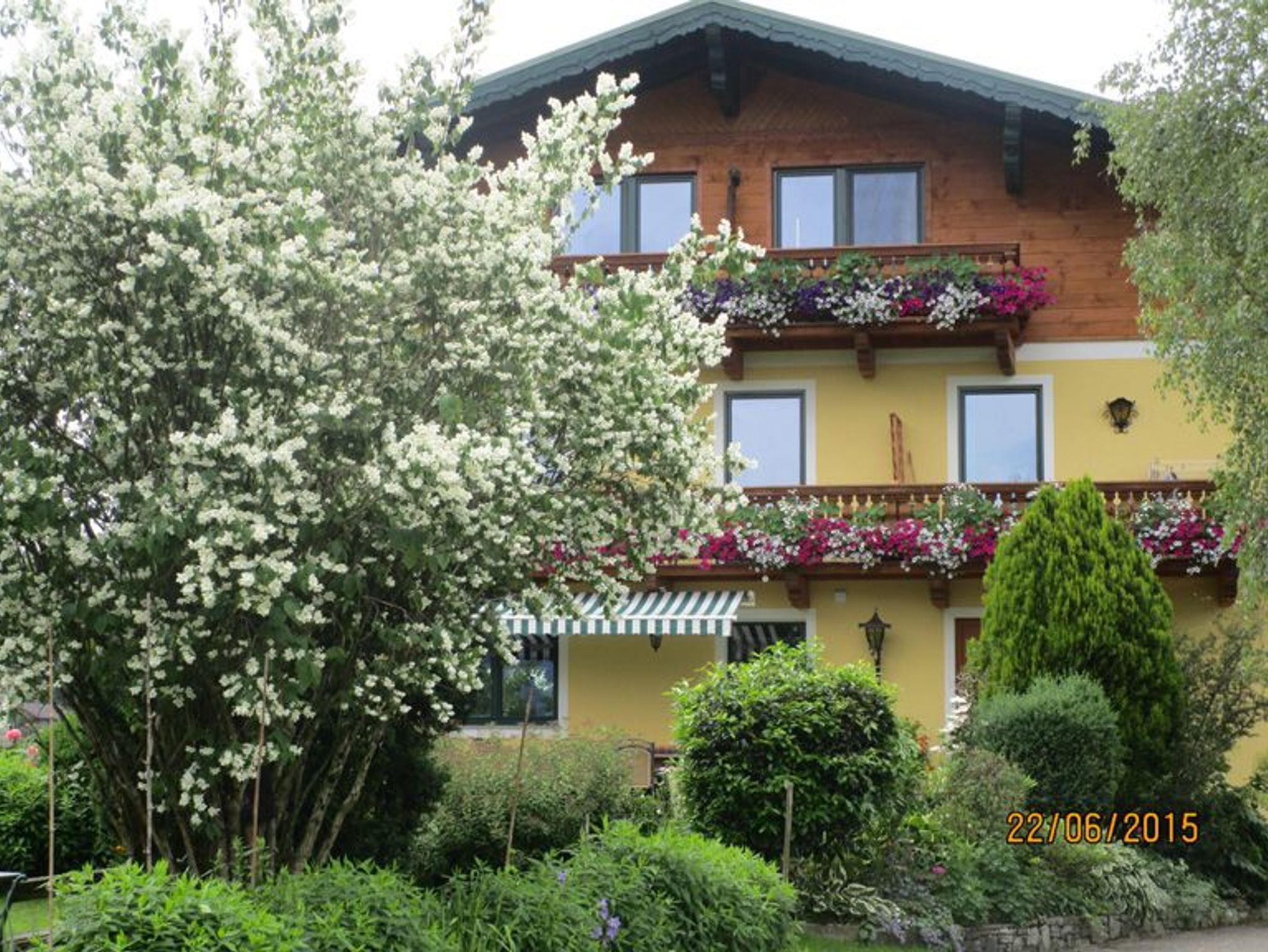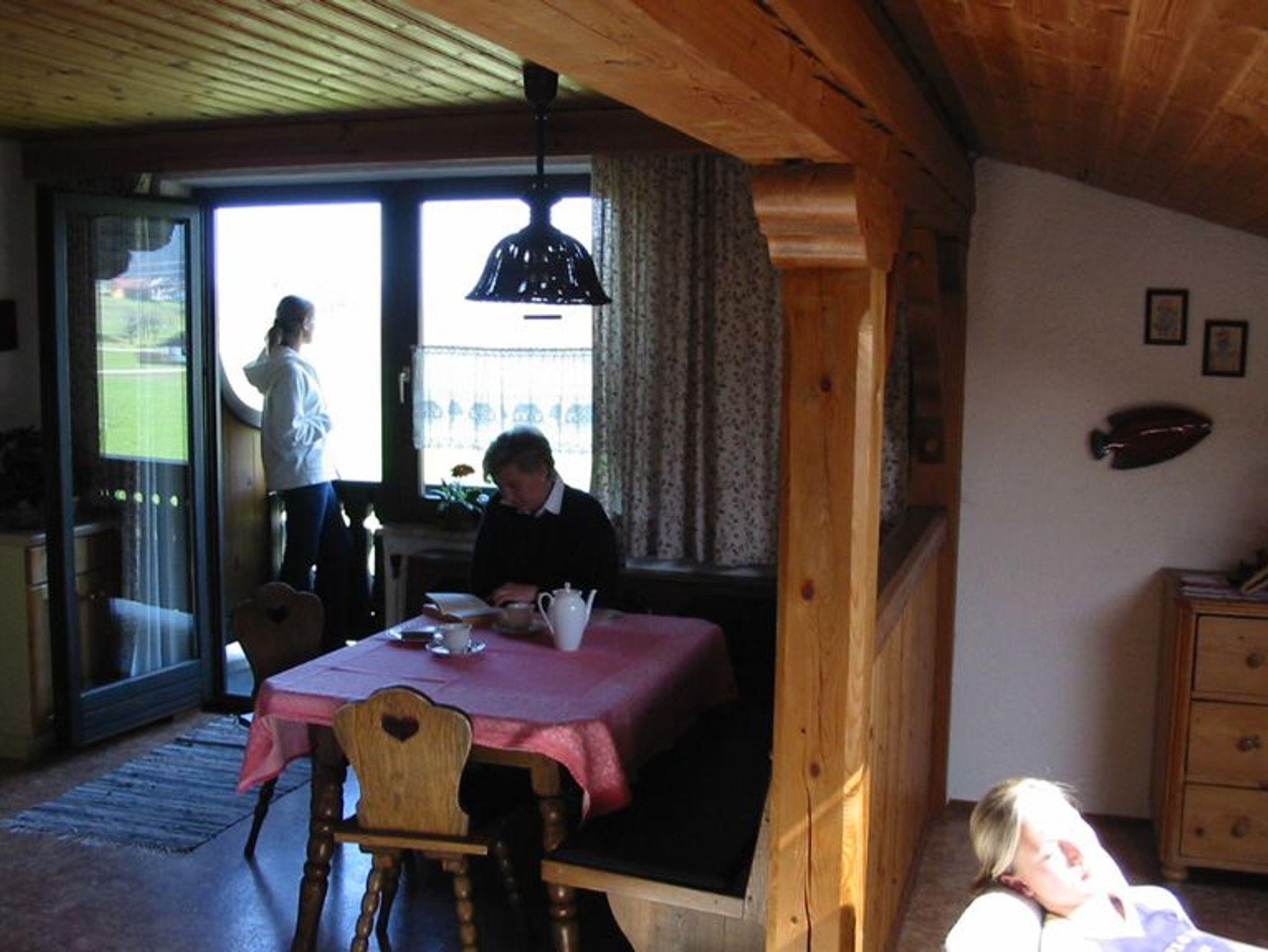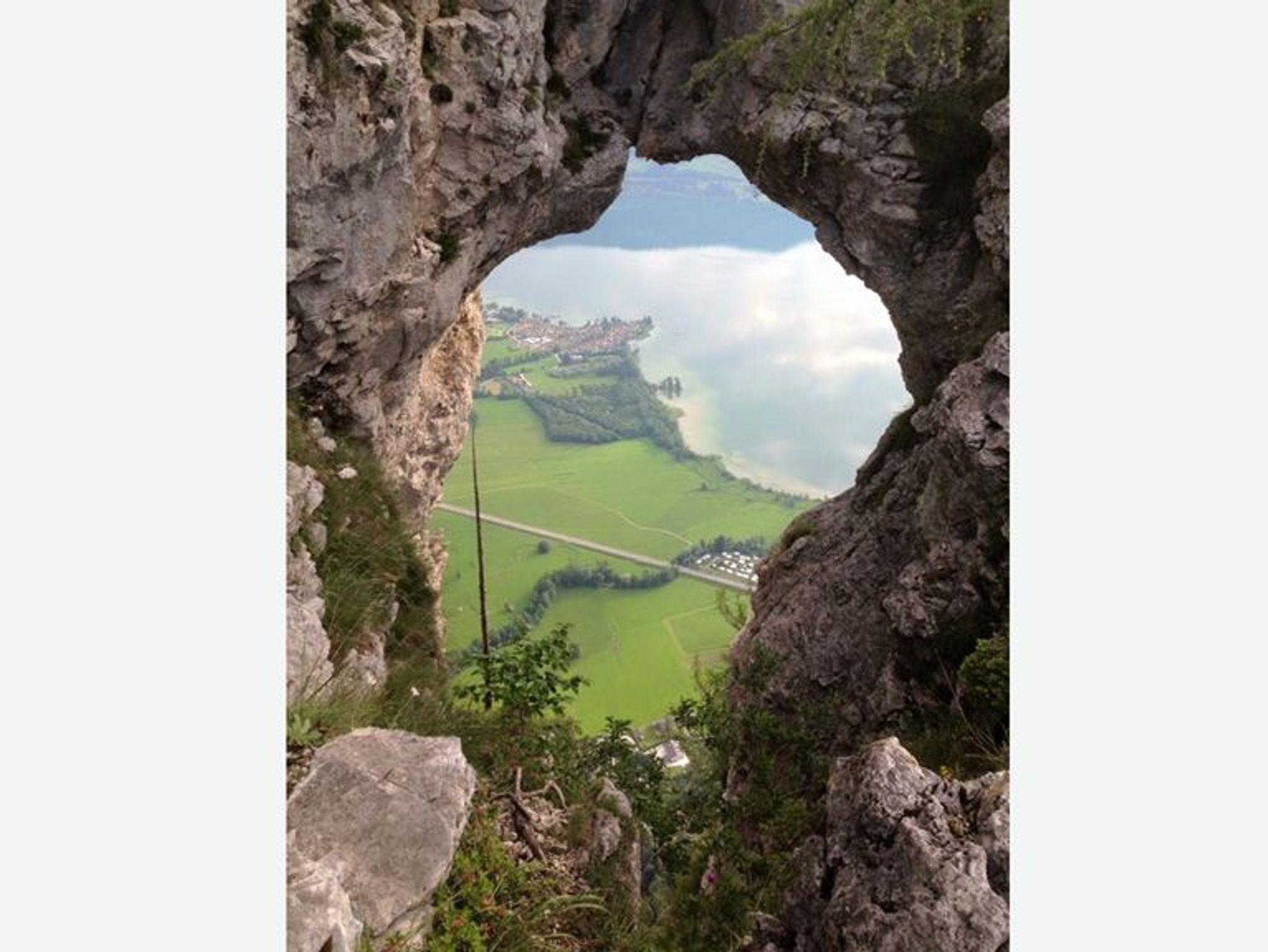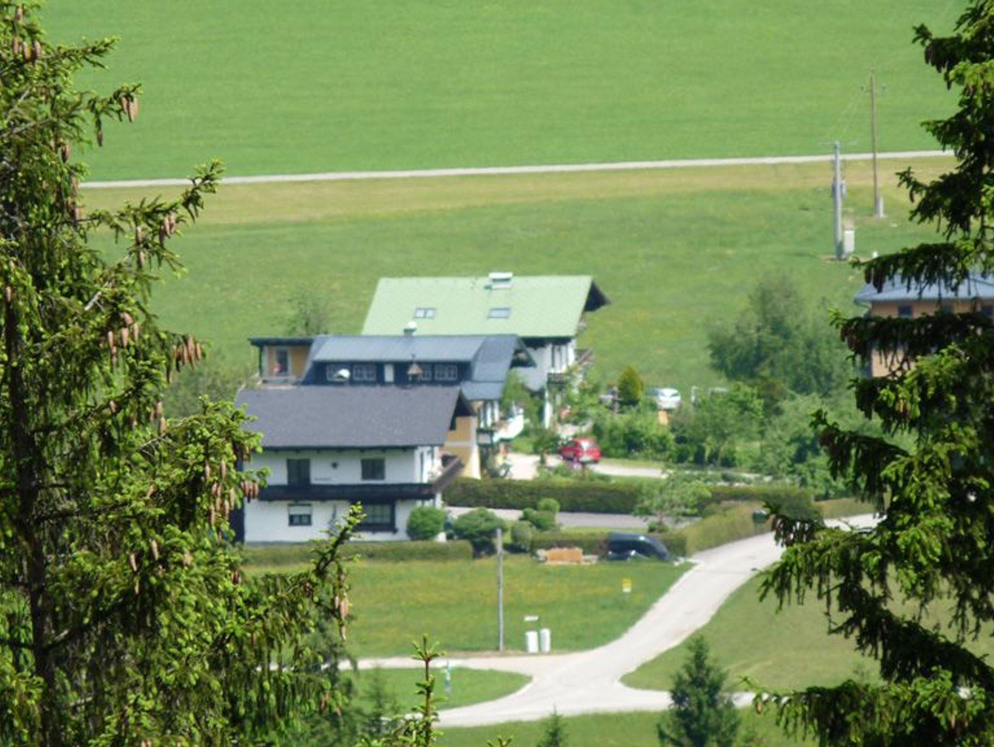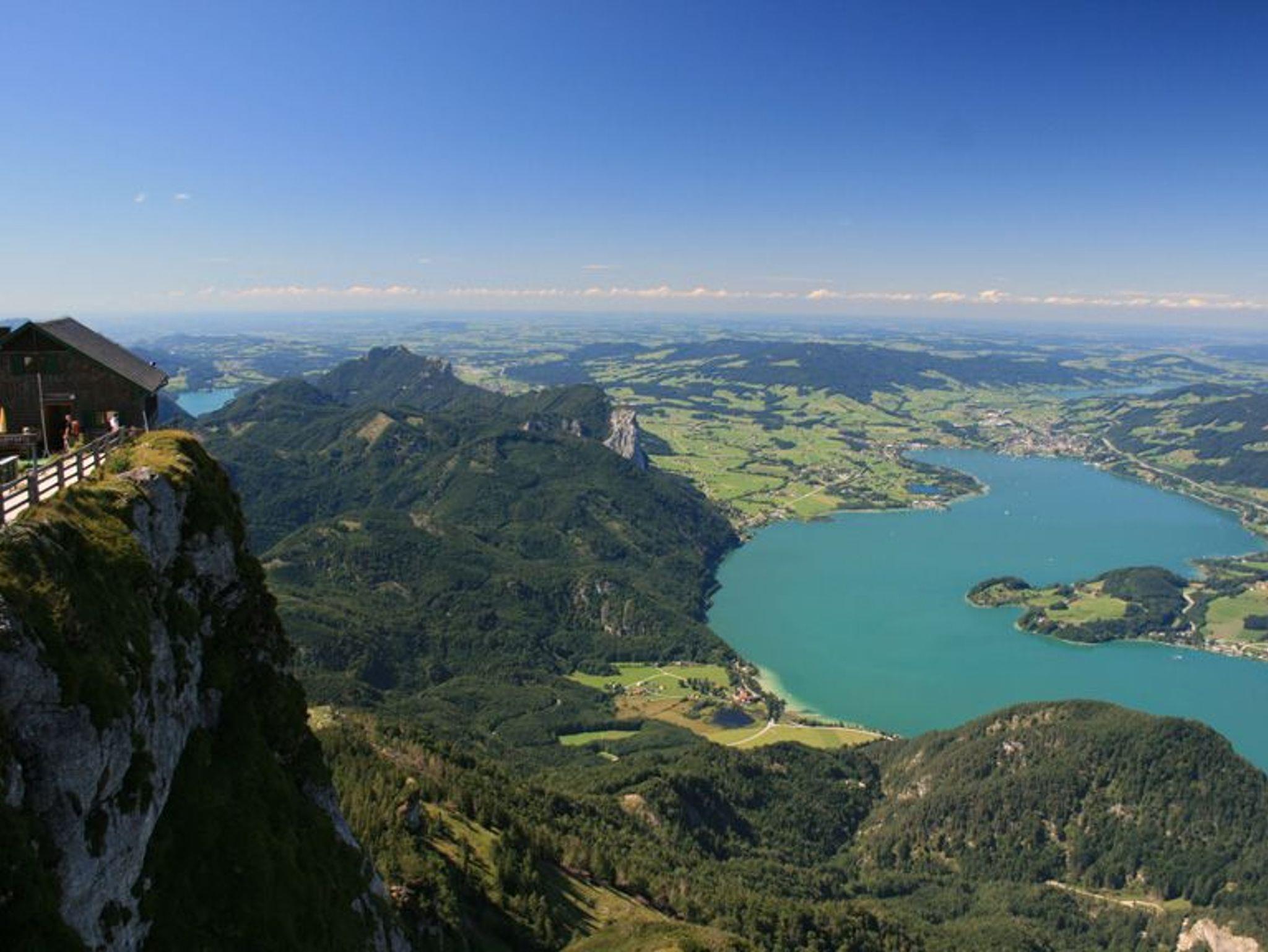 Vom Balkon aus sehen Sie über die Wiesen hinweg den Schafberg und die Drachenwand.