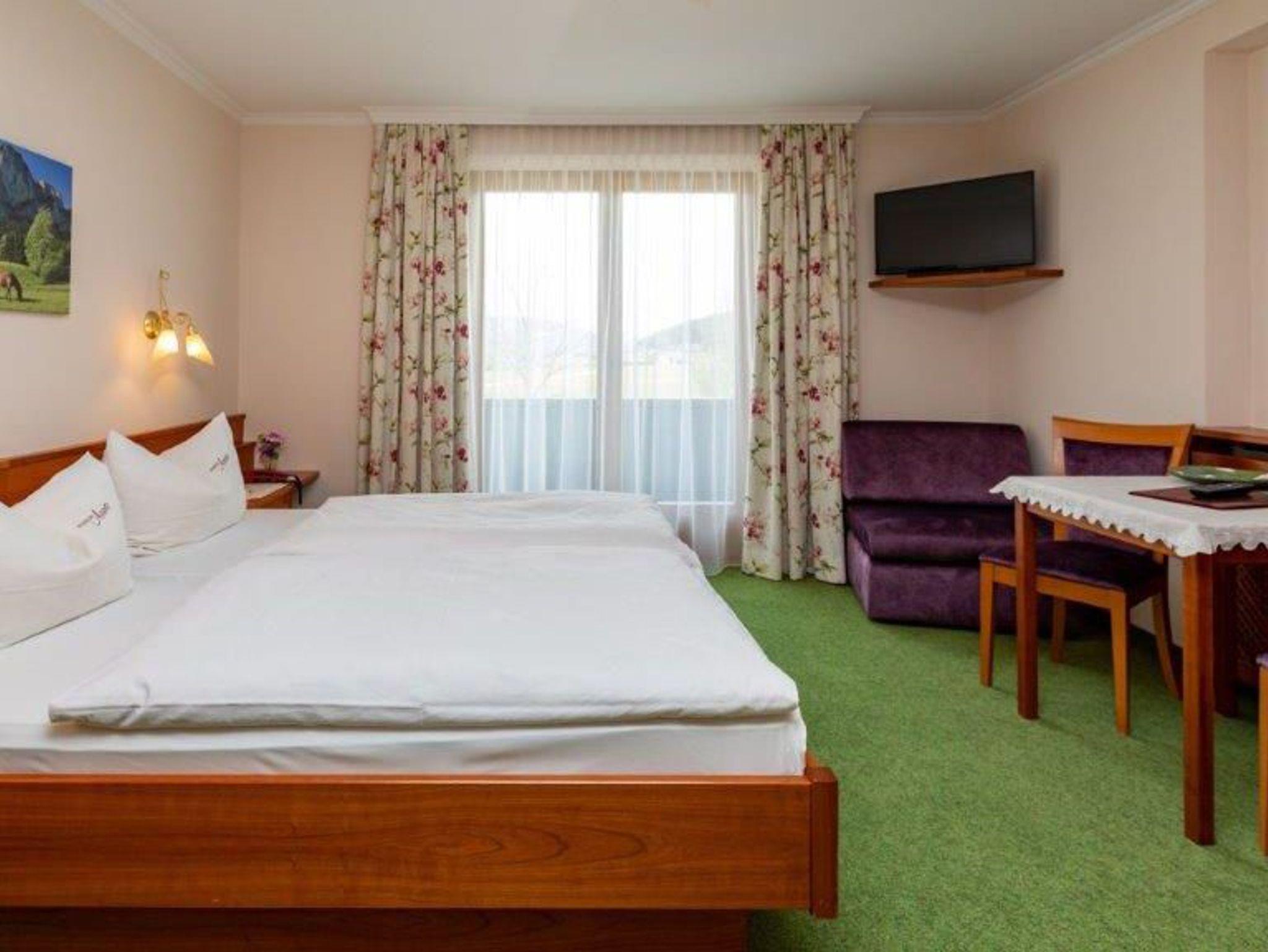 Unsere Doppelzimmer sind im ersten Stock unseres Hauses. Der Blick richtet sich auf eine herrliche Berglandschaft und in die großzügige Gartenanlage mit neuem beheiztem Pool. Die Zimmer sind gemütlich eingerichtet. Einen schönen Balkon hat jedes Zimmer. Ein Gästekühlschrank ist am Gang.