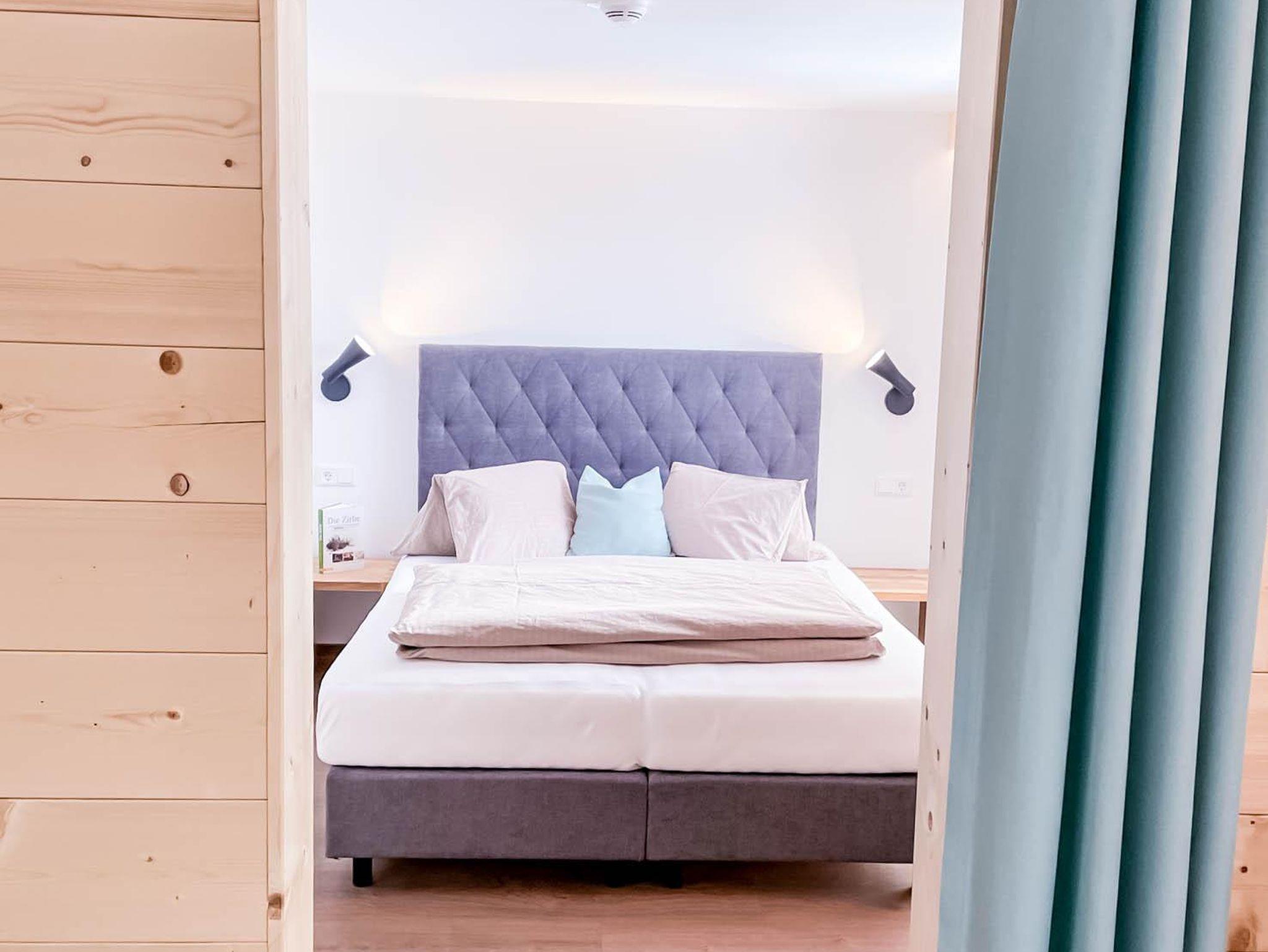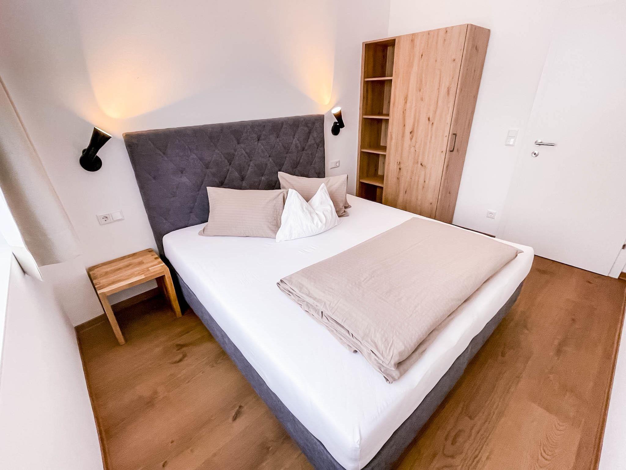 3 Schlafzimmer, alle mit tollem Bergblick und Verdunkelungsrollos. 2 Schlafzimmer sind mit Boxspringbett-Doppelbetten ausgestattet und 1 Schlafzimmer hat ein Französisches Boxspringbett (1,4m x 2m). Zusätzlich im Wohnbereich die Möglichkeit das Sofa als Schlafmöglichkeit zu verwenden.