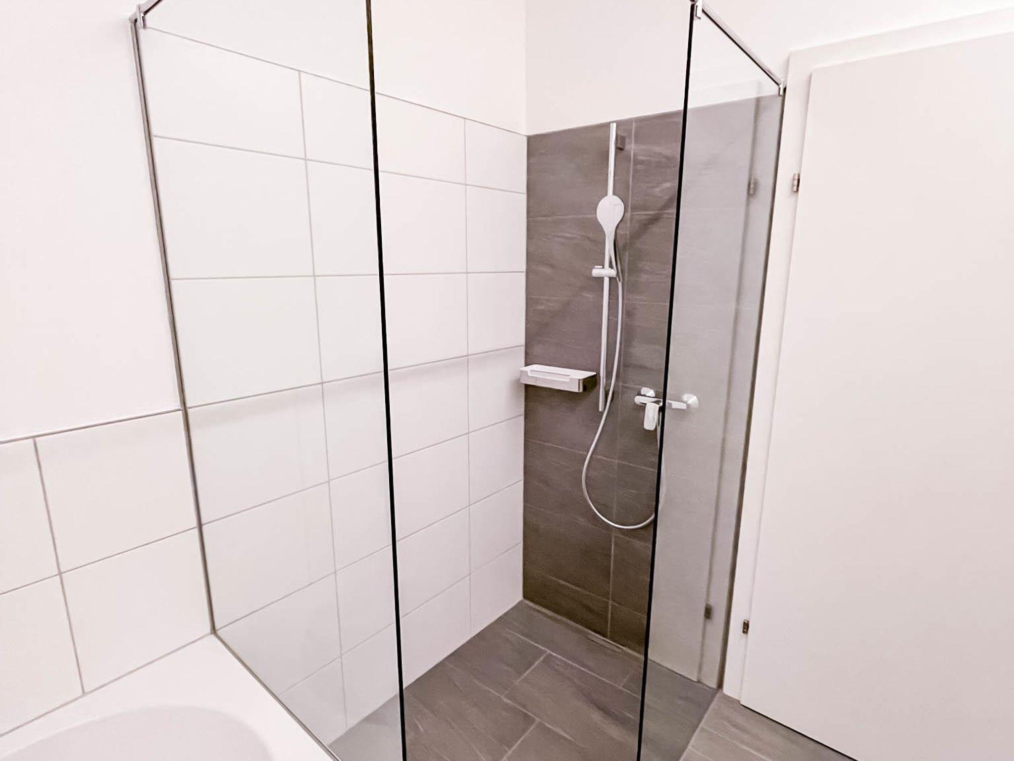 Ein Badezimmer mit Dusche, Badewanne, Fön sowie ein separates WC