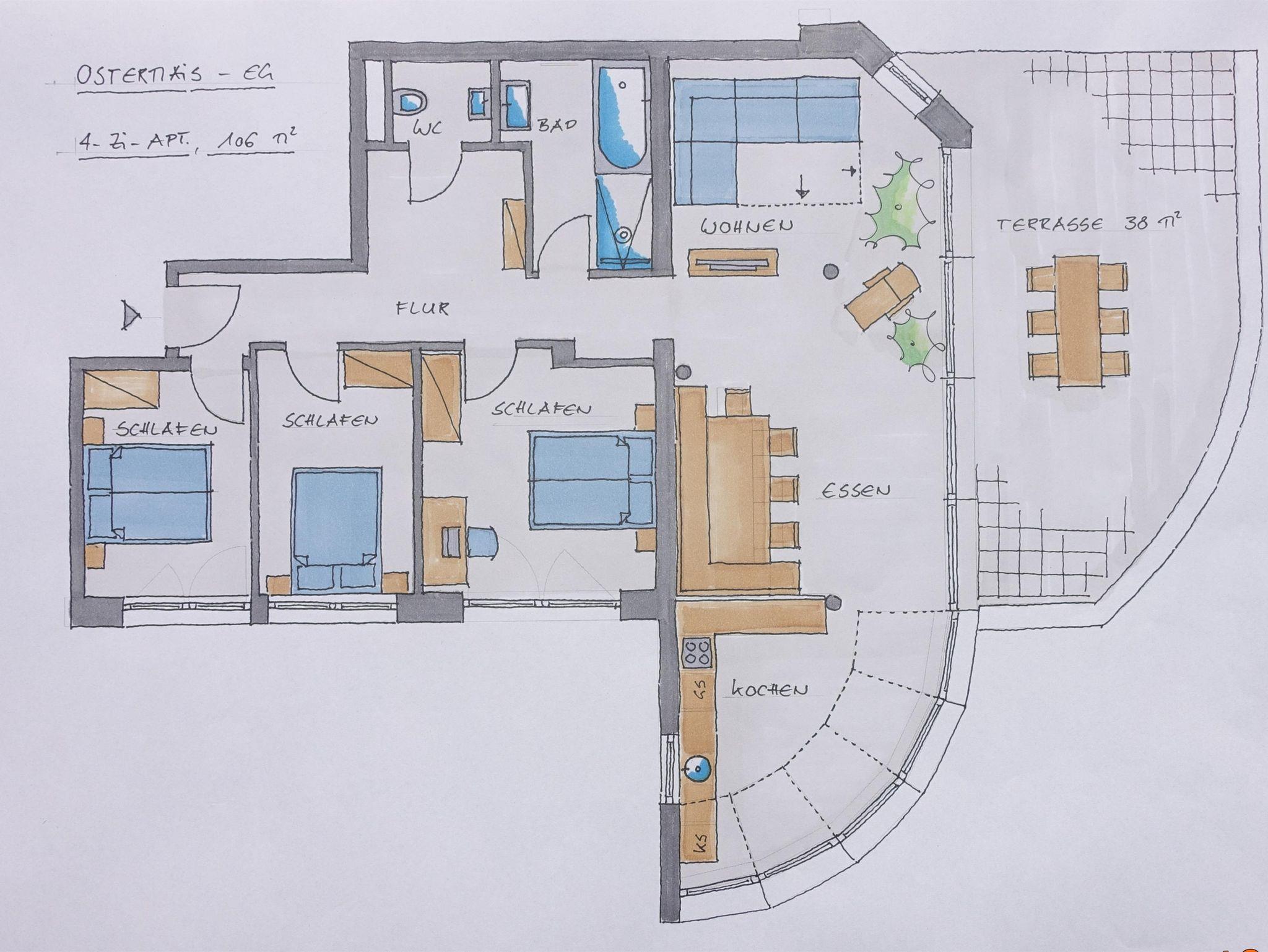 Dieses Appartement im Erdgeschoss ist unser größtes. Es hat eine ca. 3om² Terrasse Richtung Südwesten, grenzt an den Garten mit Kinderspielplatz an. Das Highlight ist der 50 m² große Wintergarten mit wunderschöner Aussicht, vollausgestatteter Küche und großzügigem Wohn- und Essbereich. Ein perfekter Raum zum Wohlfühlen – gemeinsamen Plaudern, Essen und Spielen oder um gemütlich ein Buch zu lesen.