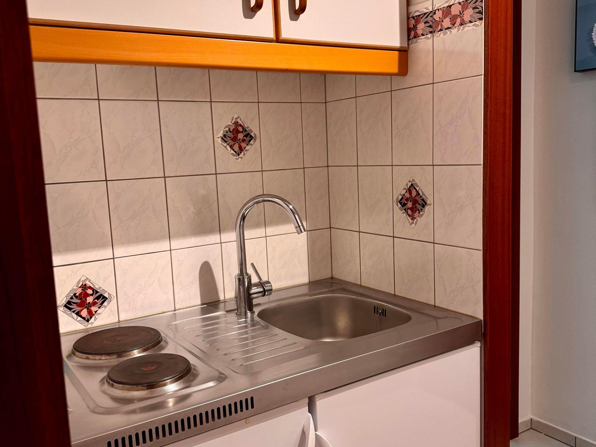 • Küche mit Kühlschrank, Gefrierfach & Mikrowelle