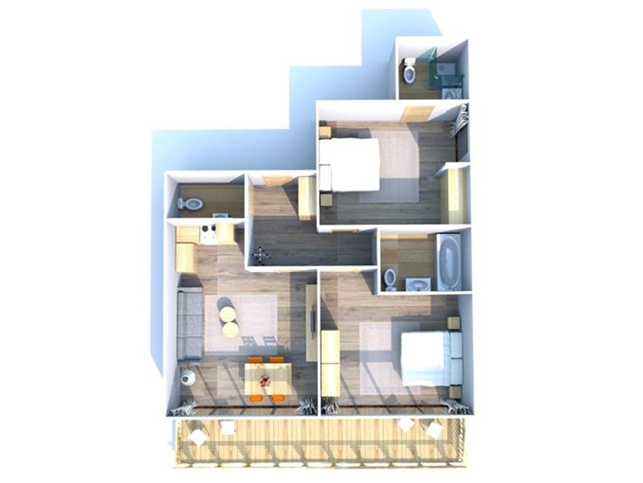 2 Schlafzimmer mit je 1 Doppelbett, Wohn-Schlafzimmer mit Essbereich und Küche (Kochplatte, Backofen, Mikrowelle, Kaffeemaschine, Geschirrspüler, Teekocher, Geschirrset, Kühlschrank mit Gefrierfach), TV, Safe, 2 Badezimmer mit Badewanne oder Dusche und WC, Balkon