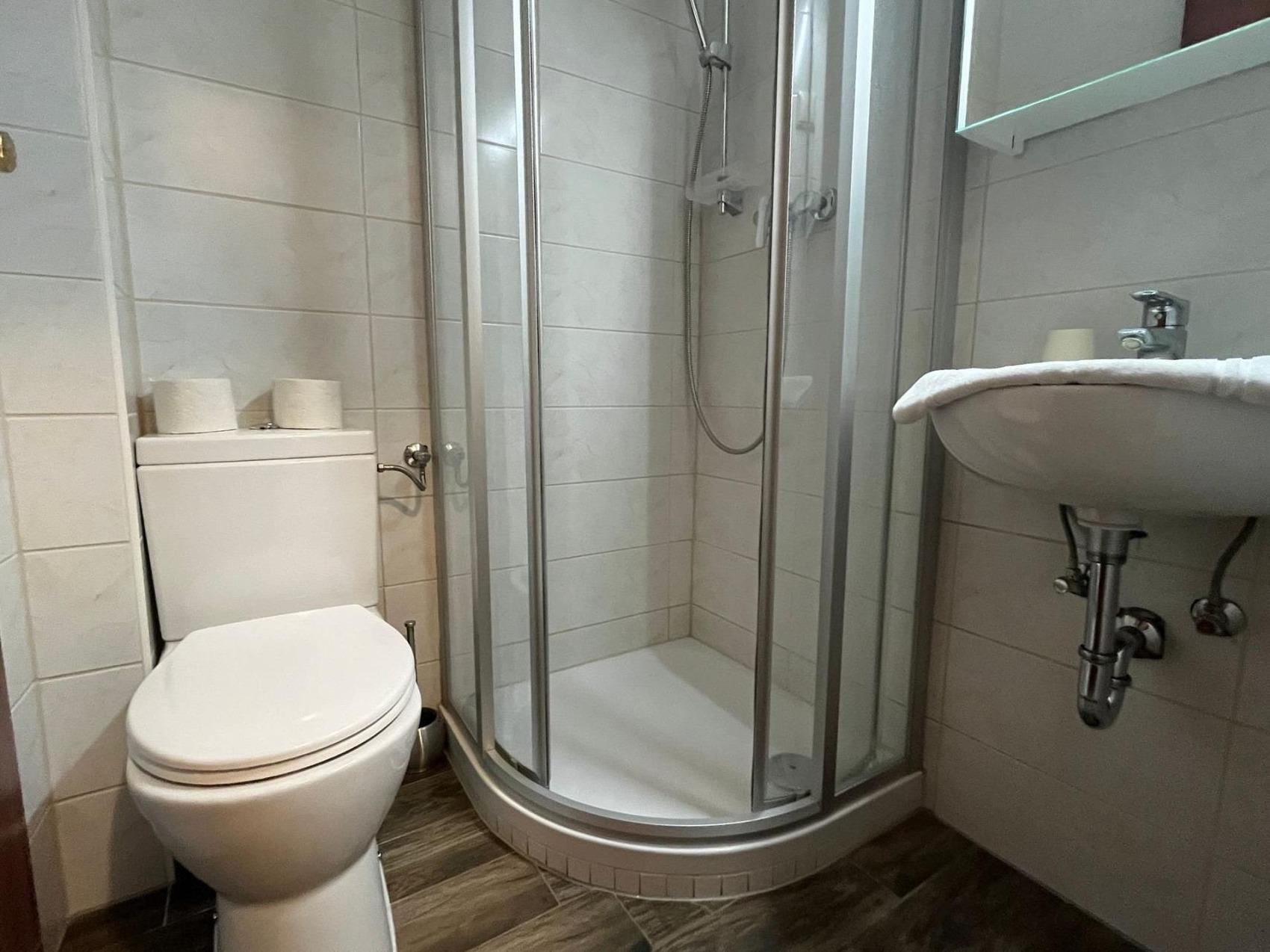 Ihr Einzelzimmer Nr. 011 ist ausgestattet mit einem Einzelbett, TV, WLAN, Duschbad/WC sowie einer Miniküche. Das Pensionszimmer befindet sich auf der Seite einer bverkehrsberuhigten Einbahstraße. Die schalldichten Fenster sorgen für eine angenehme Nachtruhe.