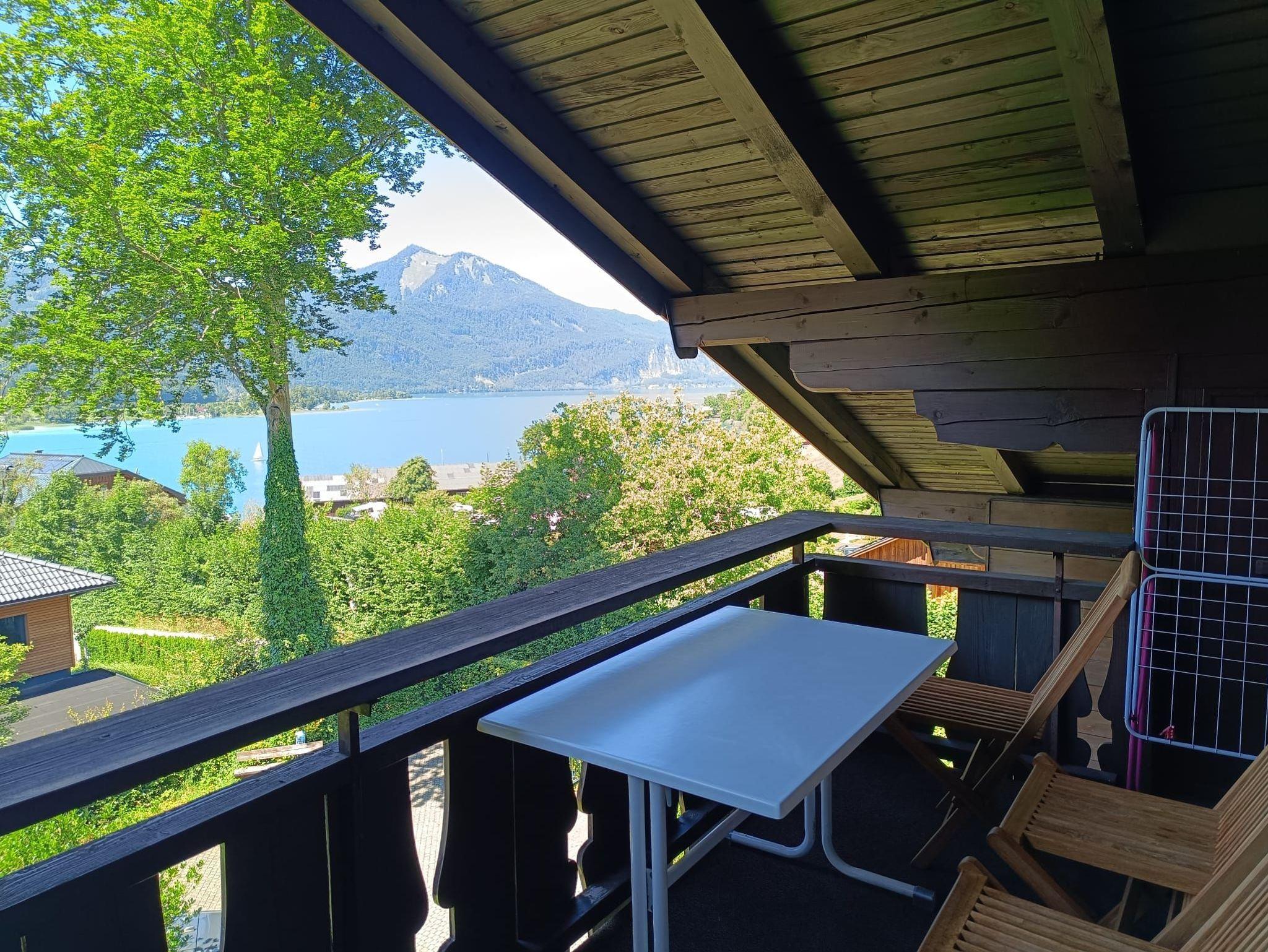 Genießen Sie Ihr Essen draußen von Ihrem wind- und wettergeschützter Panorama-Süd-Balkon mit herrlicher Aussicht auf den Wolfgangsee und die Berge !