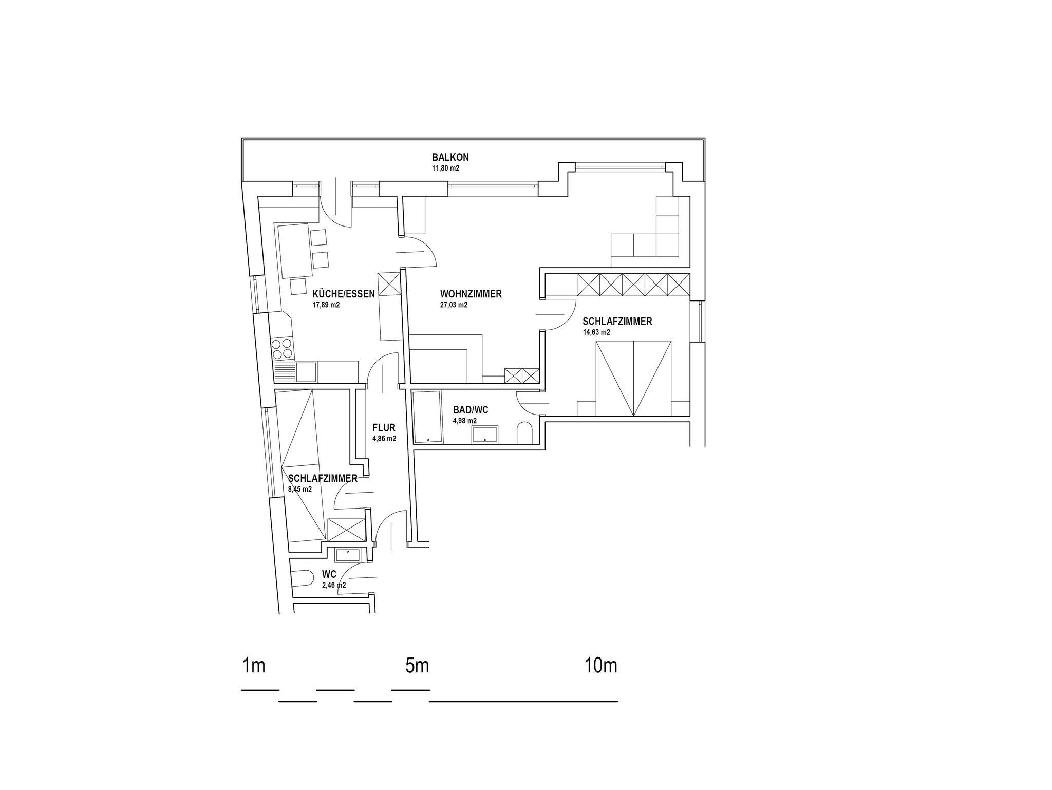 2 Doppelbettschlafzimmer, Badezimmer mit WC, WC extra, Küche, Wohnzimmer und großer Balkon.