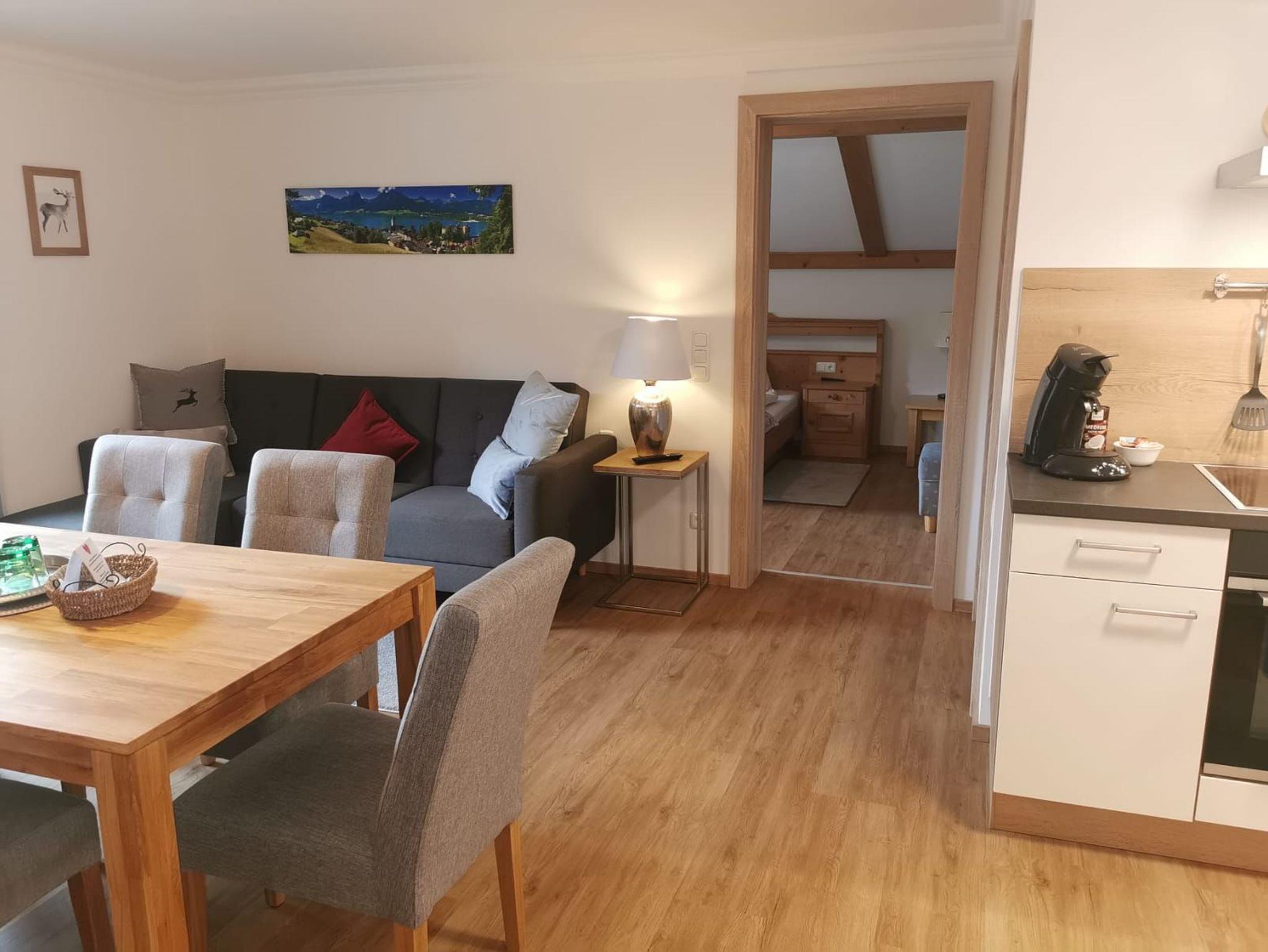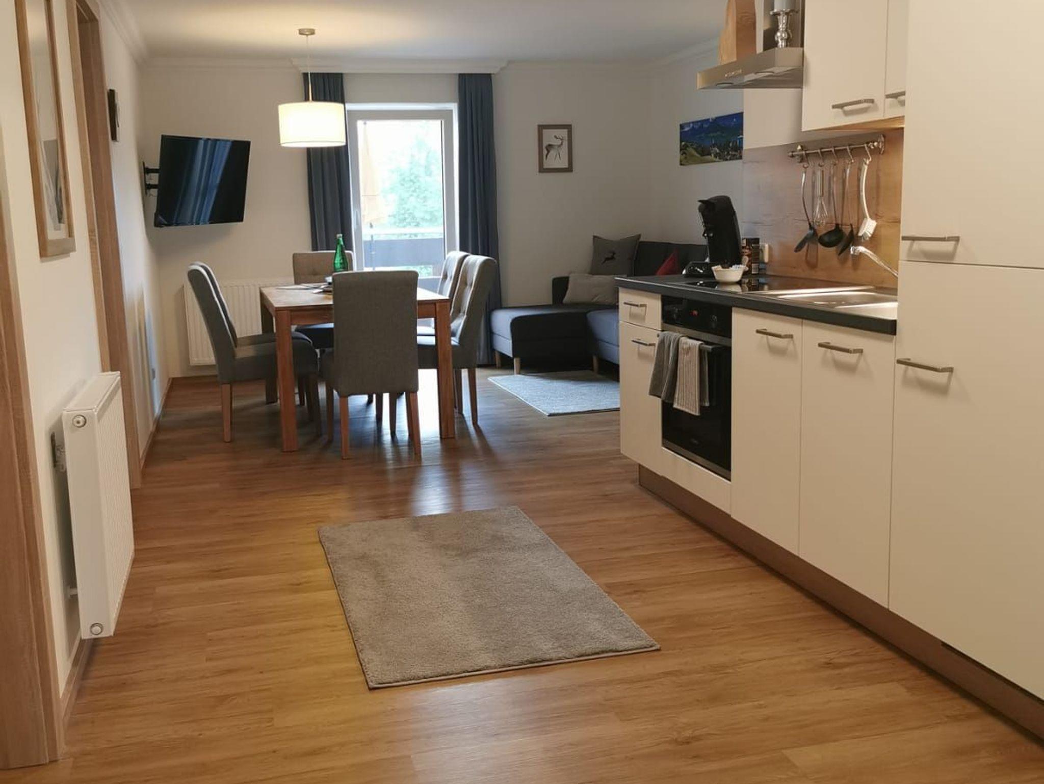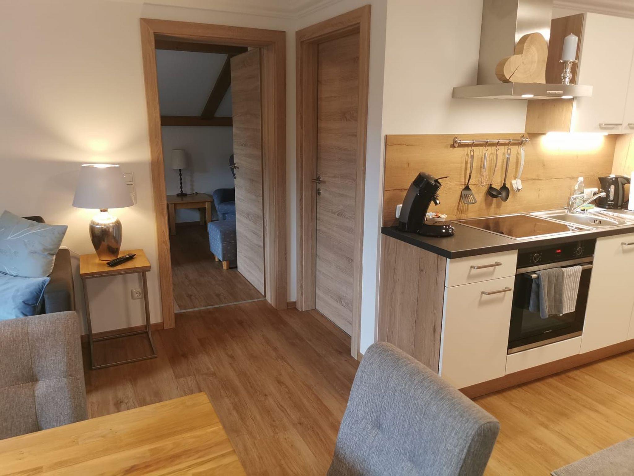 Ihre Unterkunft besteht aus einem Wohnraum mit gemütlicher Sitzecke mit Flat-TV, ausziehbarer Couch und einer Essecke mit Tisch, einer vollständig ausgestatteten Küche mit Herd, Kühl- Gefrierschrank, Kaffeemaschine,