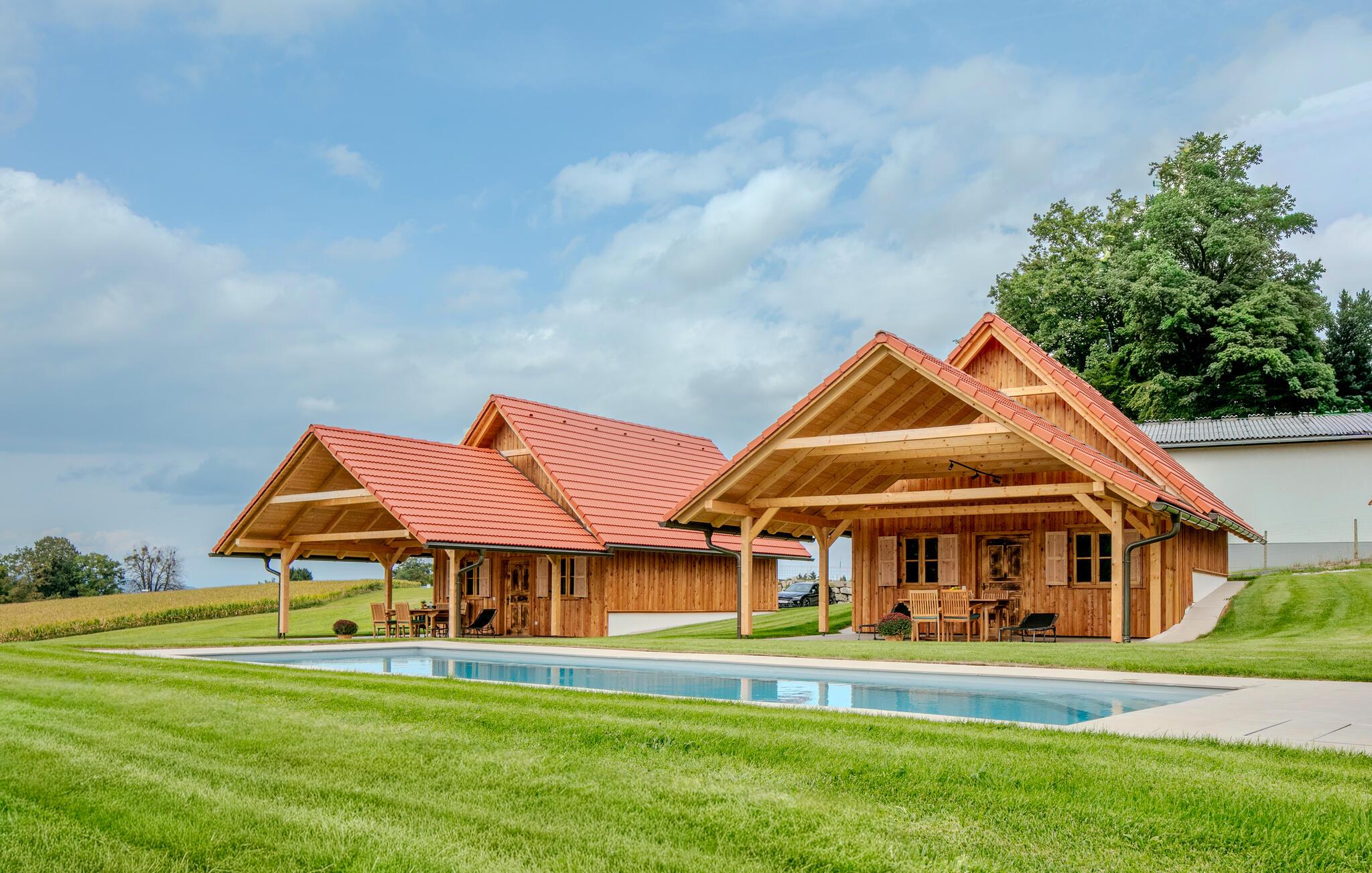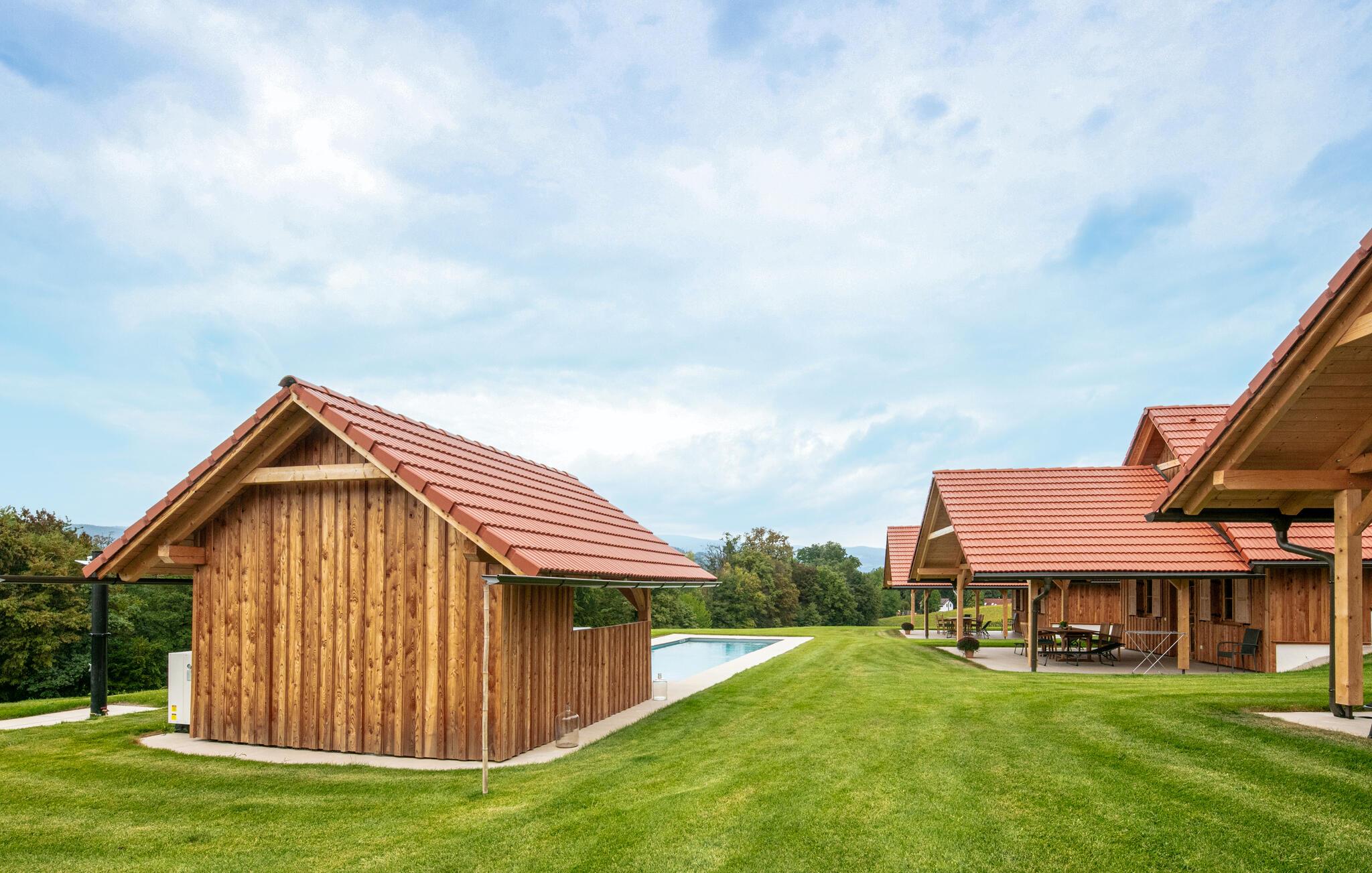 Dyk ned i den forfriskende fælles pool, spil vandpolo eller svøm blot et par afslappende baner. Nyd naturens ro på terrassen med en kop kaffe eller fordyb jer i en god bog. Om aftenen kan I grille bøffer, pølser eller friske grøntsager på den fælles grill, og afslutte dagen med et glas vin i hyggeligt selskab.