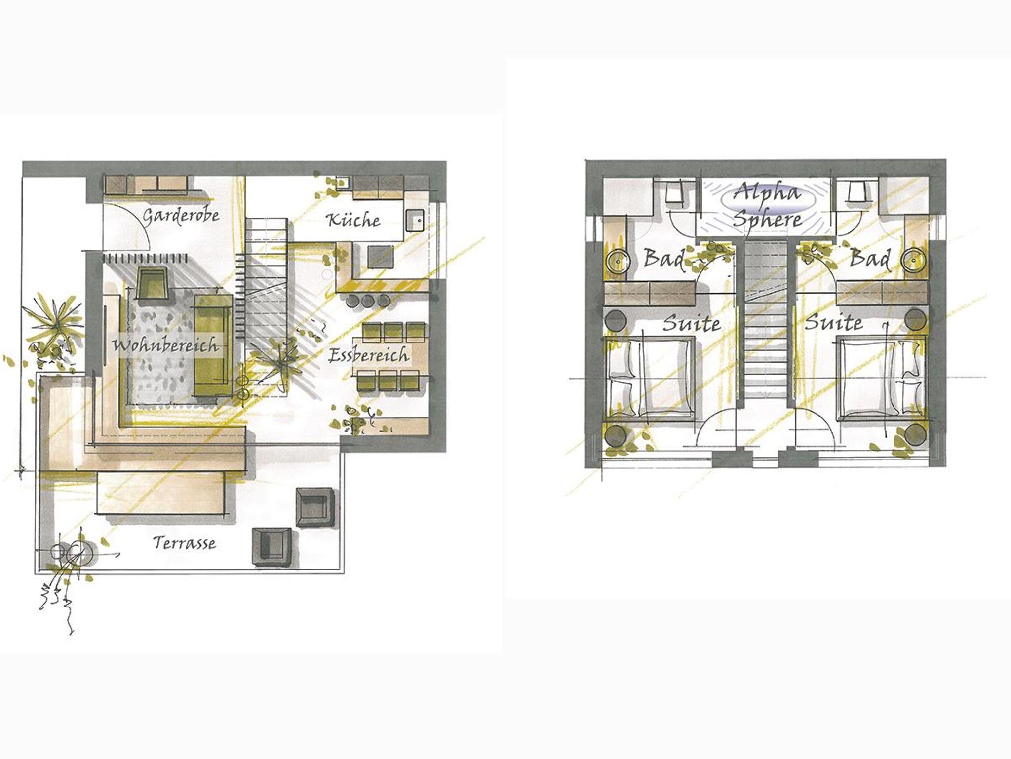 Im Obergeschoss befinden sich zwei identische, gespiegelte Suiten jeweils mit Doppelbett, Fernseher, Schrankbereich, sowie einem Bad mit Dusche.