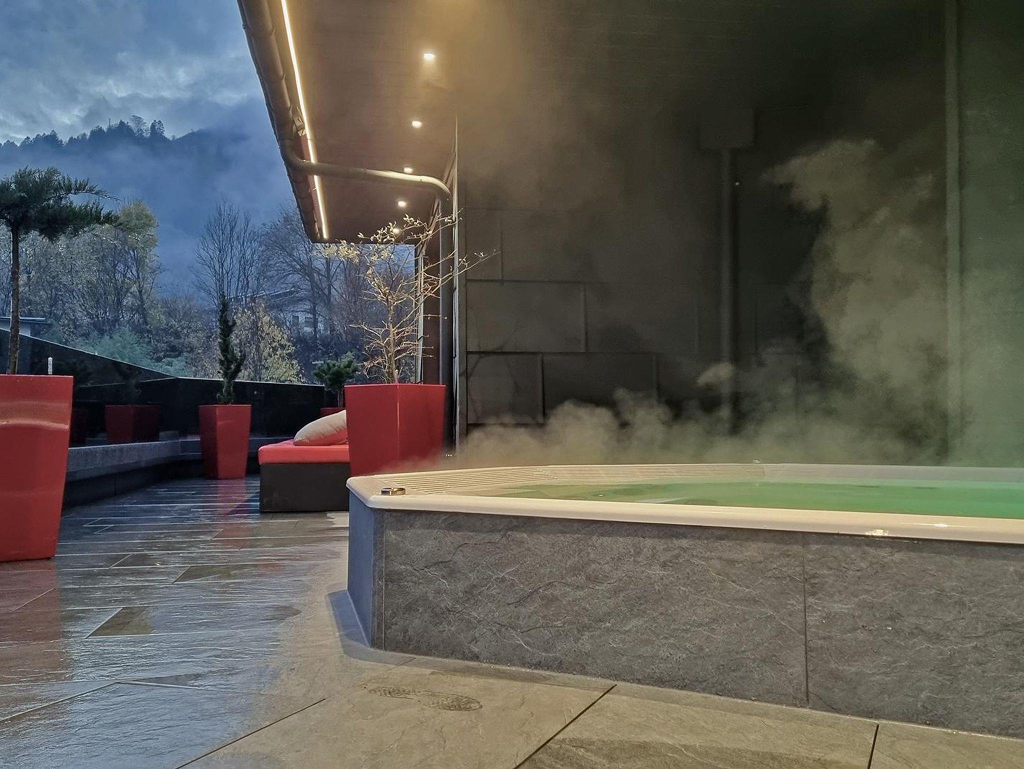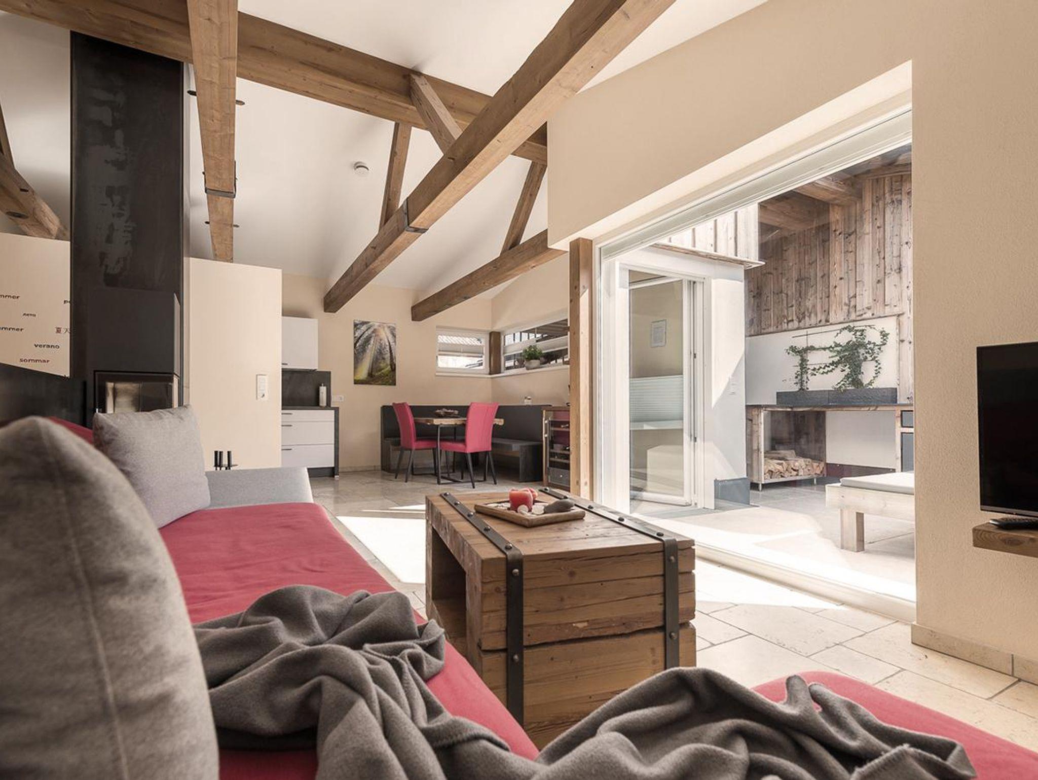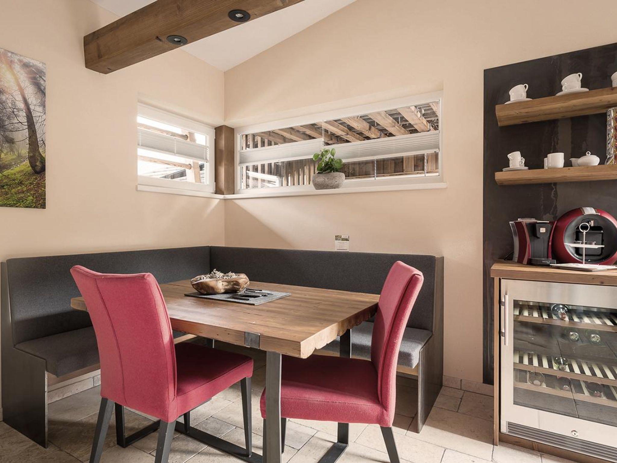 Die große Terrasse bietet zum einen Platz zum Essen im Freien, zum anderen können Sie auf den Liegen entspannen und den herrlichen Ausblick auf die Bergwelt genießen. Darüber hinaus steht Ihnen eine Outdoor-Küche mit Griller und Ceranfeld zur Verfügung.