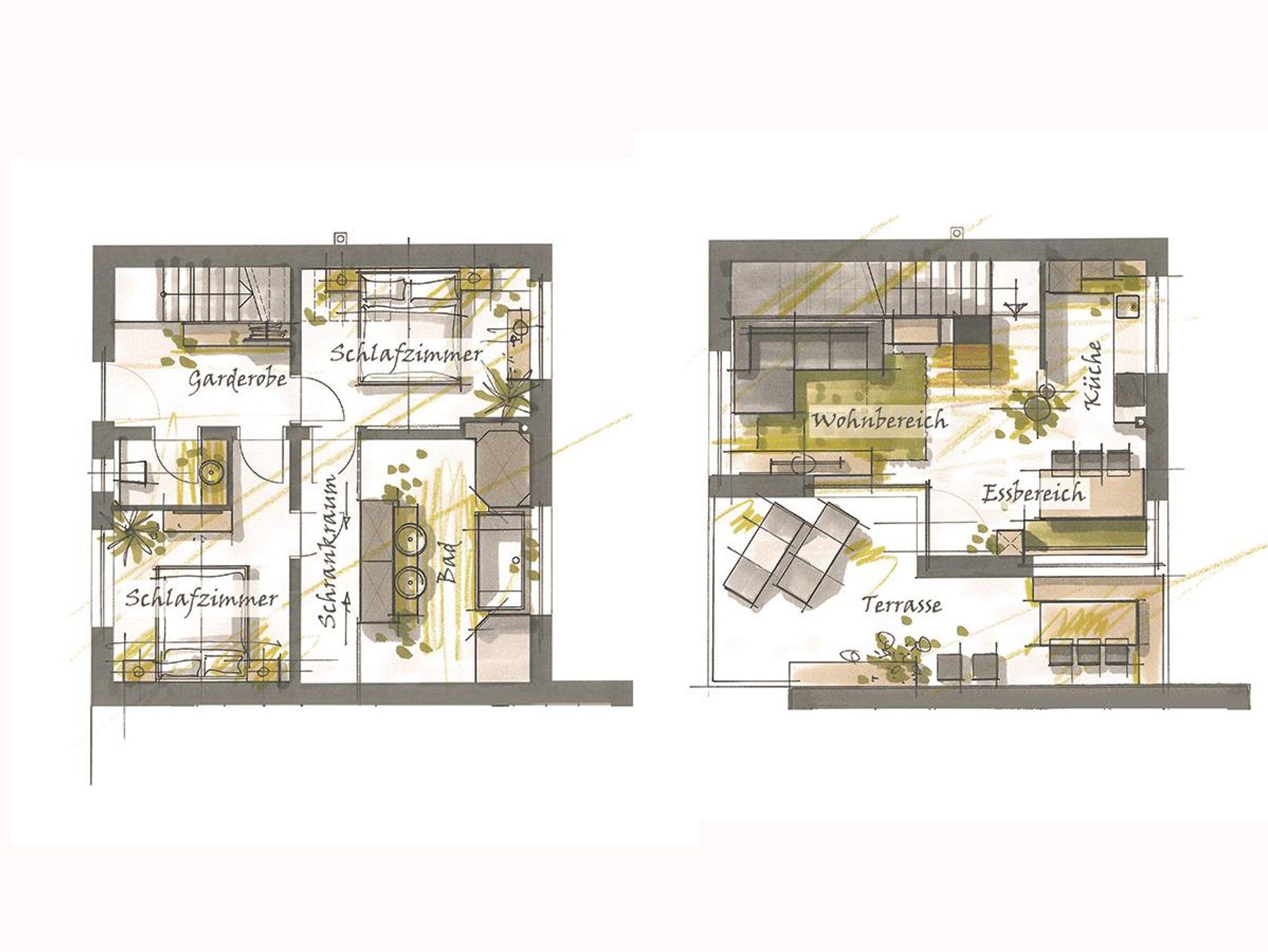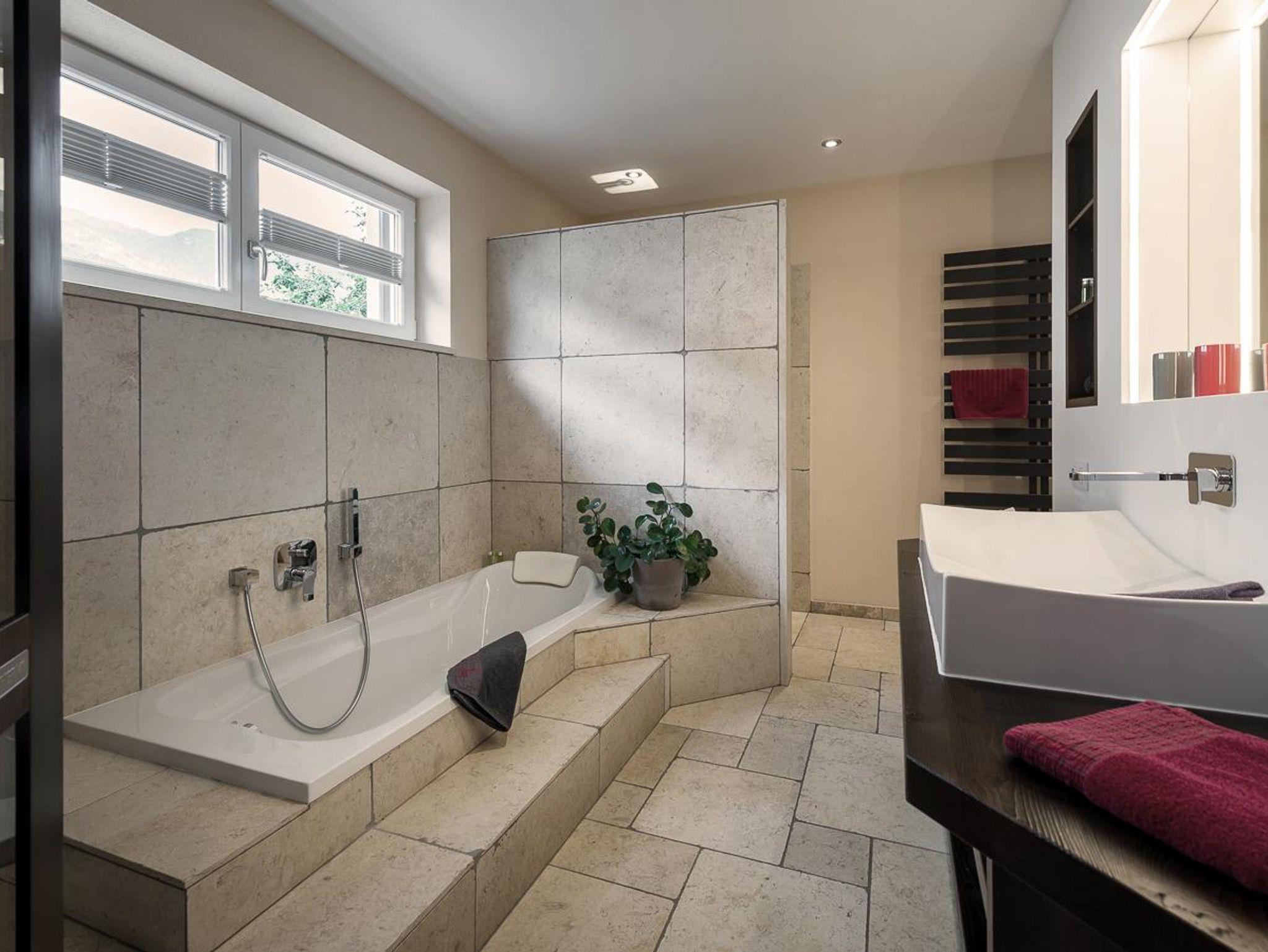 Im Erdgeschoss des Ferienhauses Sandstein liegen die beiden Schlafzimmer, die jeweils mit Doppelbett und Fernseher ausgestattet sind. Der Schrankraum ist von beiden Schlafzimmern aus erreichbar. Über ihn kommt man in das großzügige Bad, das neben einer Dusche und einer Badewanne zusätzlich über eine Infrarot-Kabine verfügt.
