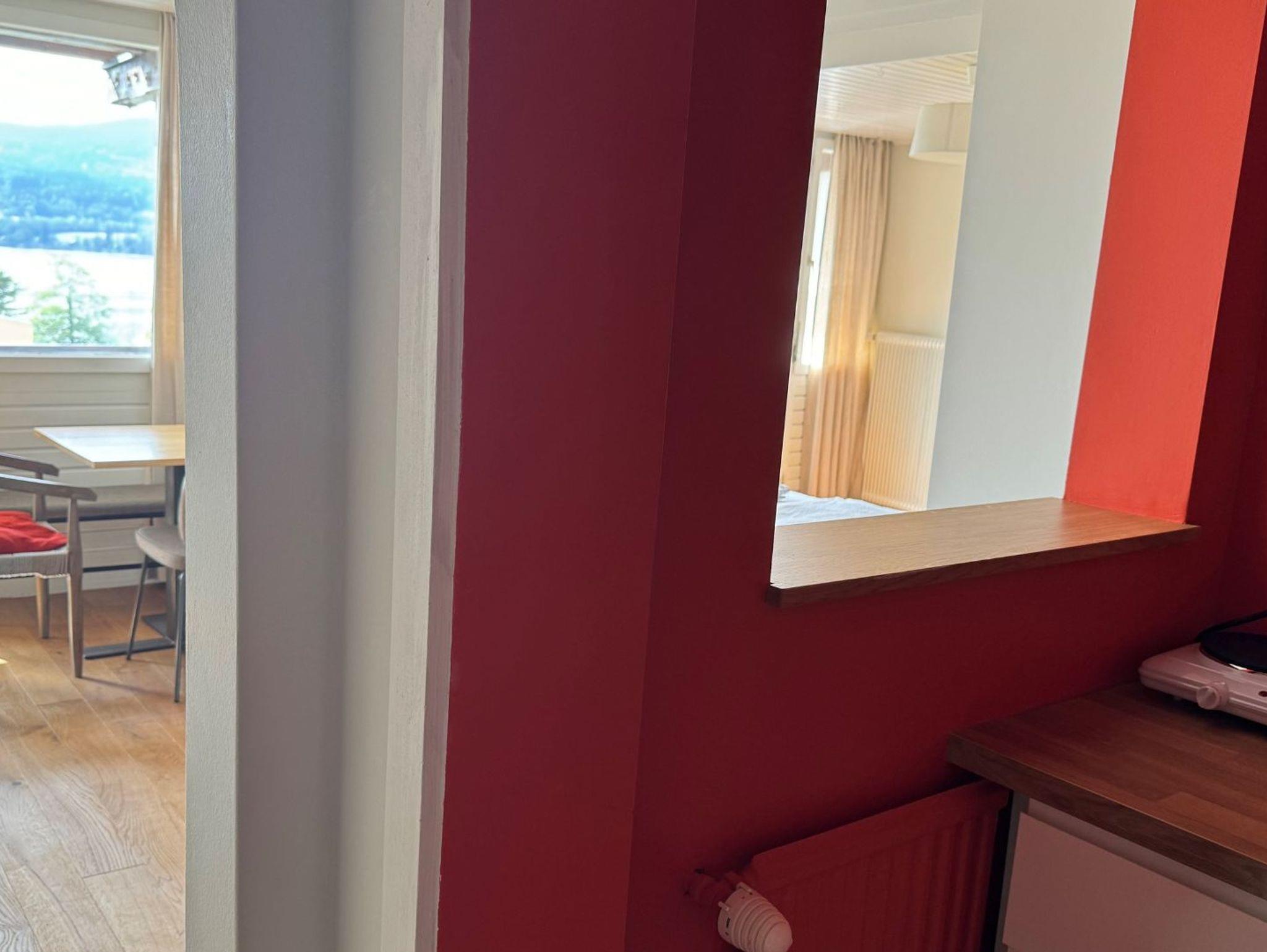 Neue, gemütliche Ferienwohnung mit großem Balkon mit Panoramablick. Schlafzimmer mit Doppelbett und Wohn-Schlafraum mit Essbereich und einer bequemen Schlafcouch. Teeküche mit Kühlschrank und Doppelherdplatte.
