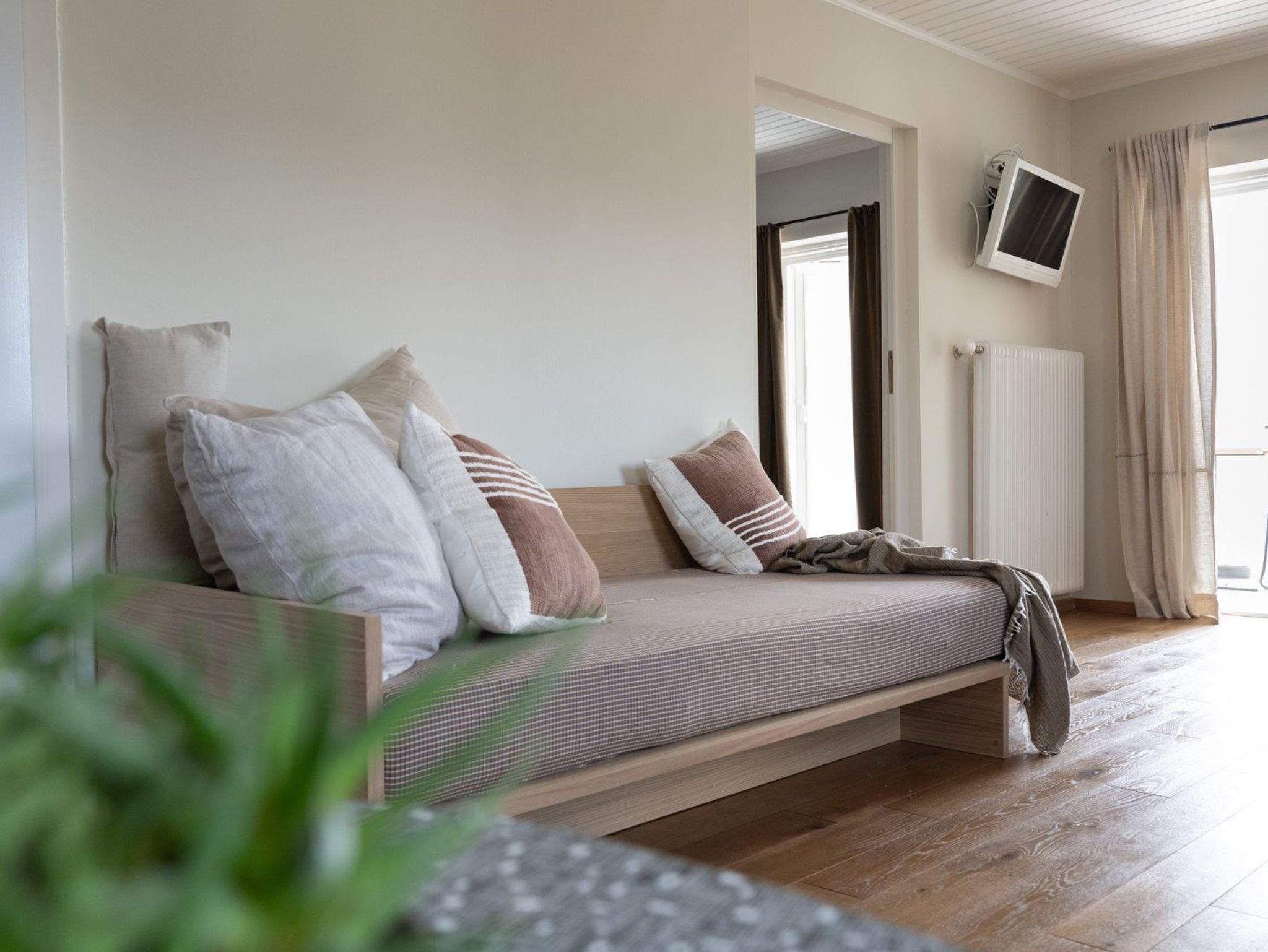 Elf neue, modern ausgestattete Ferienwohnungen, große Wiese für die Gäste direkt vor dem Haus, Frühstücksraum mit Produkten der Bauern aus der Umgebung, ausgewählte Bibliothek.