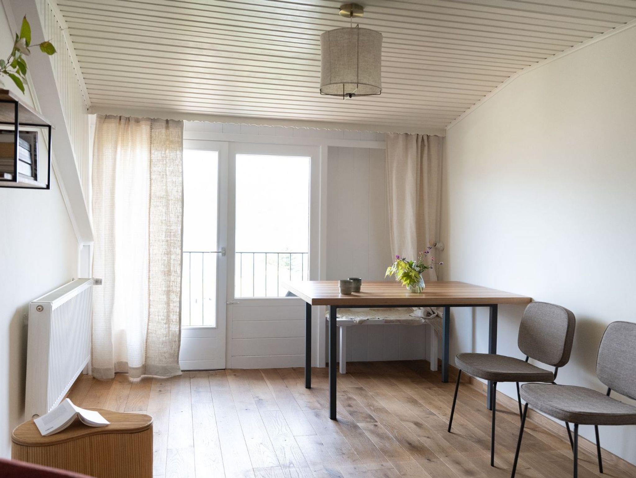 Neue, gemütliche Ferienwohnung mit zwei kleinen Balkon mit traumhaften Seeblick. Schlafzimmer mit Doppelbett und Wohnzimmer mit Essbereich. Teeküche mit Kühlschrank und Doppelherdplatte.