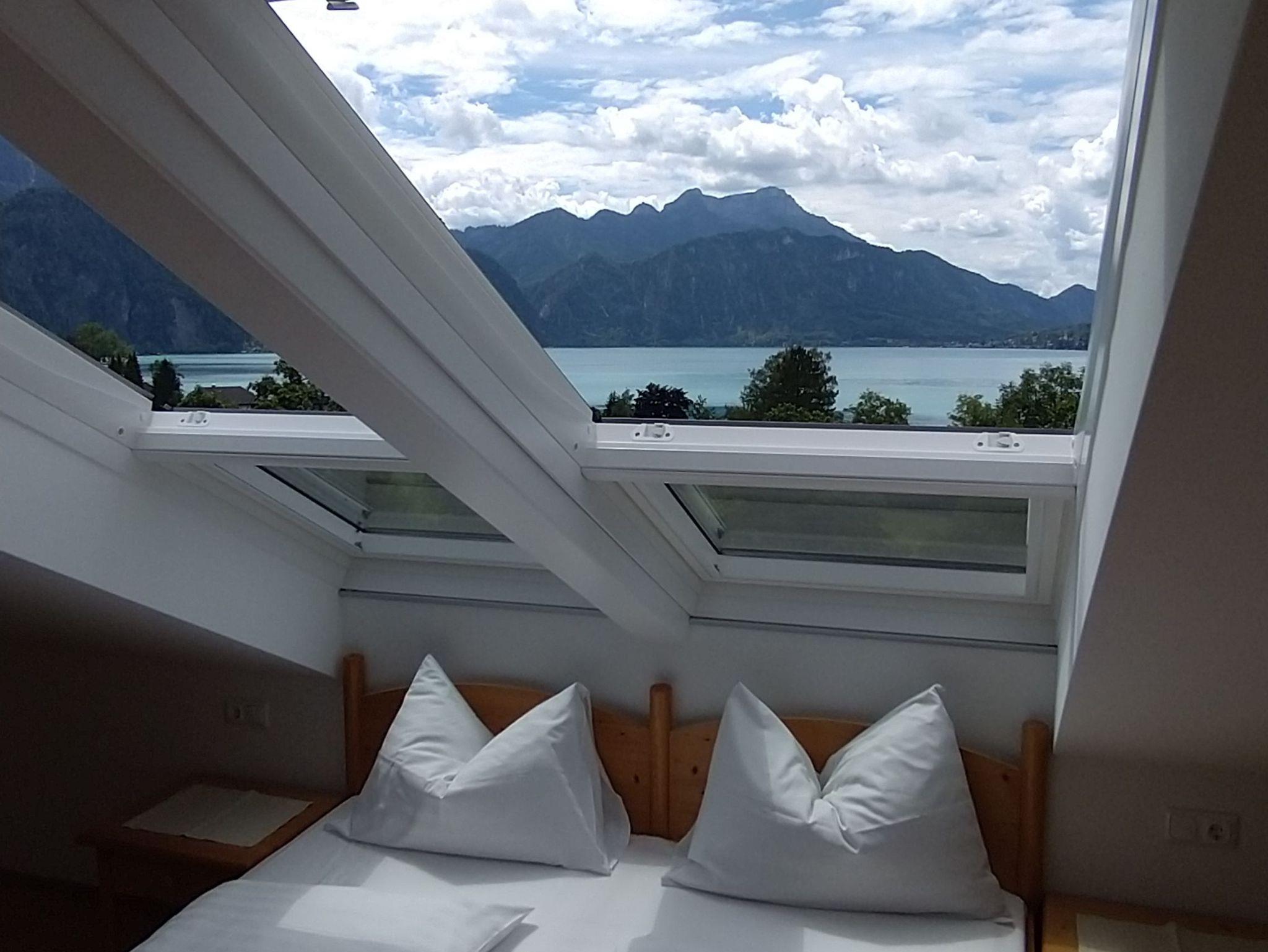 • Balkon mit Blick auf den Attersee und die umliegenden Berge