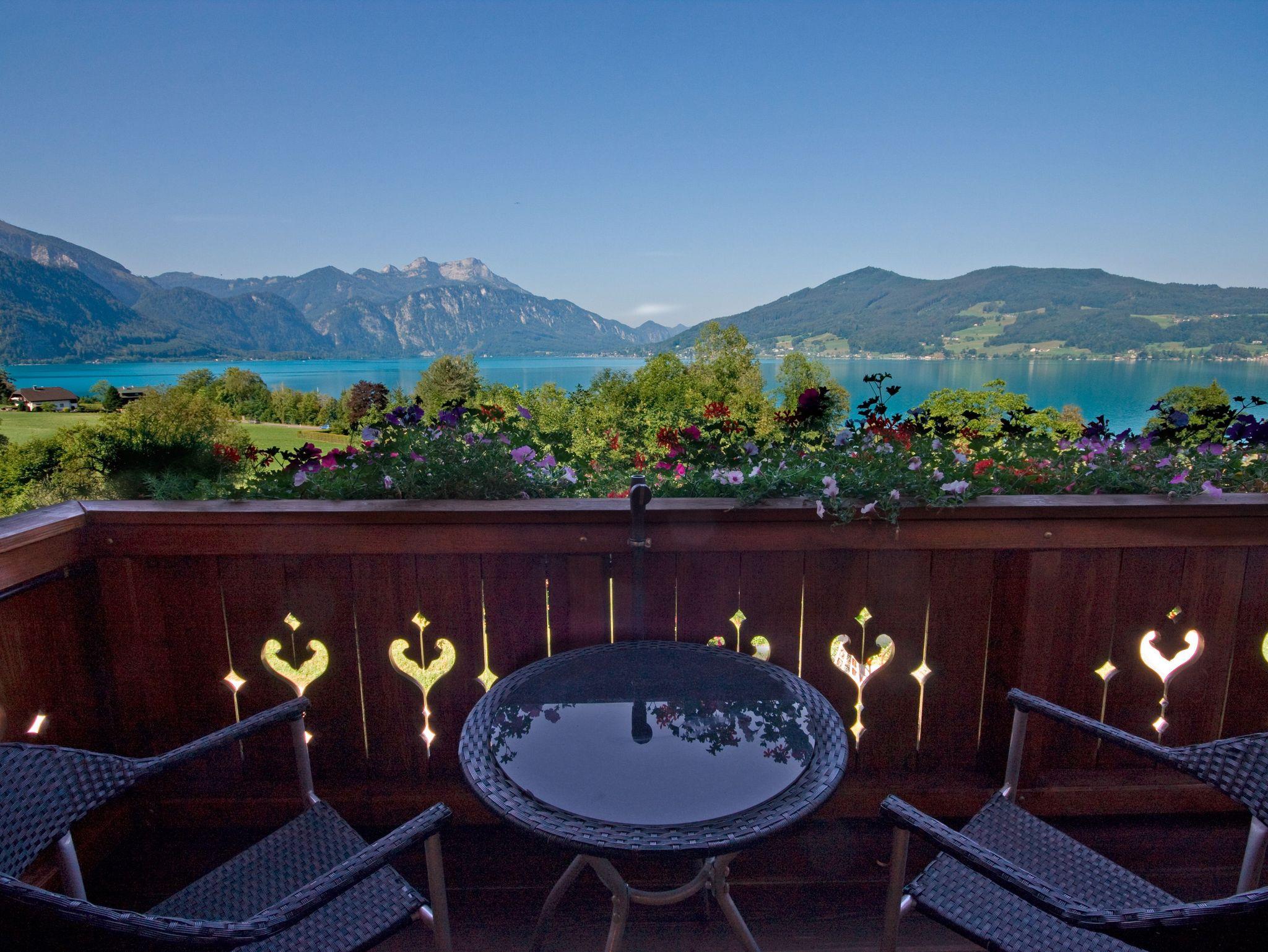 • Balkon mit Blick auf den Attersee und die umliegenden Berge