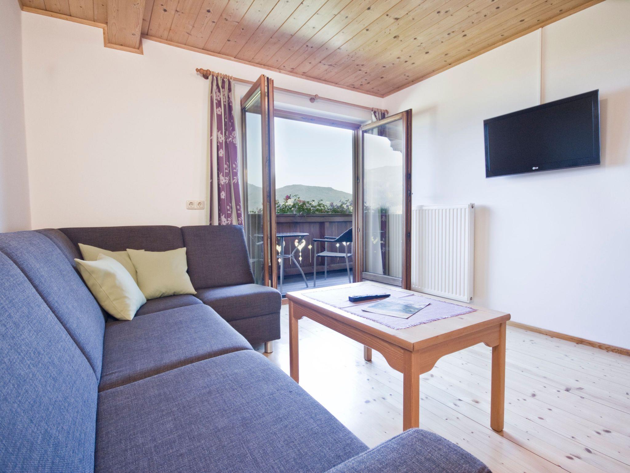 • Wohnzimmer mit Schlafcouch, SAT-TV und Zugang zum Balkon