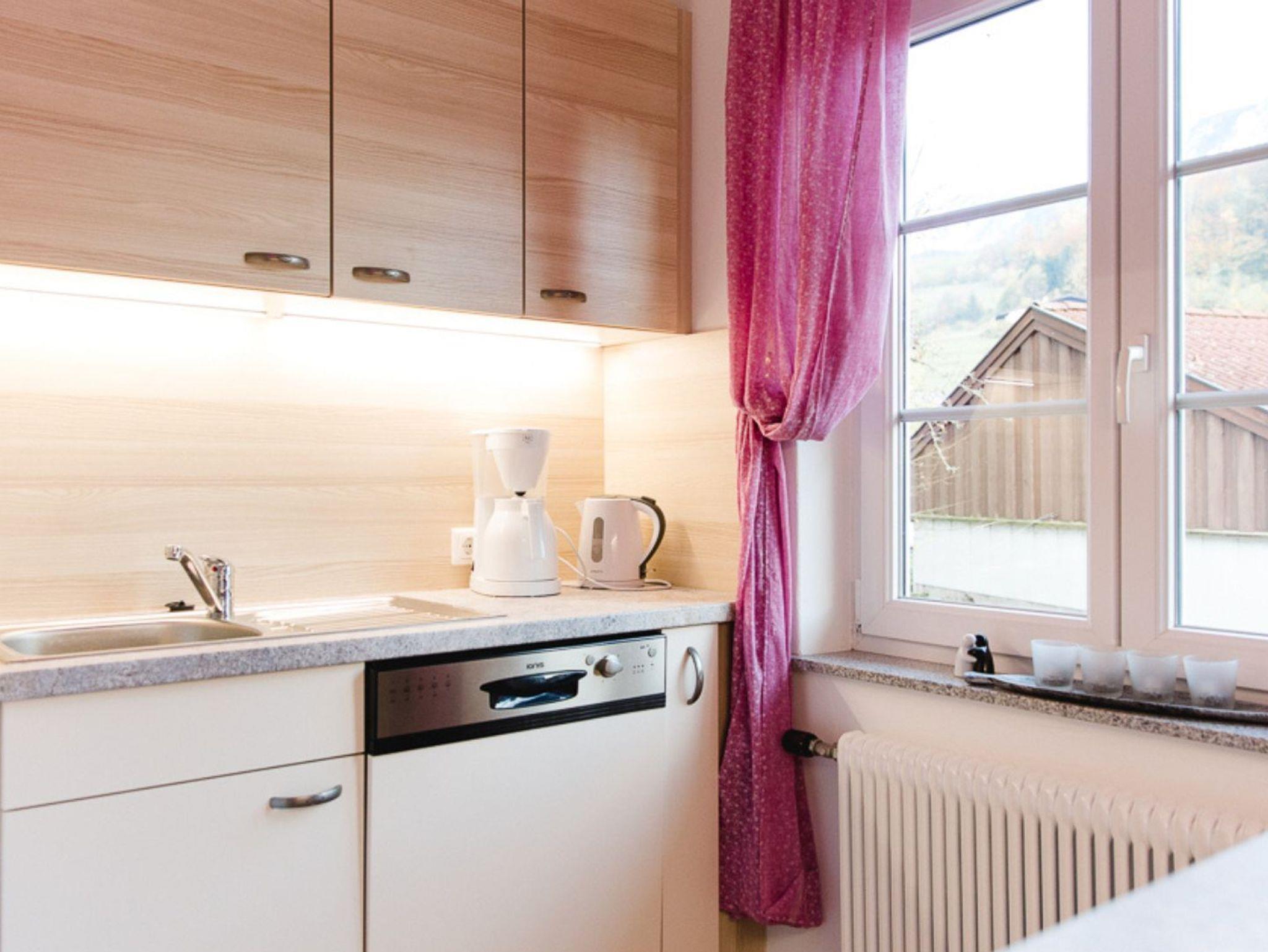 Helle und moderne Ferienwohnung im 1. Stock mit Seeblick vom Wohnzimmer und Schlafzimmer. Das großzügige Schlafzimmer verfügt über ein Doppelbett, die offene Wohnküche ist gut ausgestattet, zusätzlich gibt es ein Bad mit WC und einen Balkon mit Seeblick.