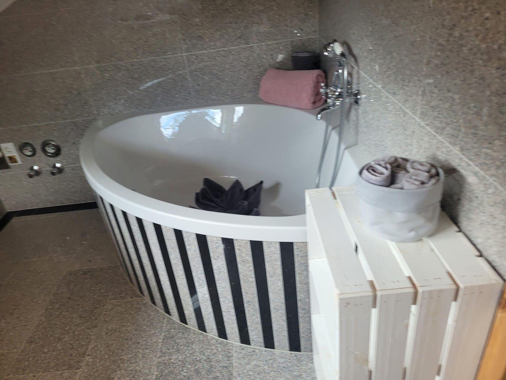 • Badzimmer: abgetrennt - mit großer Eckbadewanne, WC, Waschbecken, Handtücher, Badetücher, Föhn