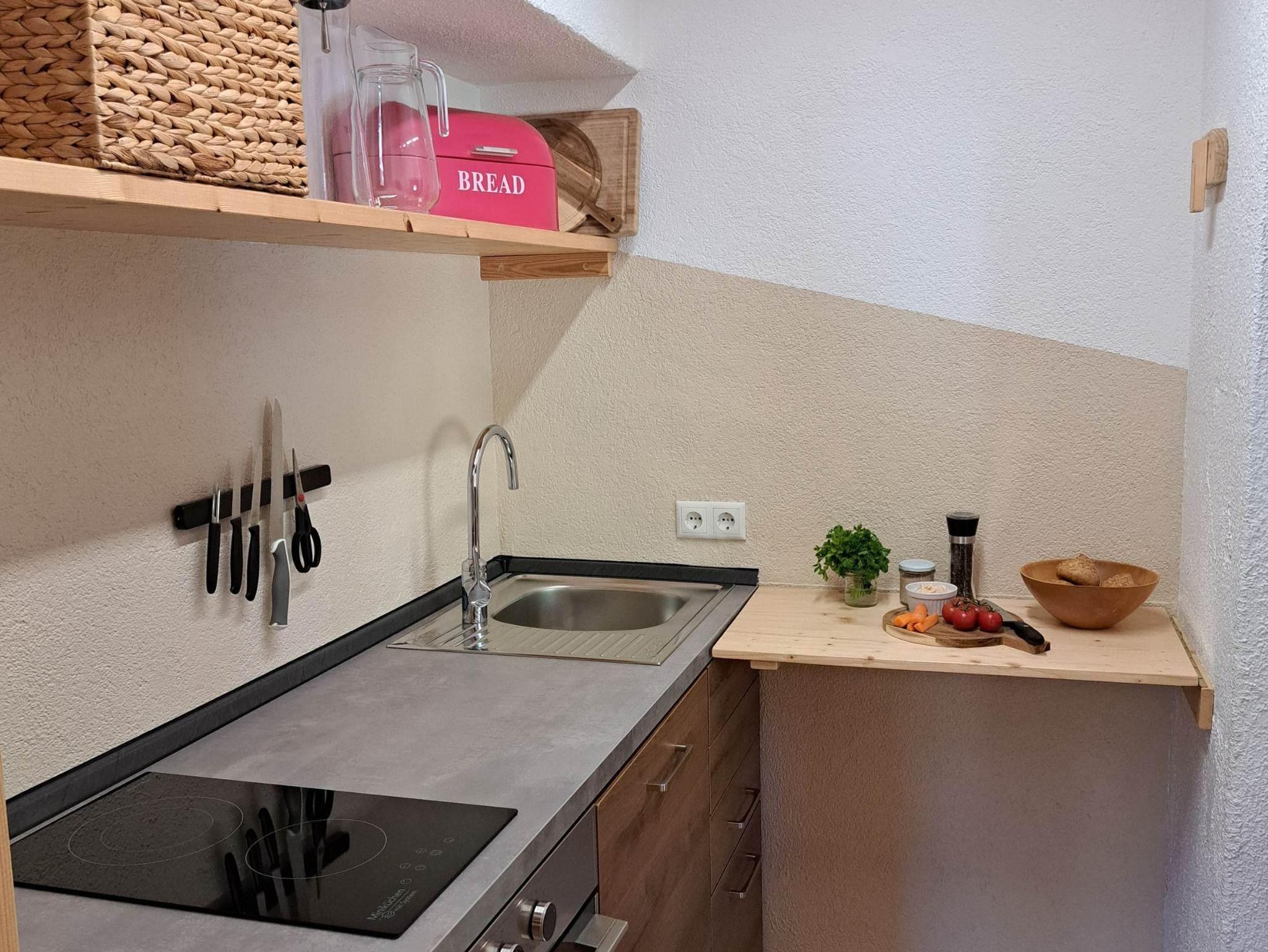 Die Küche liegt seitlich des Wohnbereichs hinter dem Torbogen und ist voll ausgestattet mit Spülmaschine, Backofen und 2 Zerankochplatten und allem, was man zum Kochen braucht.