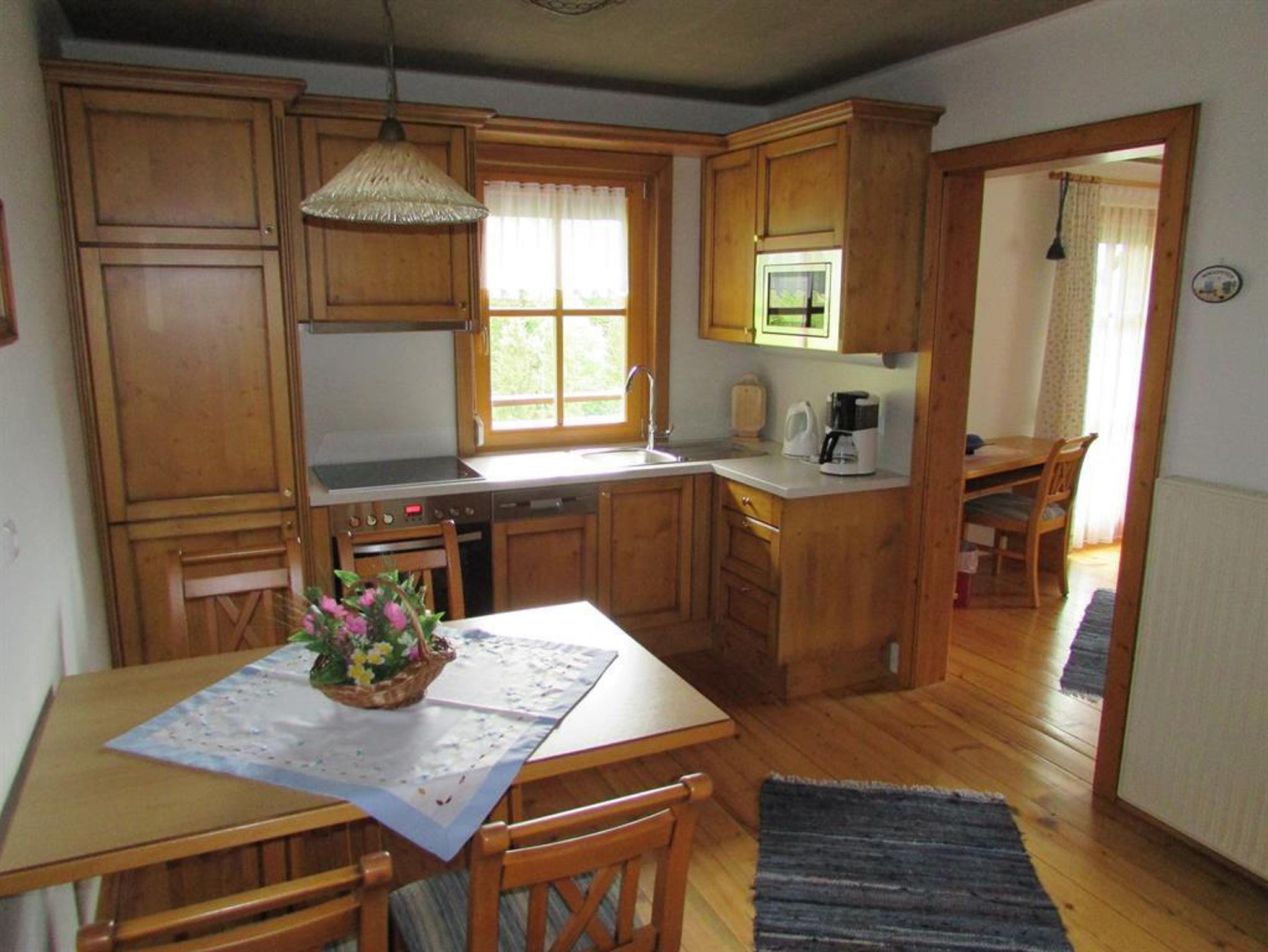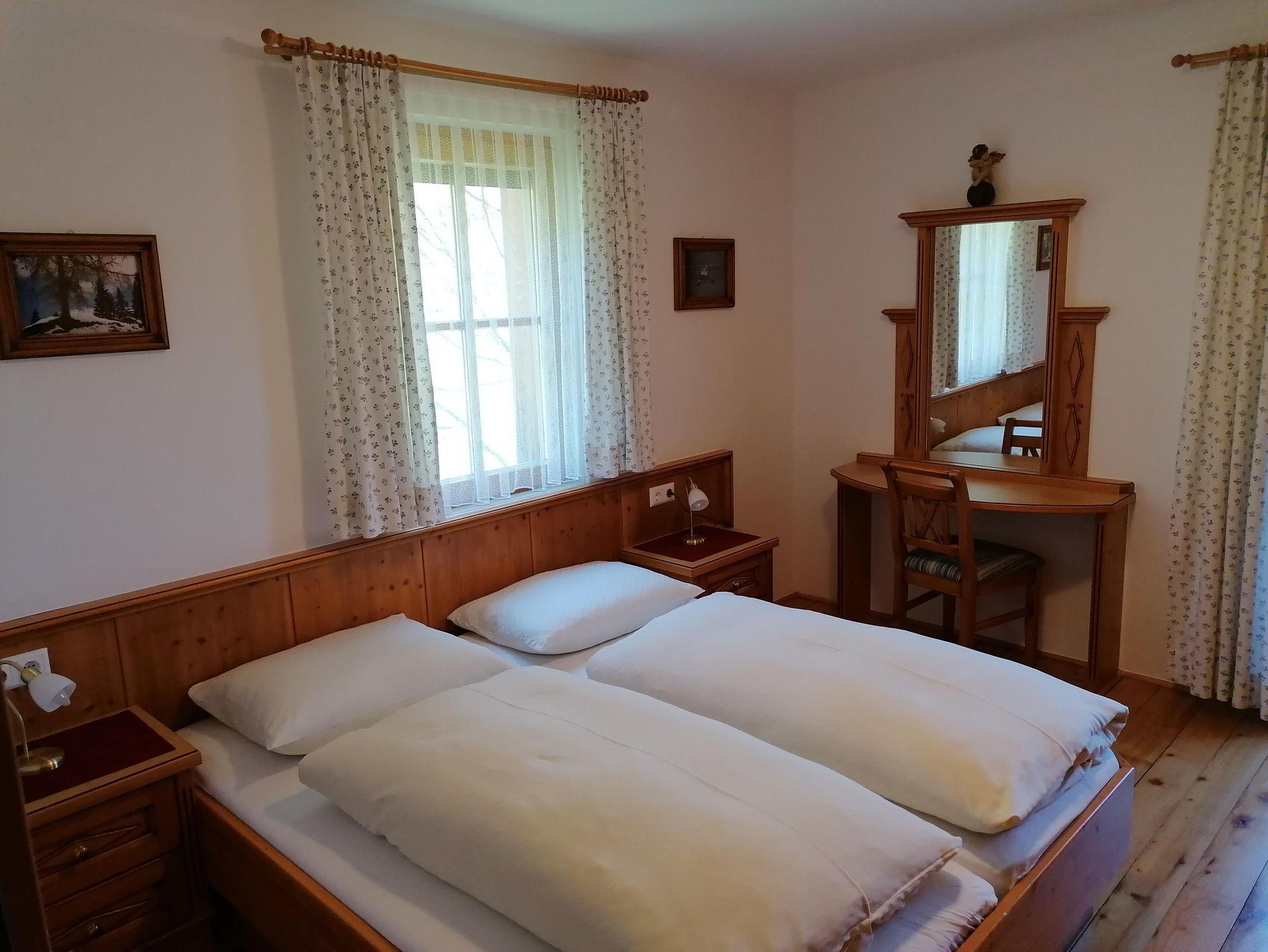 80 m2 Wohnfläche im 1. Stock laden ein zum Wohlfühlen. Die Ferienwohnung bietet Platz für 2 bis 4 Personen und ist ausgestattet mit Fichtenholzmöbeln und Holzböden, kleine Wohnküche mit Kühlschrank, Mikrowelle, Kaffeemaschine, Wasserkocher, E-Herd mit Backrohr, Geschirrspüler, extra Wohnzimmer mit gemütlicher Sitz-Couch, Flachbildschirm mit SAT-TV, Radio, gratis W-LAN, 2 getrennte Doppelbettzimmer, Badezimmer mit Badewanne und Dusche und WC getrennt, Fön, großer Balkon nach Osten, Süden und Westen mit Sitzgelegenheit und Hängesessel.