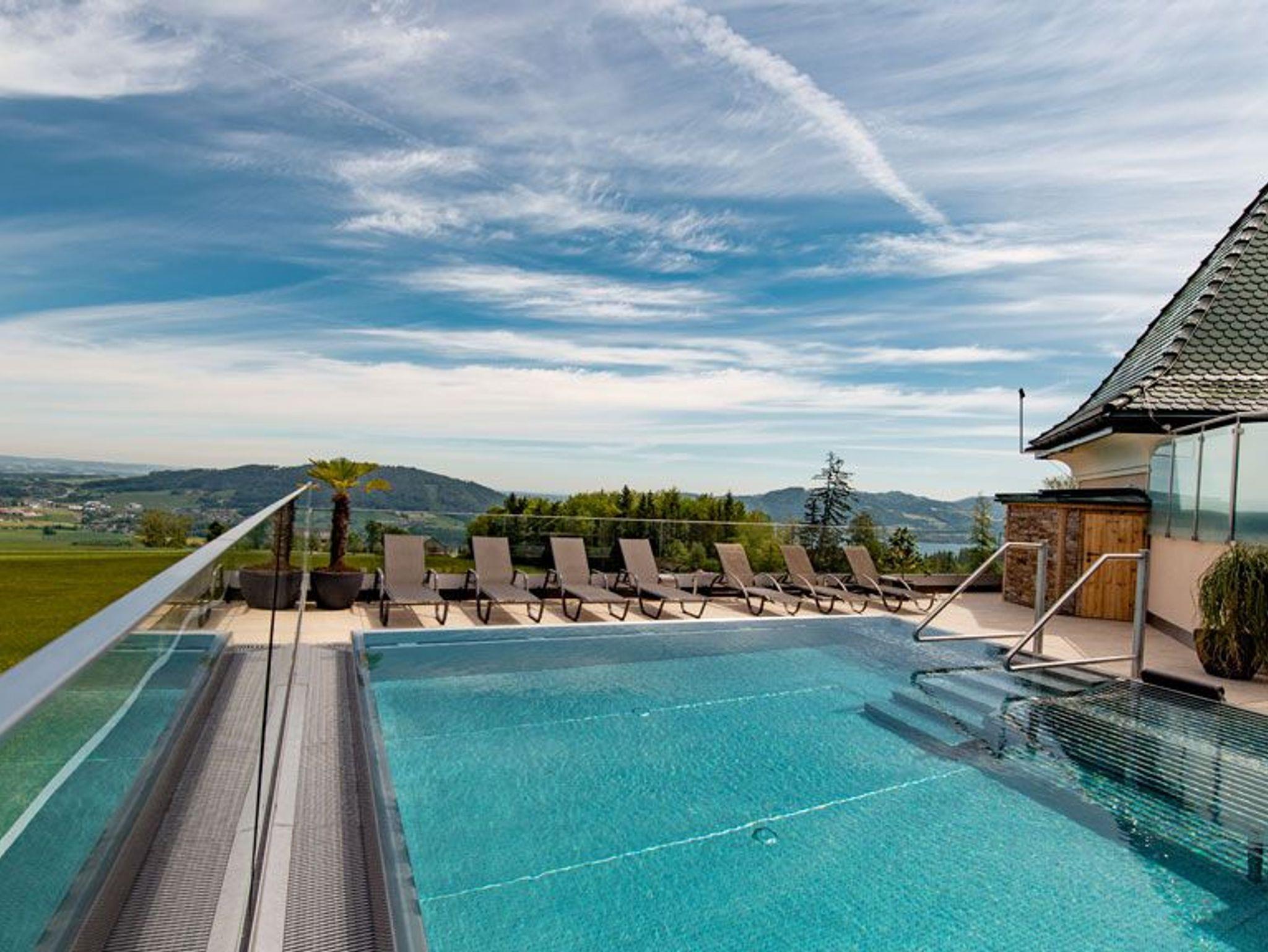 NEU ab 2021 ist der neue Infinitypool auf der Dachterrasse im Hotel Irmgard. Rund 10 Meter lang und 5 Meter breit umfasst das rund 1,40 Meter tiefe beheizbare Becken. Hotelgäste dürfen sich auf ein beheiztes Badevergnügen im Infinitypool mit Panoramablick samt Atterseeblick freuen, welcher direkt vom Lift aus zu erreichen ist. Für Entspannung nach dem Schwimmen sorgen die neuen Ruhebereiche, Outdoor beim Pool sowie Indoor samt Schwebeliegen. Zusätzlich können sich die Gäste in den neuen Massageräumen von Heilmasseurin Sophie Pernetstätter verwöhnen lassen.