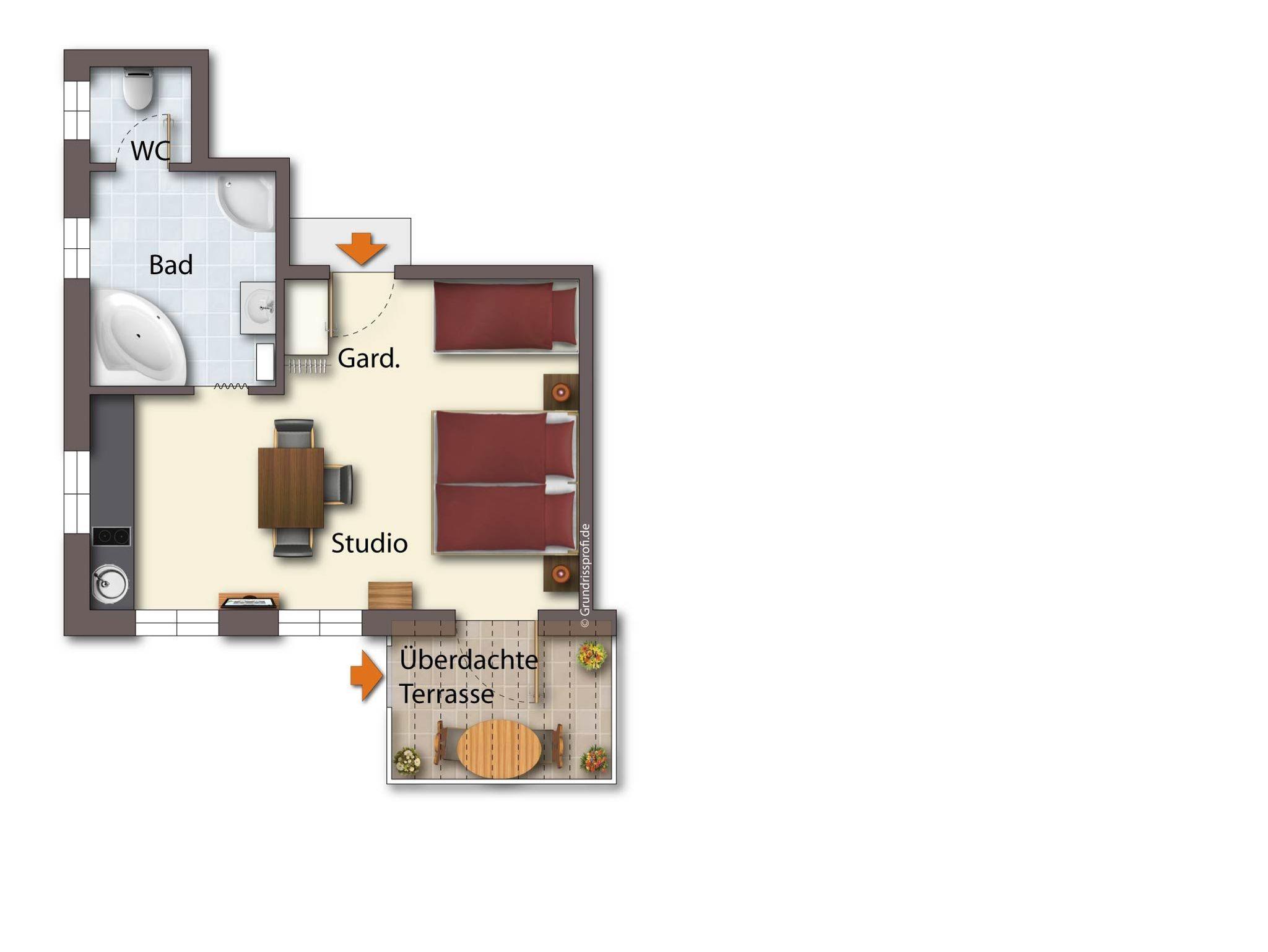 Eine großzügig ausgestattete Ferienwohnung VENEZIA im Erdgeschoß mit Whirlpool im Badezimmer und einer überdachten Terrasse.