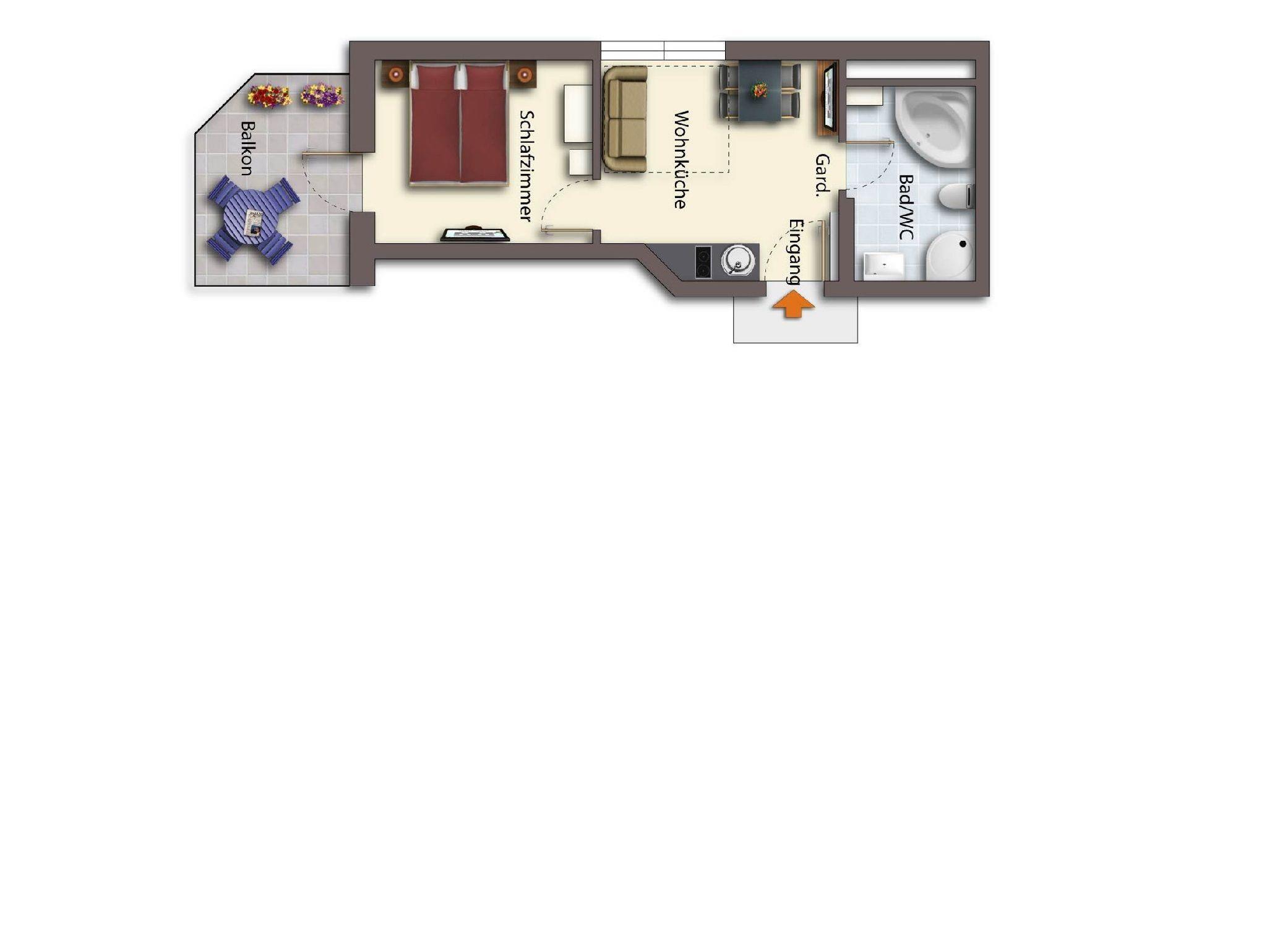• 1 Schlafzimmer mit einem bequemen Doppelbett und einem großen Flat -TV sowie kostenloses SKY-TV mit zahlreichen Sport- u. Filmprogrammen.