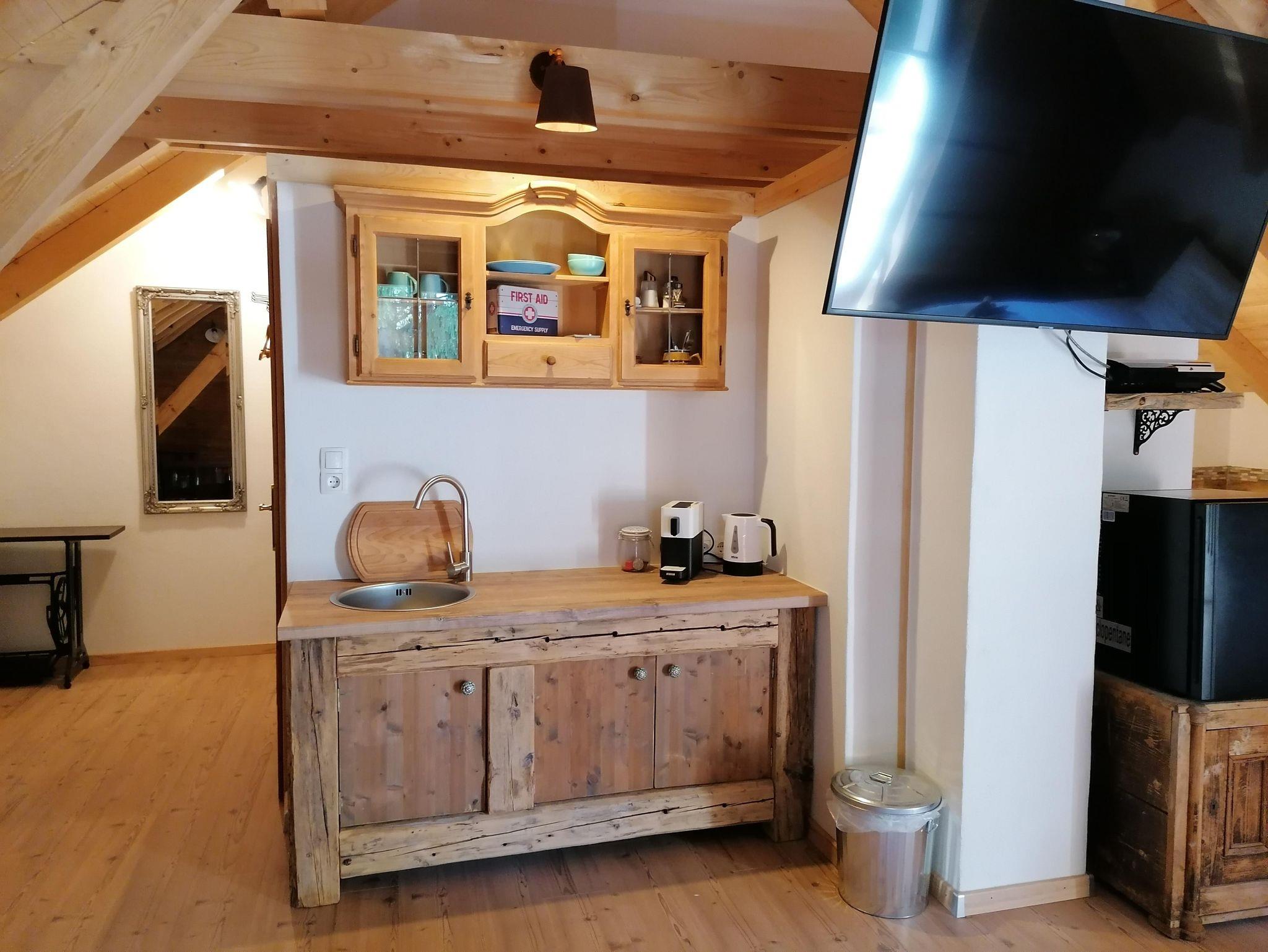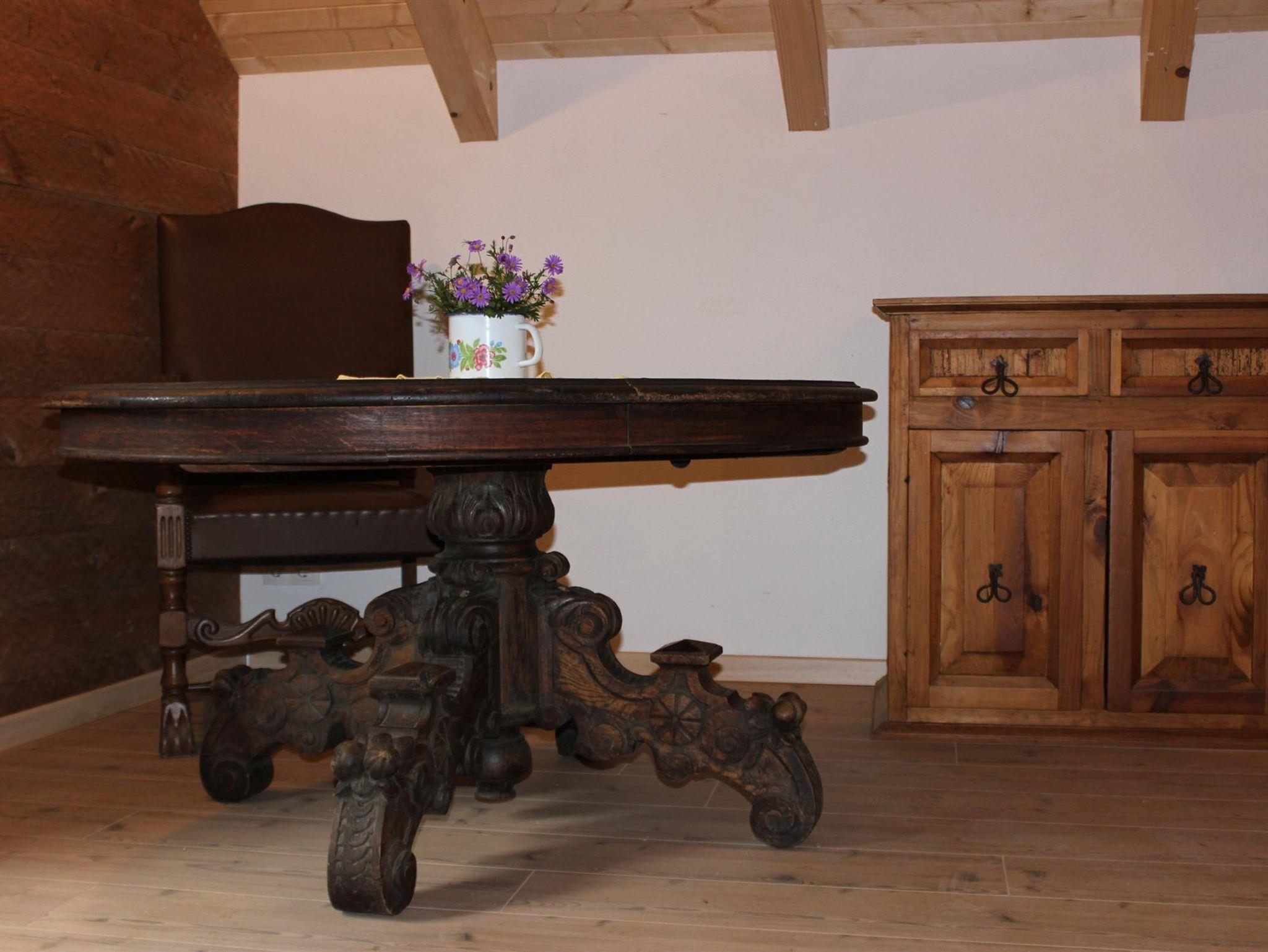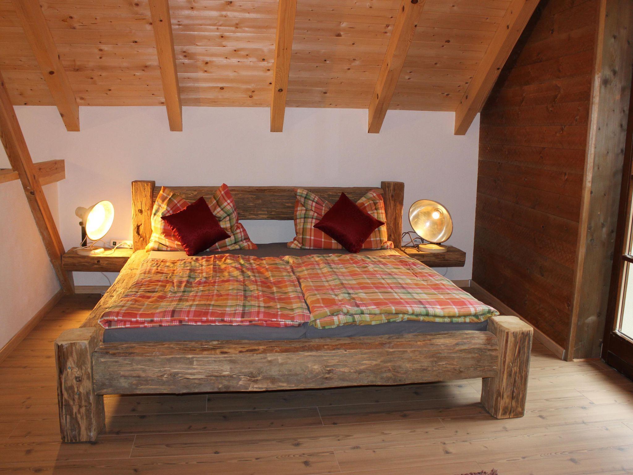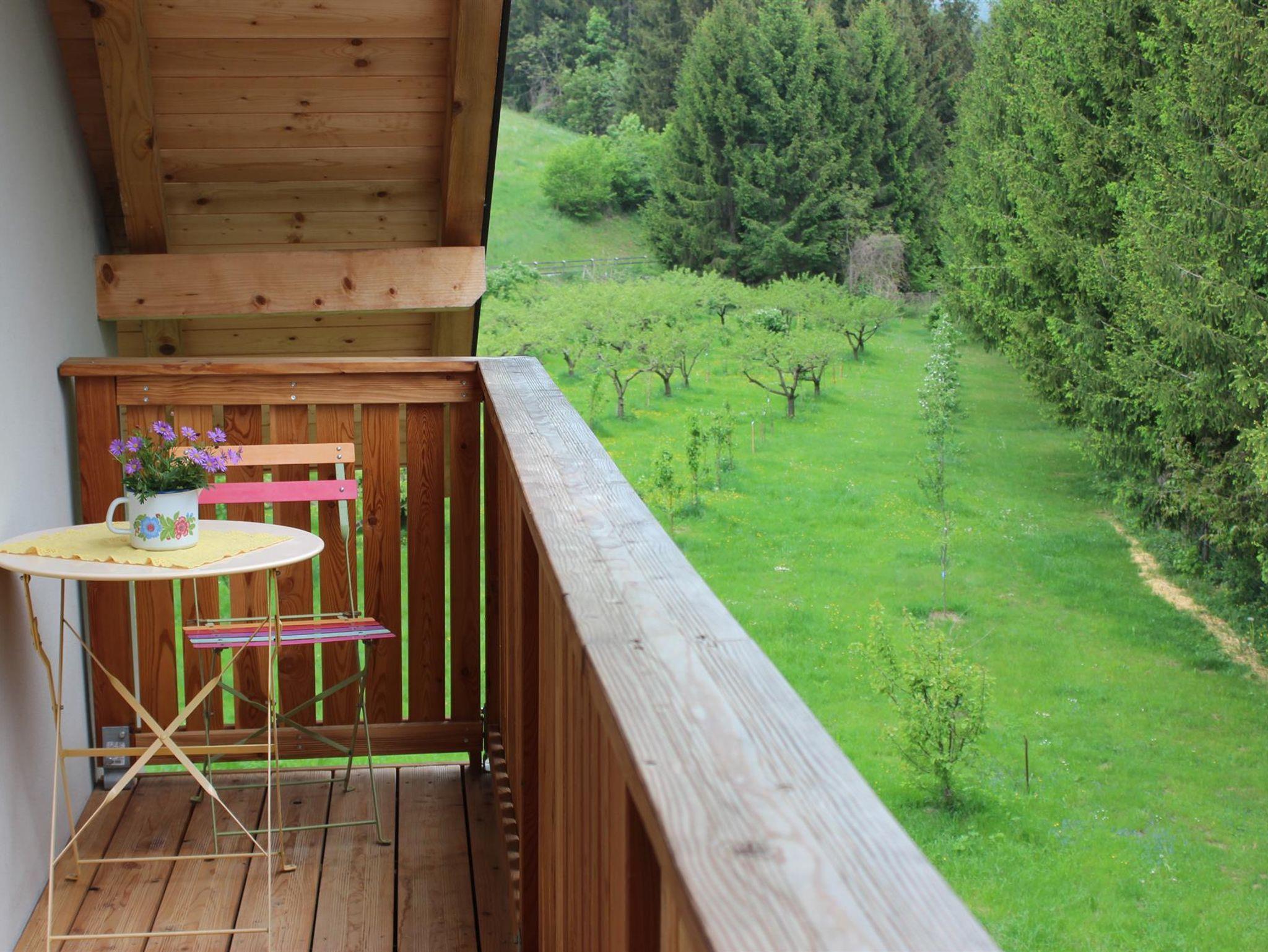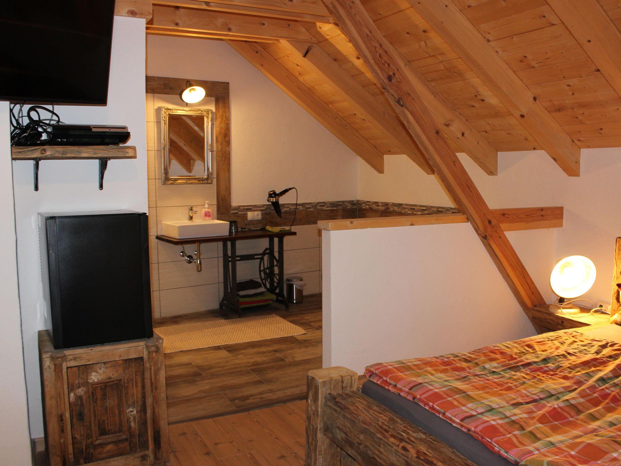 Unser Zimmer Residenz ist ein großer offener, hoher Dachraum, mit einem alten barocken Schlosstisch und fast schon herrschaftlichen Stühlen, die zum entspannen einladen. Gegenüber ist das große Altholzbett, mit Blick auf den Balkon und der grünen Natur. Vom privaten Balkon aus überblickt man unseren Obstgarten und die Feistritz. ideal für einen Nachmittagskaffe, oder für das Frühstück in absoluter Zweisamkeit.