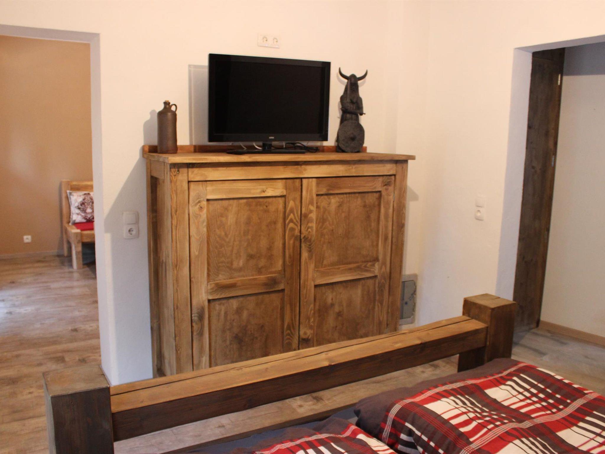 Großzügiges, gemütliches Zimmer mit Kingsize (2m x 2m) Unikatbett (welches von uns aus altem Dachstuhlholz gefertigt wurde), riesiger offener und ebener Regenfalldusche und sehr geräumiger 33m² privater Terrasse.