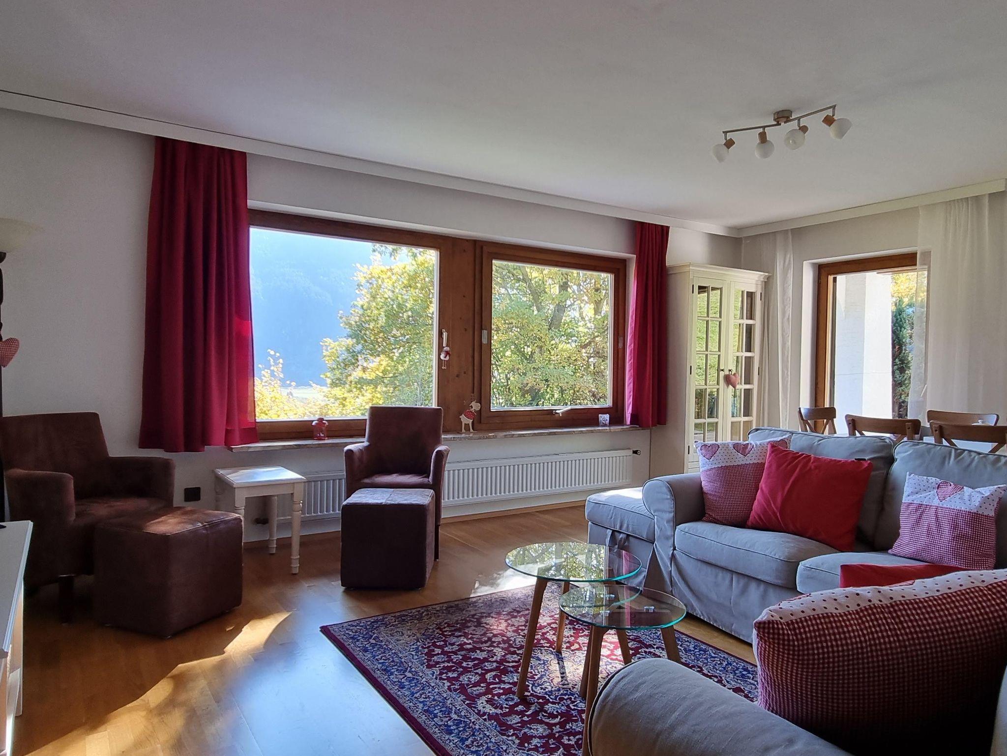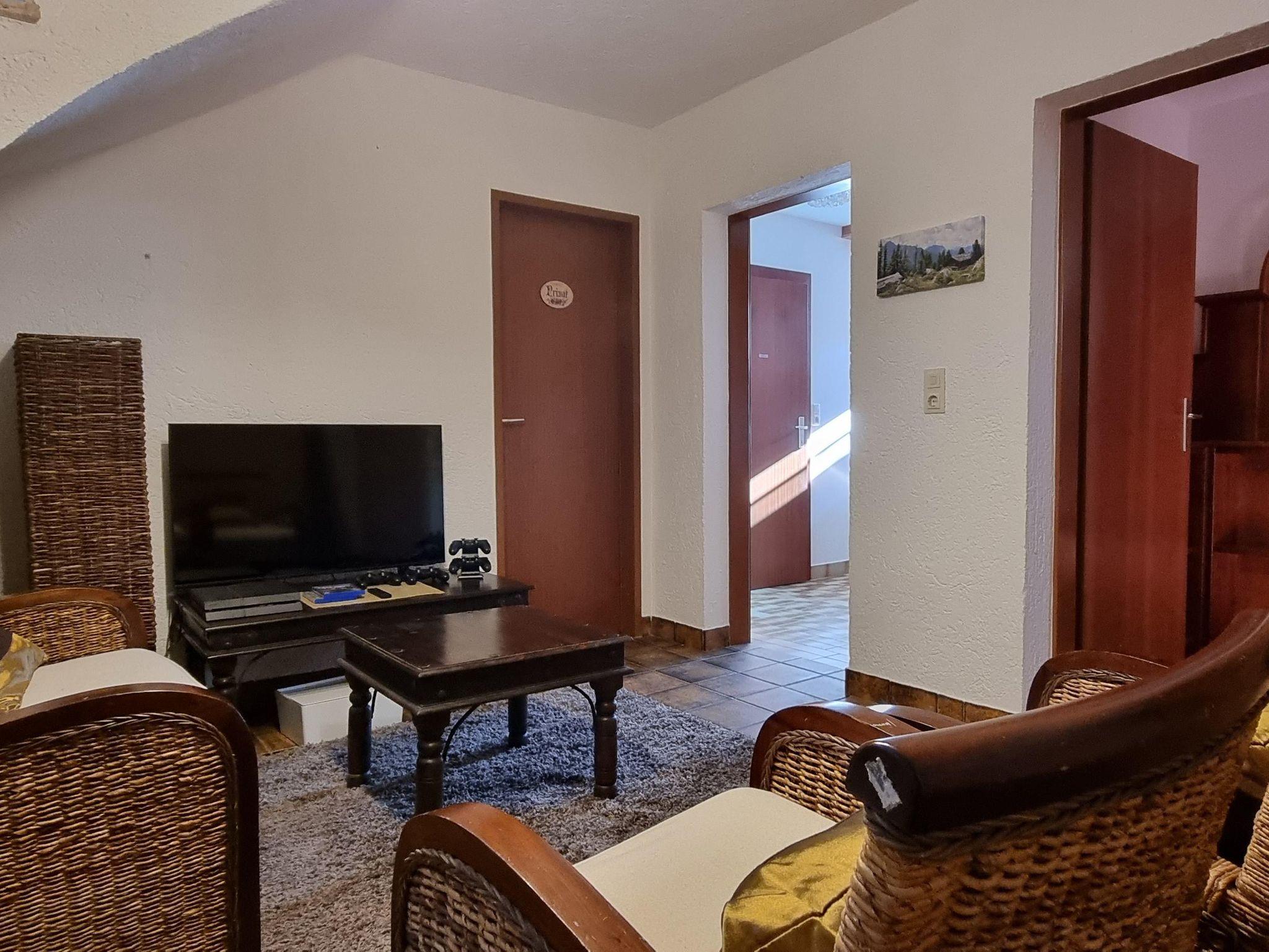 - Geräumiges Wohnzimmer mit großem Smart-TV und Gartentür