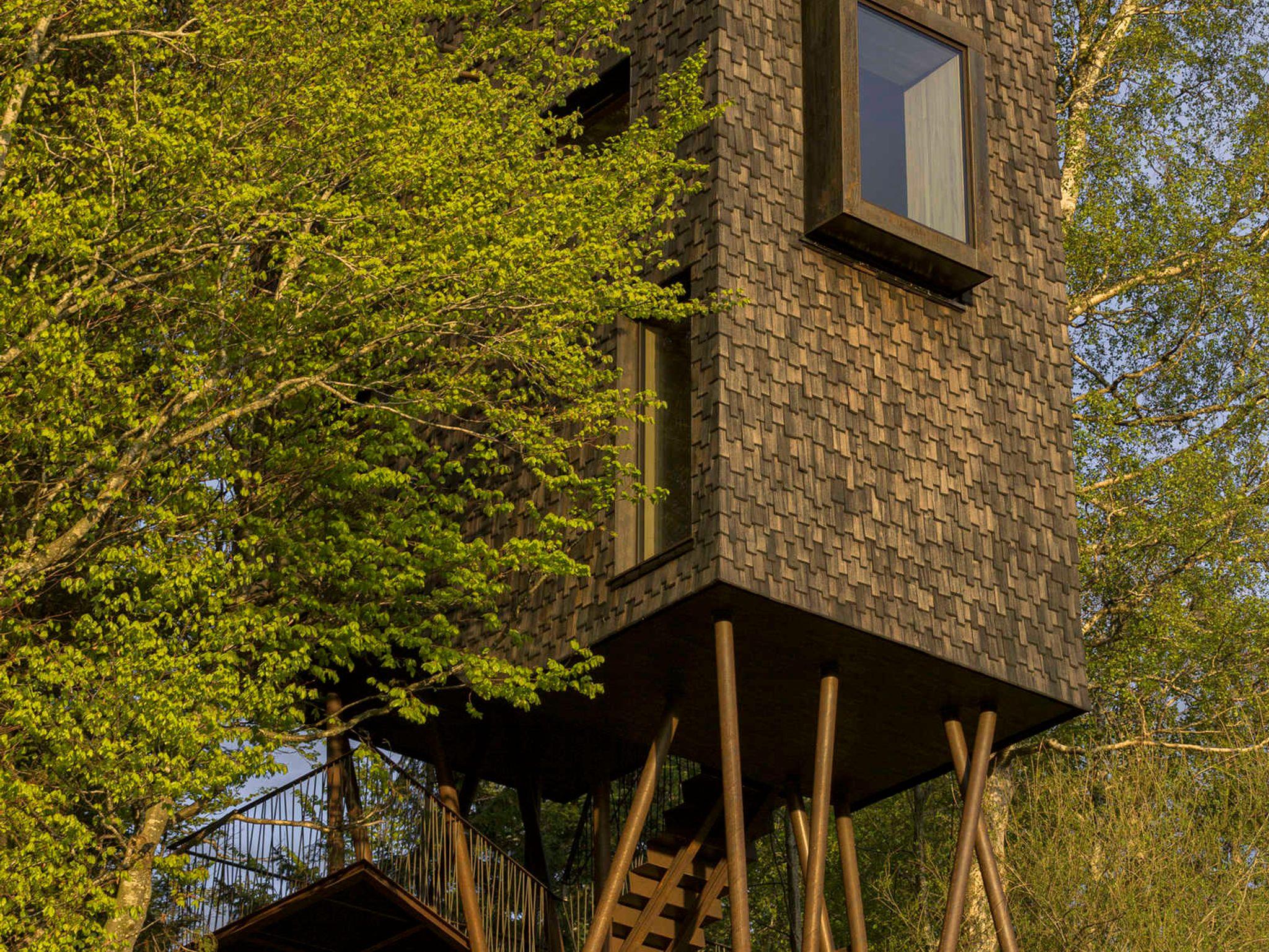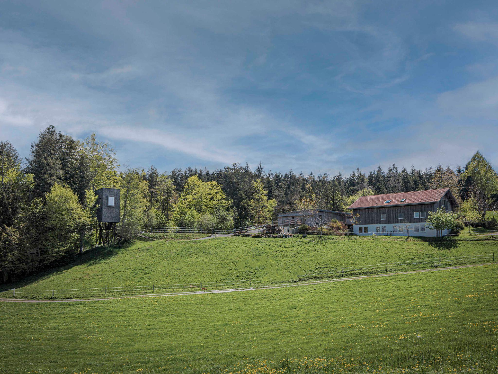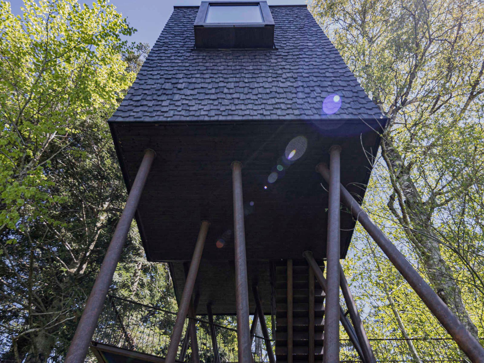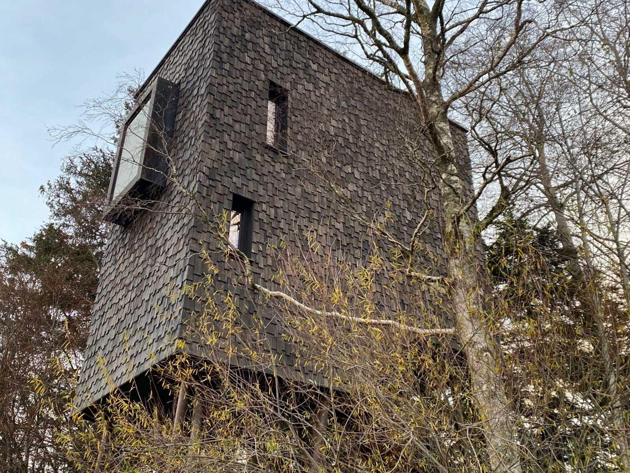 Unser Baumhaus wurde 2020 fertiggestellt. Es ist ein Holzbau auf Stahlsäulen mit einer Gesamthöhe von ca. 13 m. Außen hat das Häuschen eine Schindelfassade und innen ist es komplett aus heimischem Ulmenholz ausgebaut. Die Architektur wird Sie begeistern - ebenso die Ruhe und Aussicht.