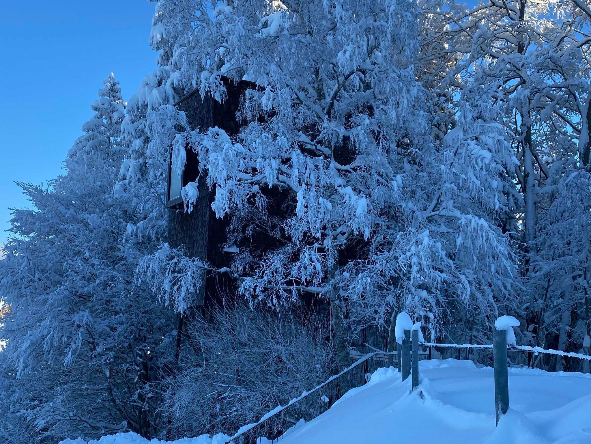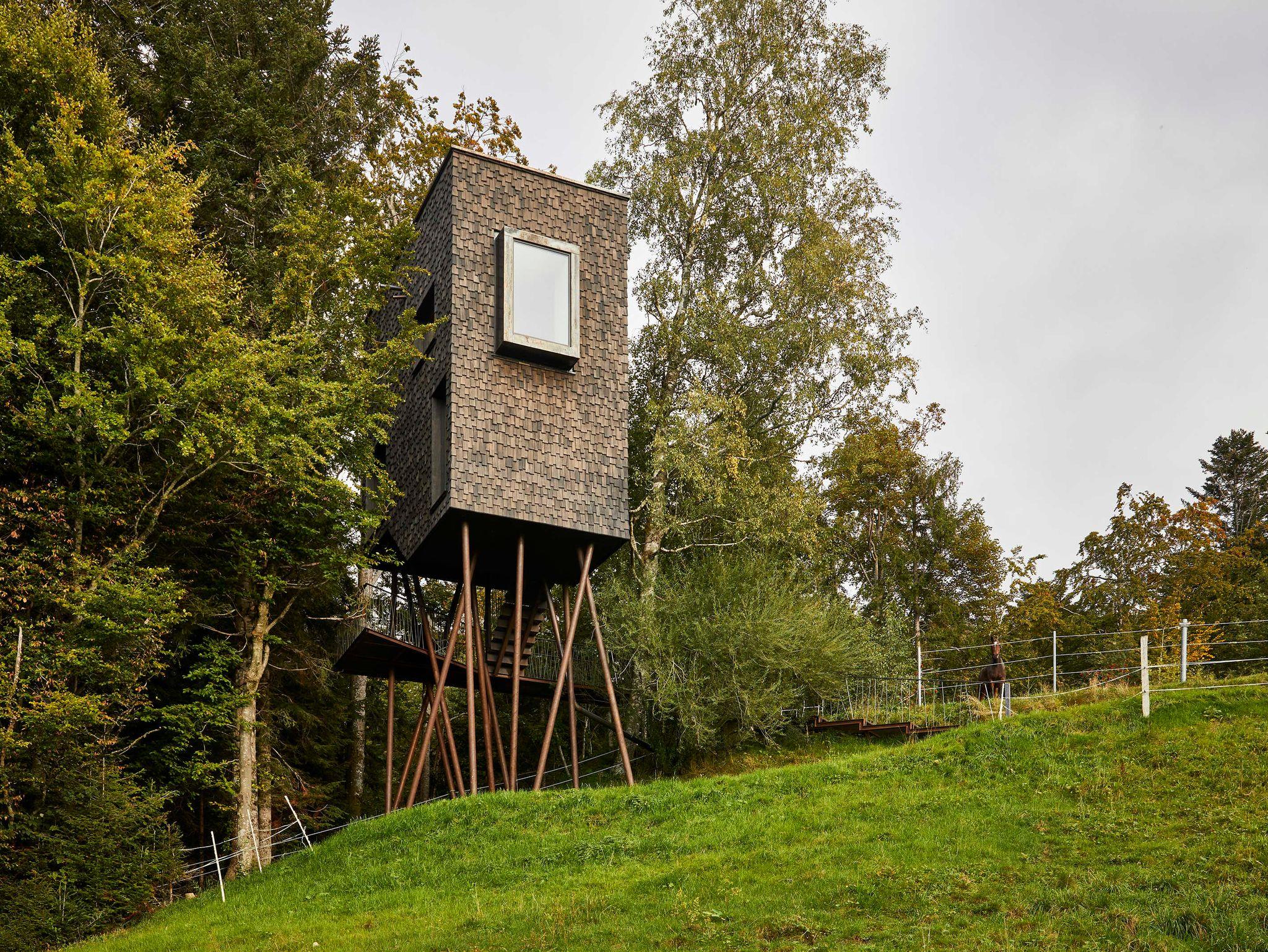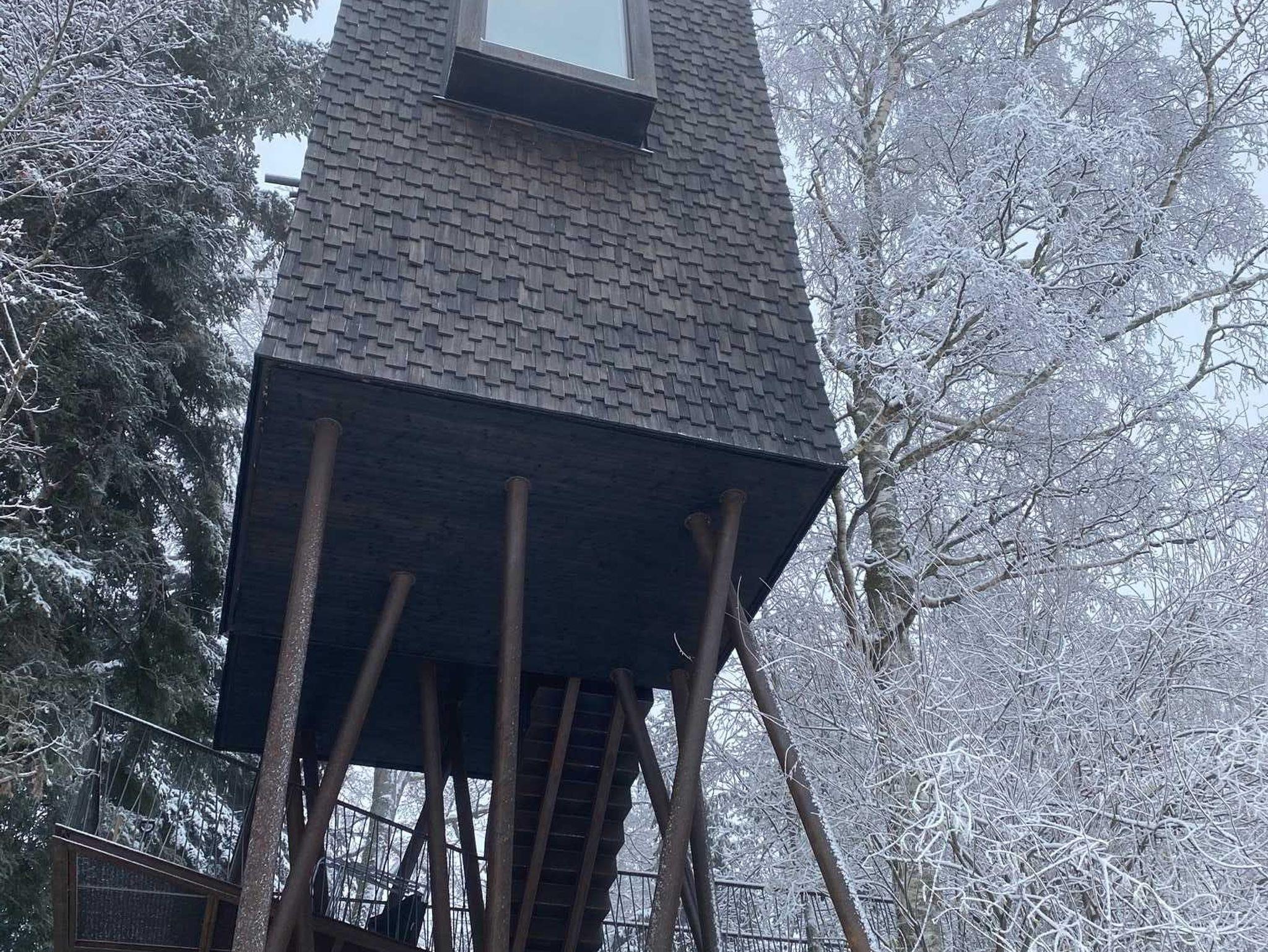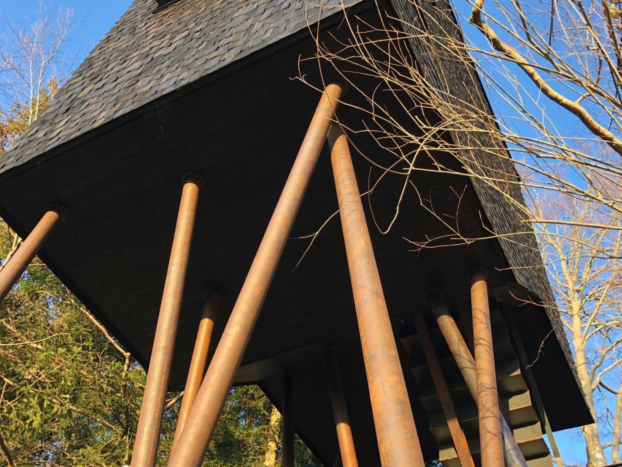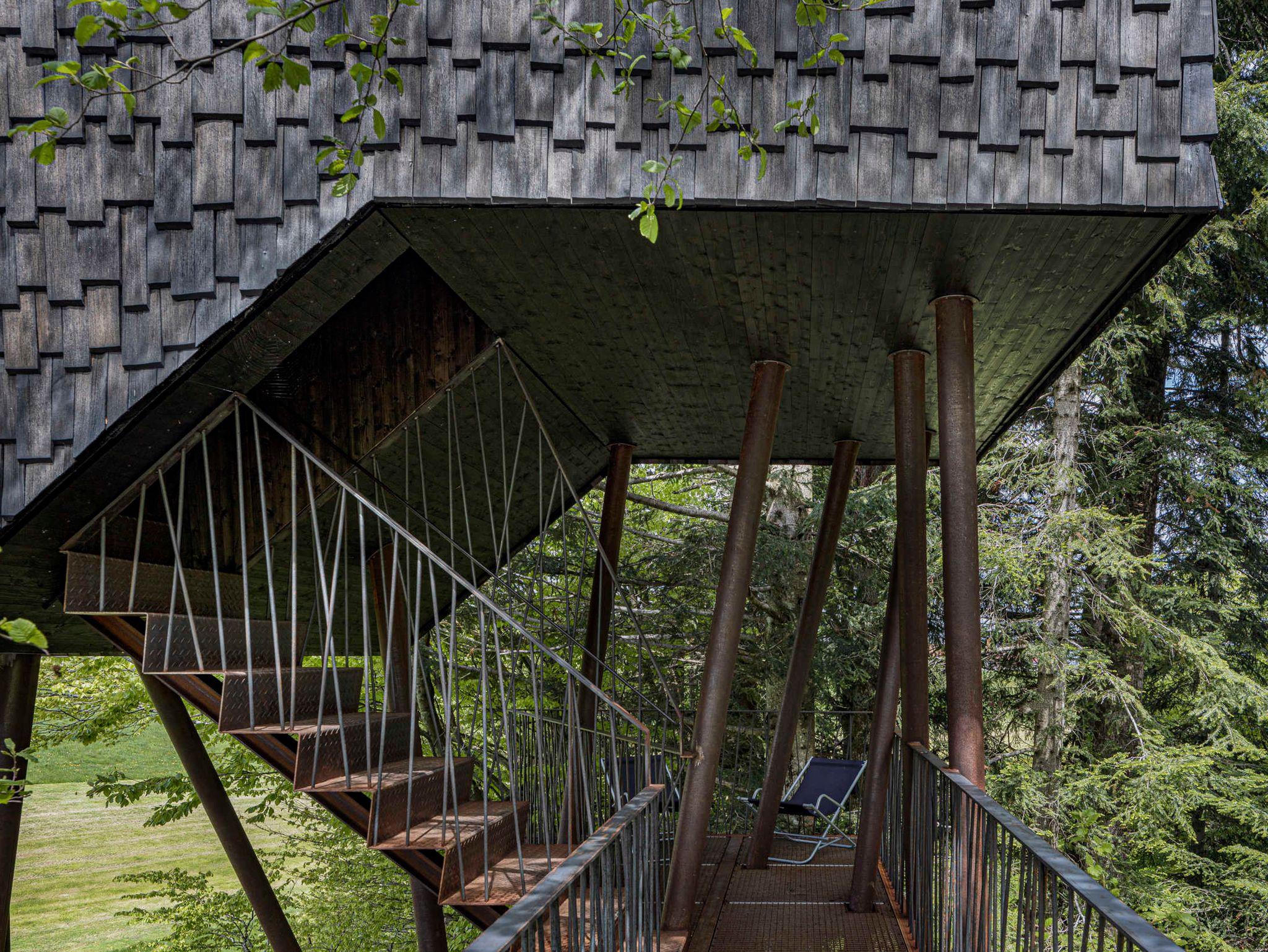 Unser Baumhaus wurde 2020 fertiggestellt. Es ist ein Holzbau auf Stahlsäulen mit einer Gesamthöhe von ca. 13 m. Außen hat das Häuschen eine Schindelfassade und innen ist es komplett aus heimischem Ulmenholz ausgebaut. Die Architektur wird Sie begeistern - ebenso die Ruhe und Aussicht.