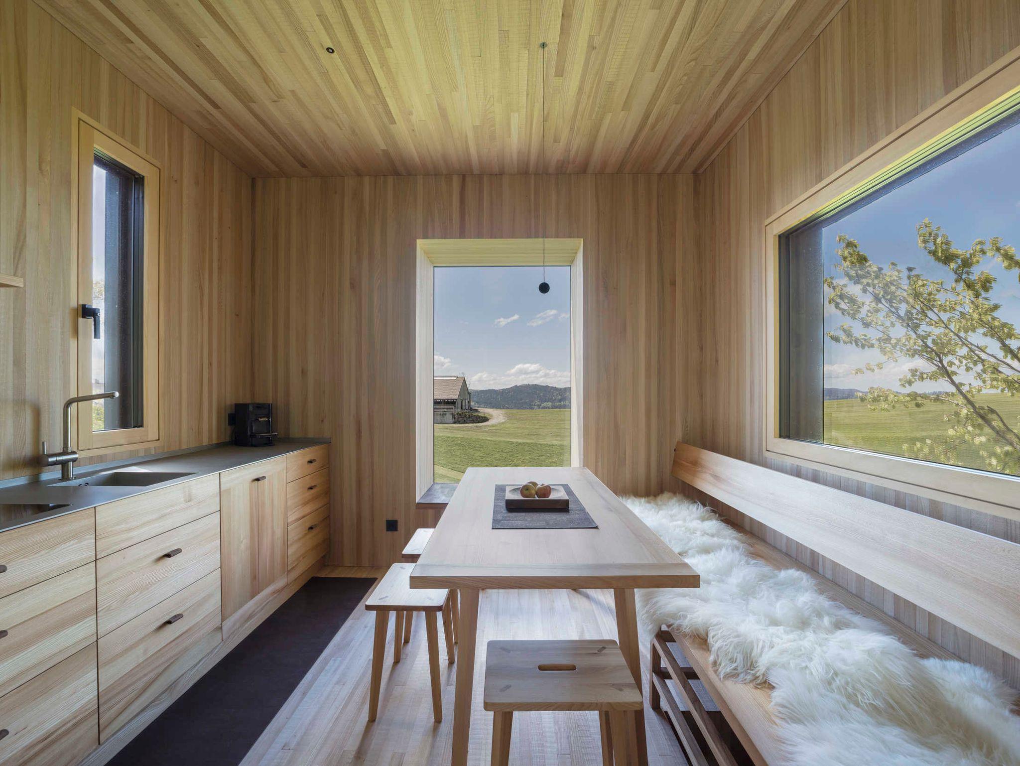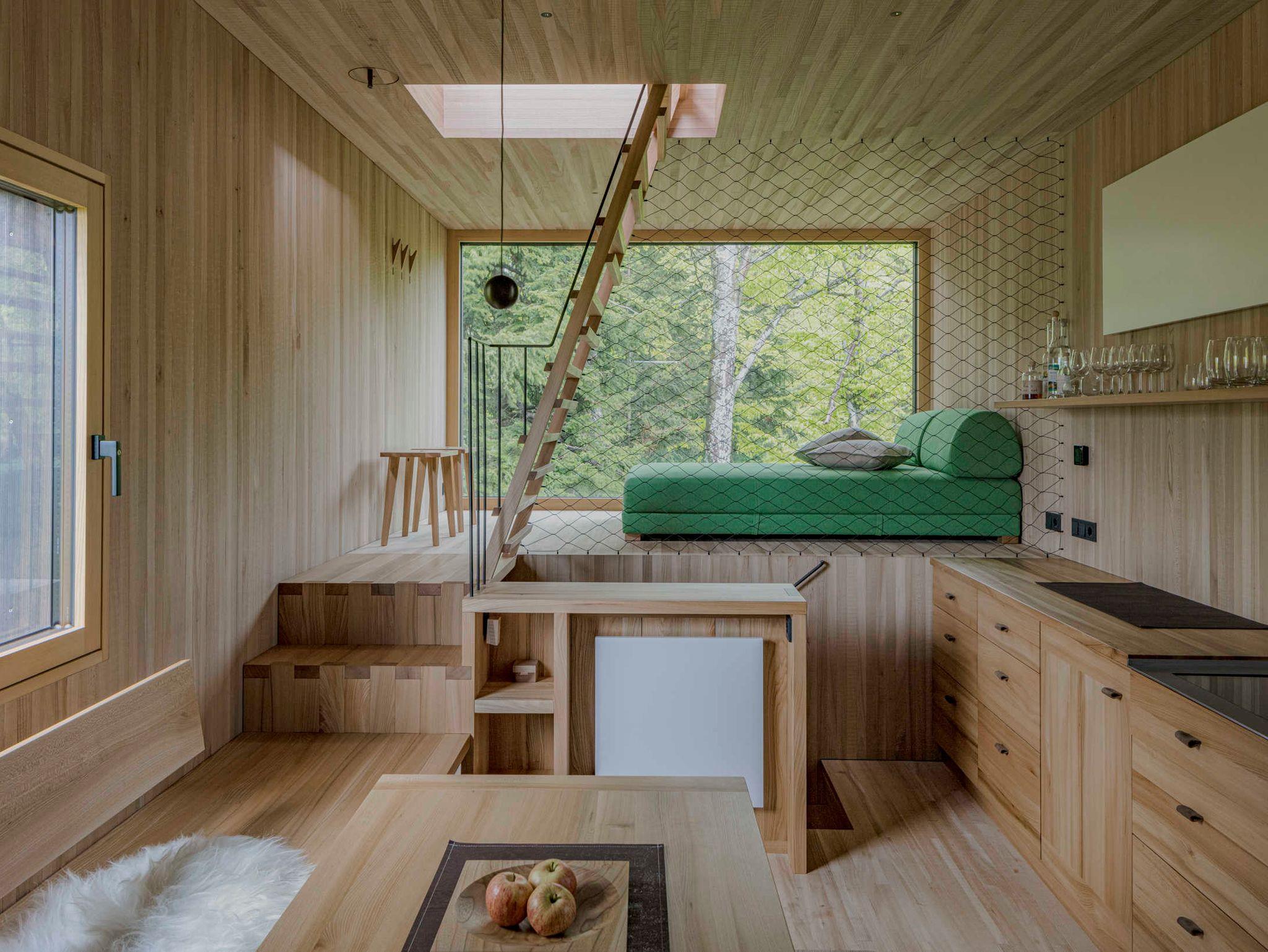 Im Baumhaus ist eine Schlafkoje für 2 Erwachsene Personen und eine französische Liege (120 x 200 cm). Außdem eine Dusche, WC, und eine komplett eingerichtete Küche.