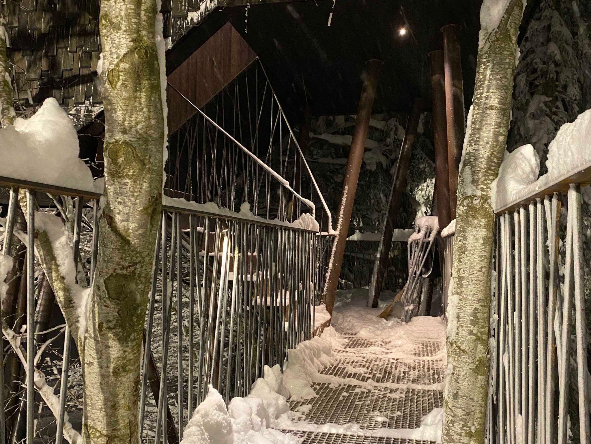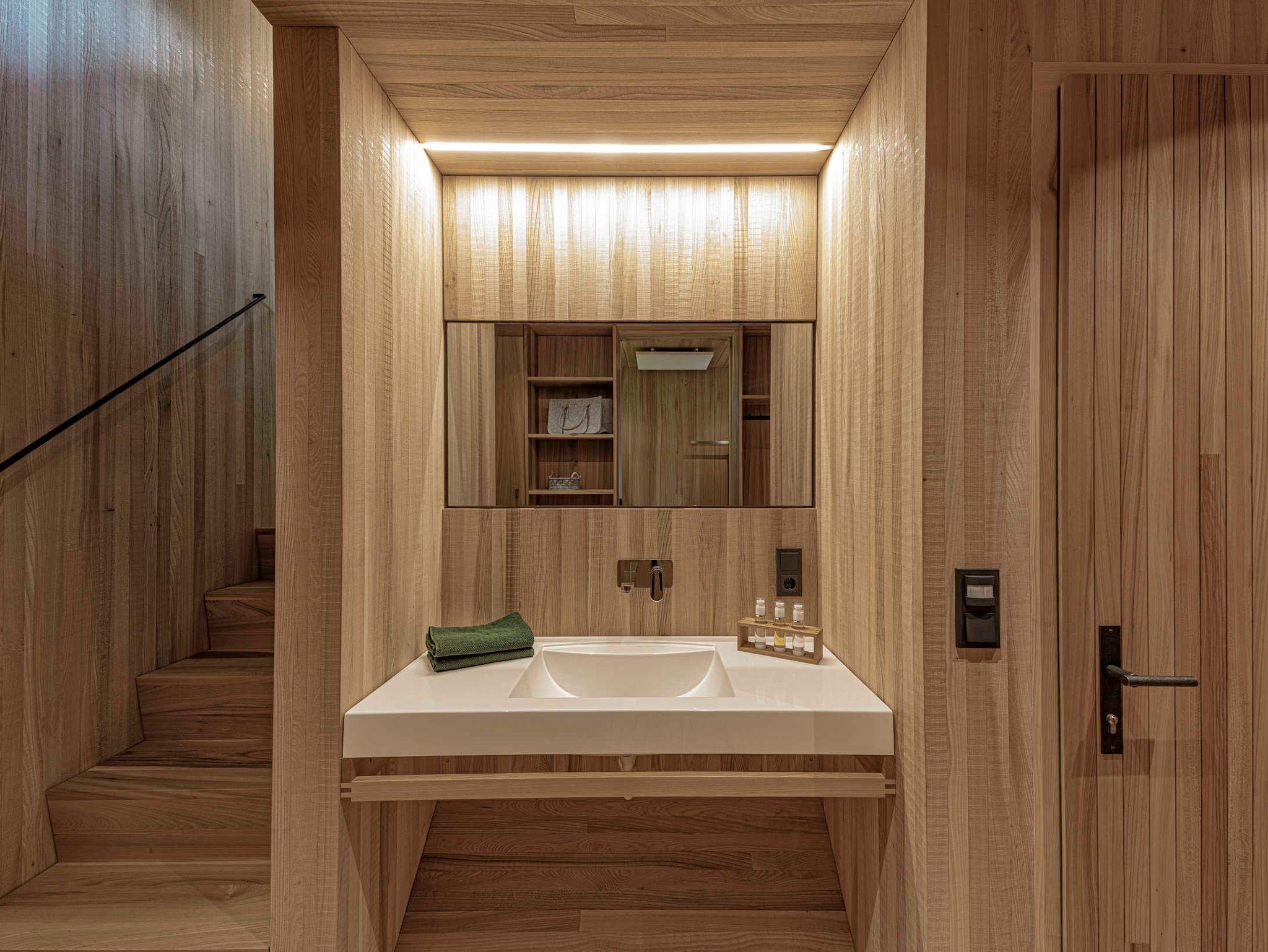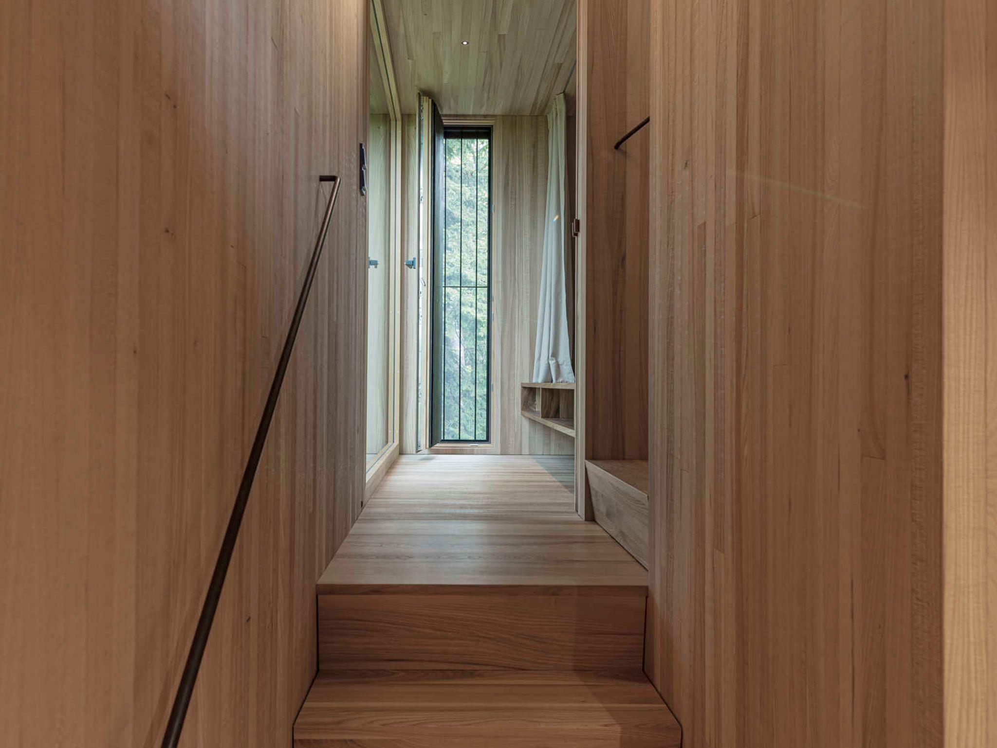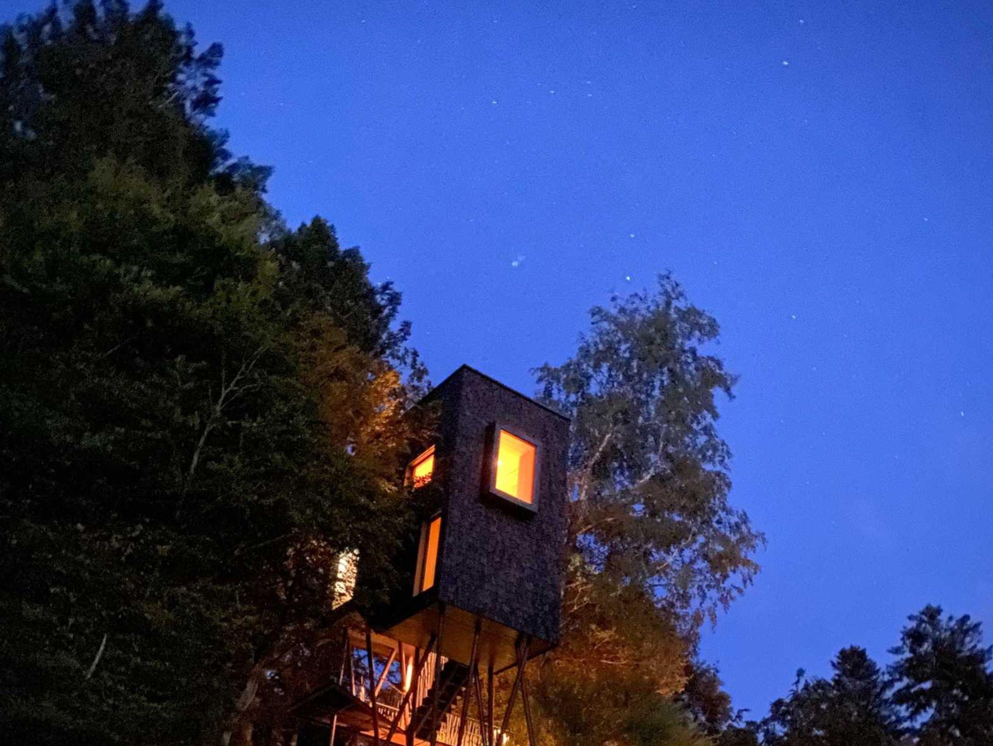 Zum Baumhaus gehört eine Terrasse, sowie ein Außenbereich mit Sitzgelegenheit und Grill. Das Haus ist ausgestattet mit einer Holzdusche und WC, Schlafzimmer, Küche mit Induktionsherd und Geschirrspüler, sowie einem Wohn- und Relaxbereich.