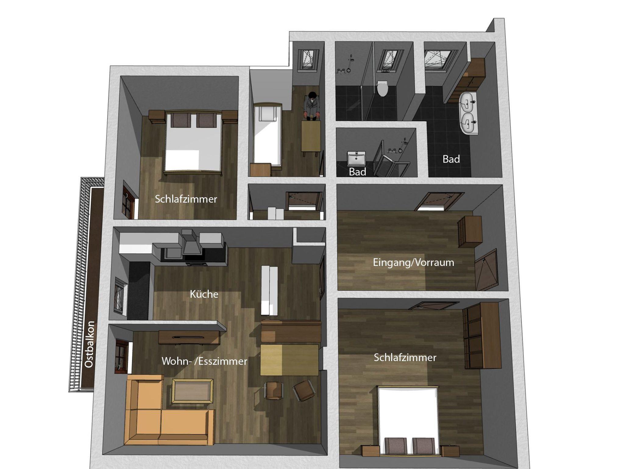 Dieses neu erichtete Apartment ist ausgestattet mit 2 Schlafzimmer für je 2 Personen und ein Schlafzimmer für 1 Person,2 x DU/WC, Ostbalkon.