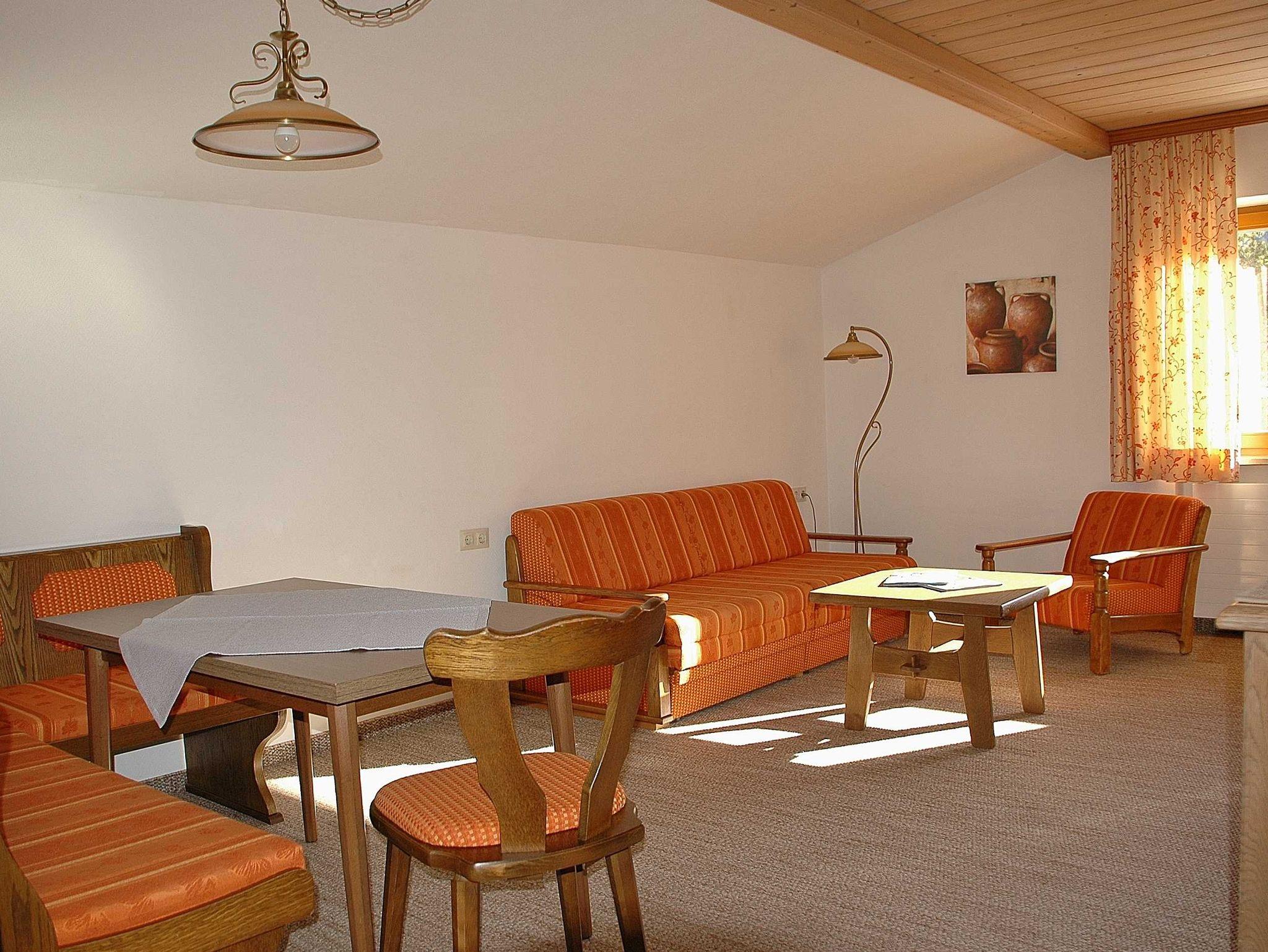 Appartement ( ca. 50 m²) im 2. Stock mit kleiner Süd-Loggia und Blick über unsere gepflegte Gartenanlage zum Neunerköpfle und in Richtung Vilsalpsee. Großer Wohnraum mit Couch und Essecke, Küche, Vorraum, Doppelbett-Schlafzimmer, Dusche/WC, TV/Radio, Telefon.