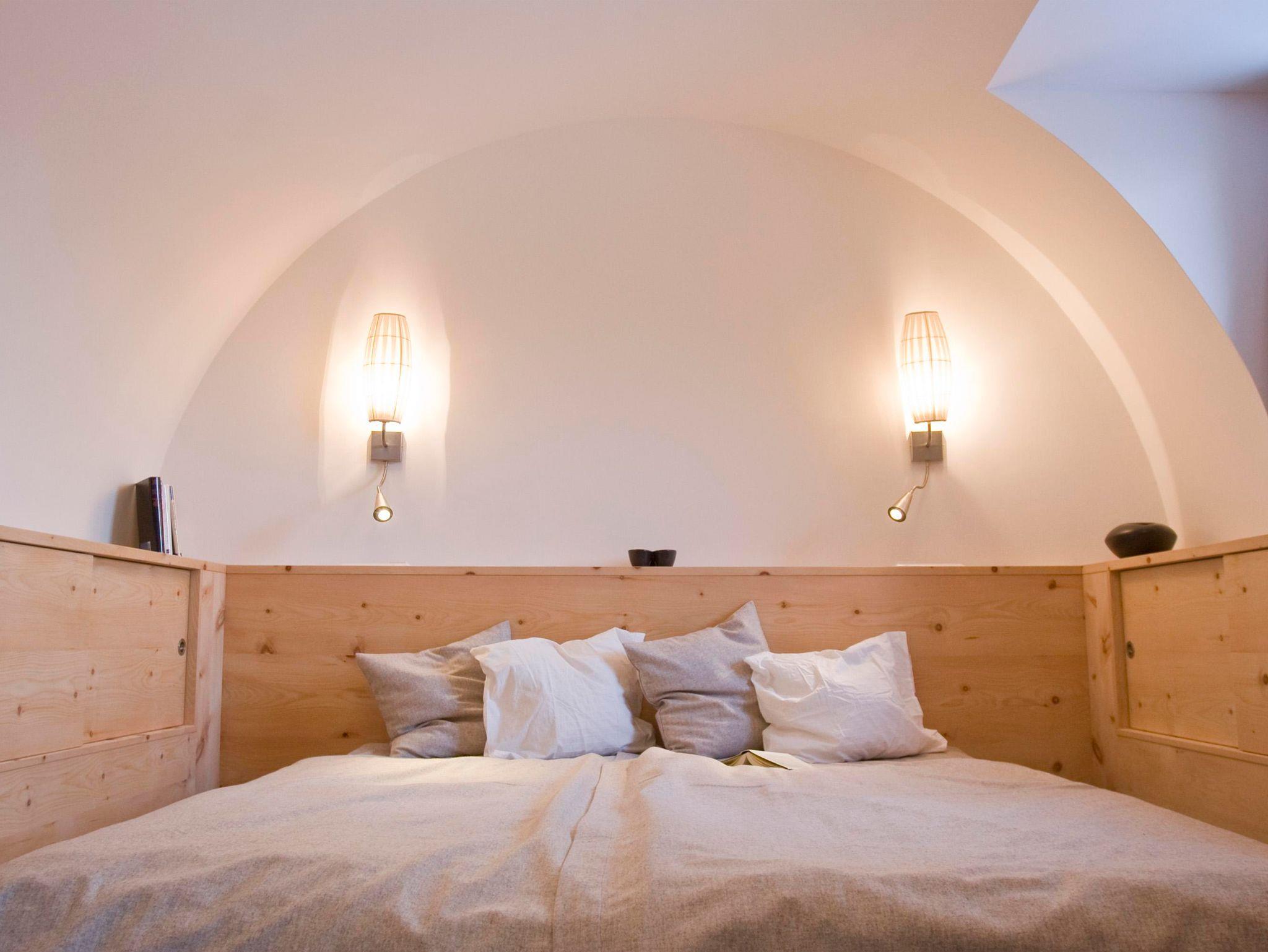 Der Innenraum mit den hohen Gewölbedecken und den liebevoll, mit Zirbenholz errichteten Staumöglichkeiten bietet ein unvergessliches Wohngefühl für junge und jung gebliebene Gäste.