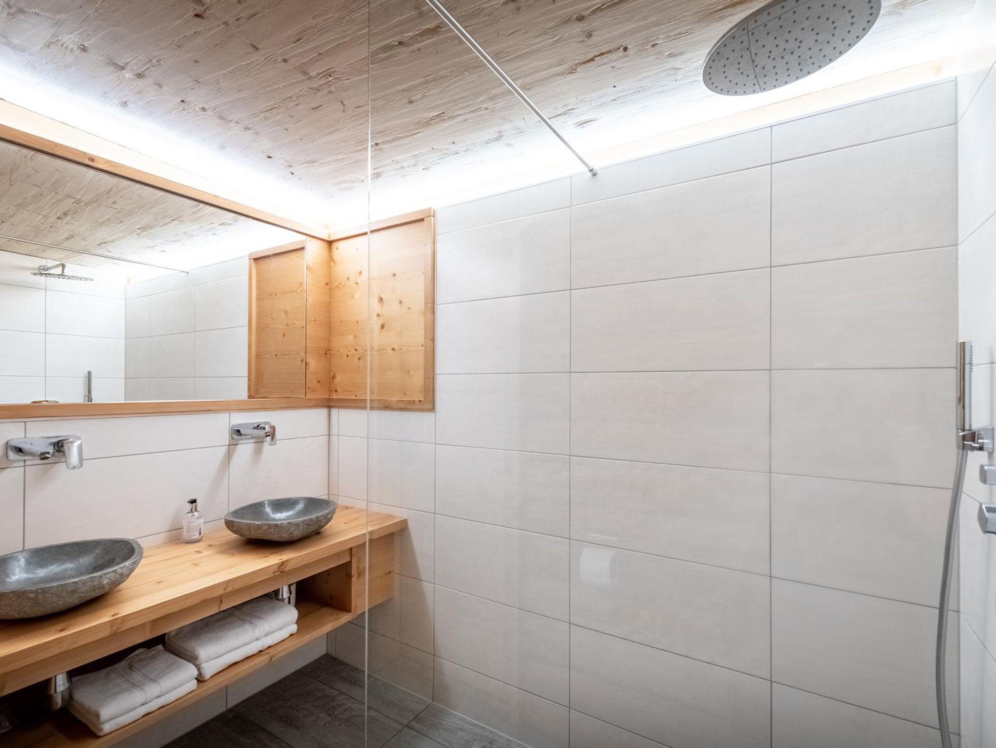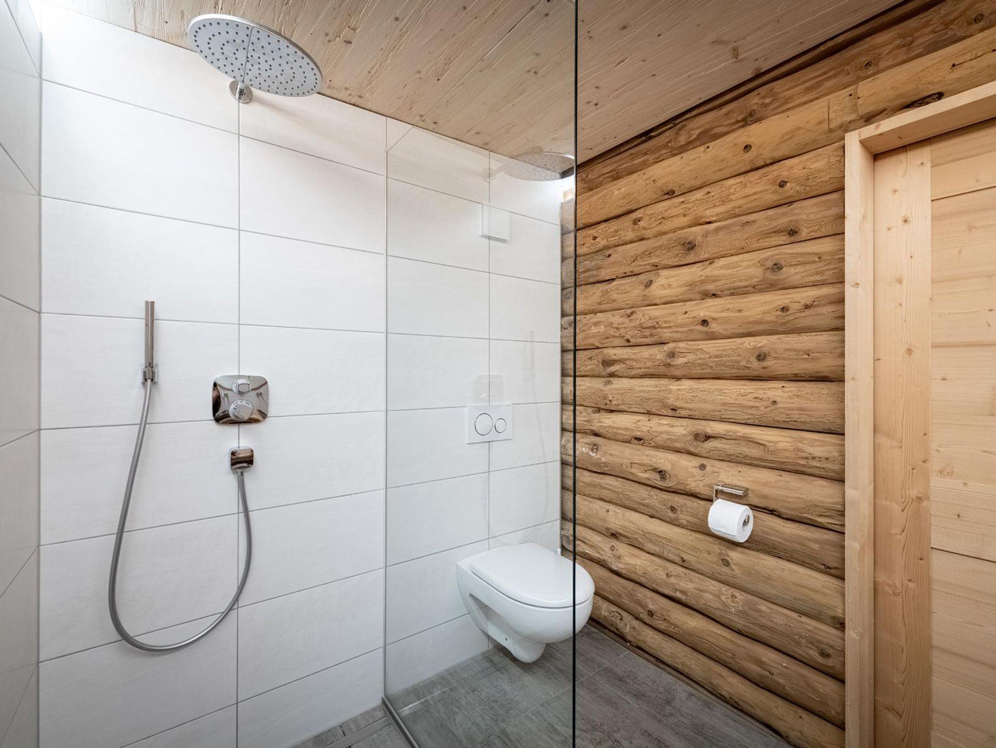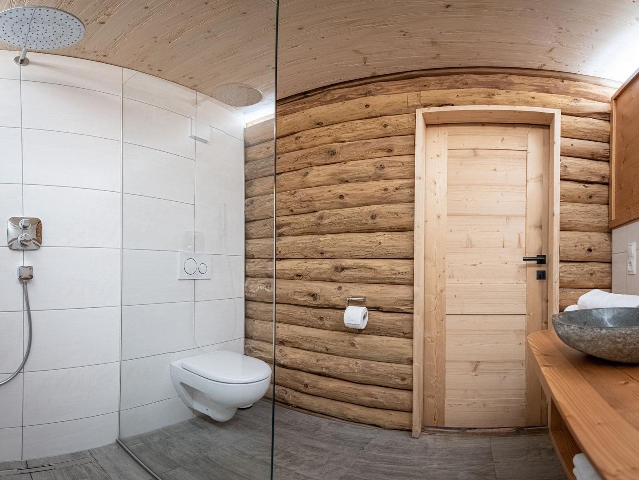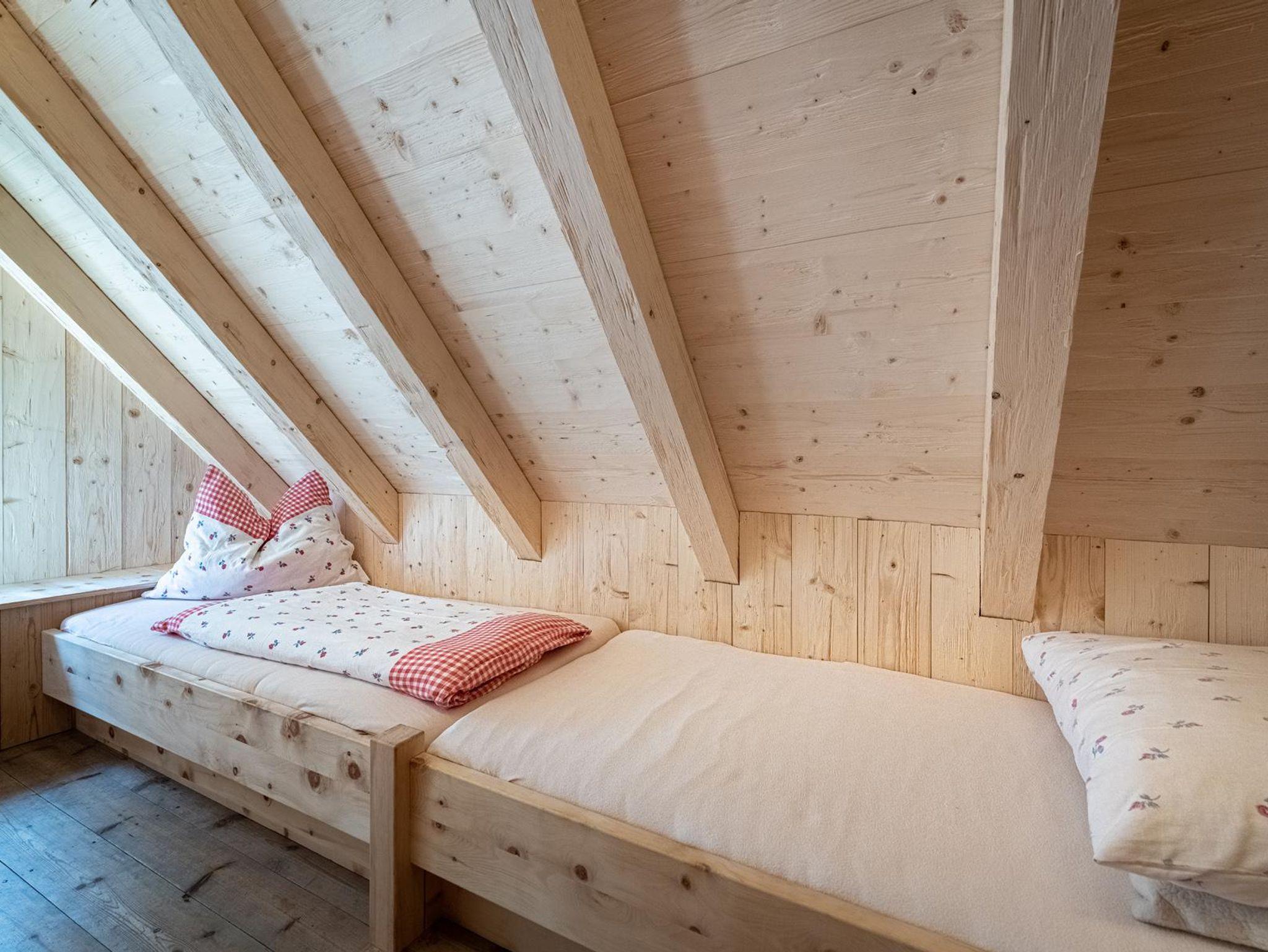 Über eine Holztreppe gelangt man unter das Dach der Hütte, wo man eine putzige Schlafkammer für bis zu 4 Personen vorfindet. Es gibt ein kuscheliges Doppelbett und zwei Einzelbetten, die wunderbar nach Zirbenholz duften und einen angenehmen Schlaf bereiten. Im Erdgeschoss befindet sich noch ein weiteres Zusatzbett. Im Mai 2020 wurde der gesamte untere Bereich mit einer Bodenheizung nachgerüstet. Es wurde ein Badezimmer mit WC und Dusche für etwas mehr Komfort zugebaut und zusätzlich wurde die Terrasse erweitert.