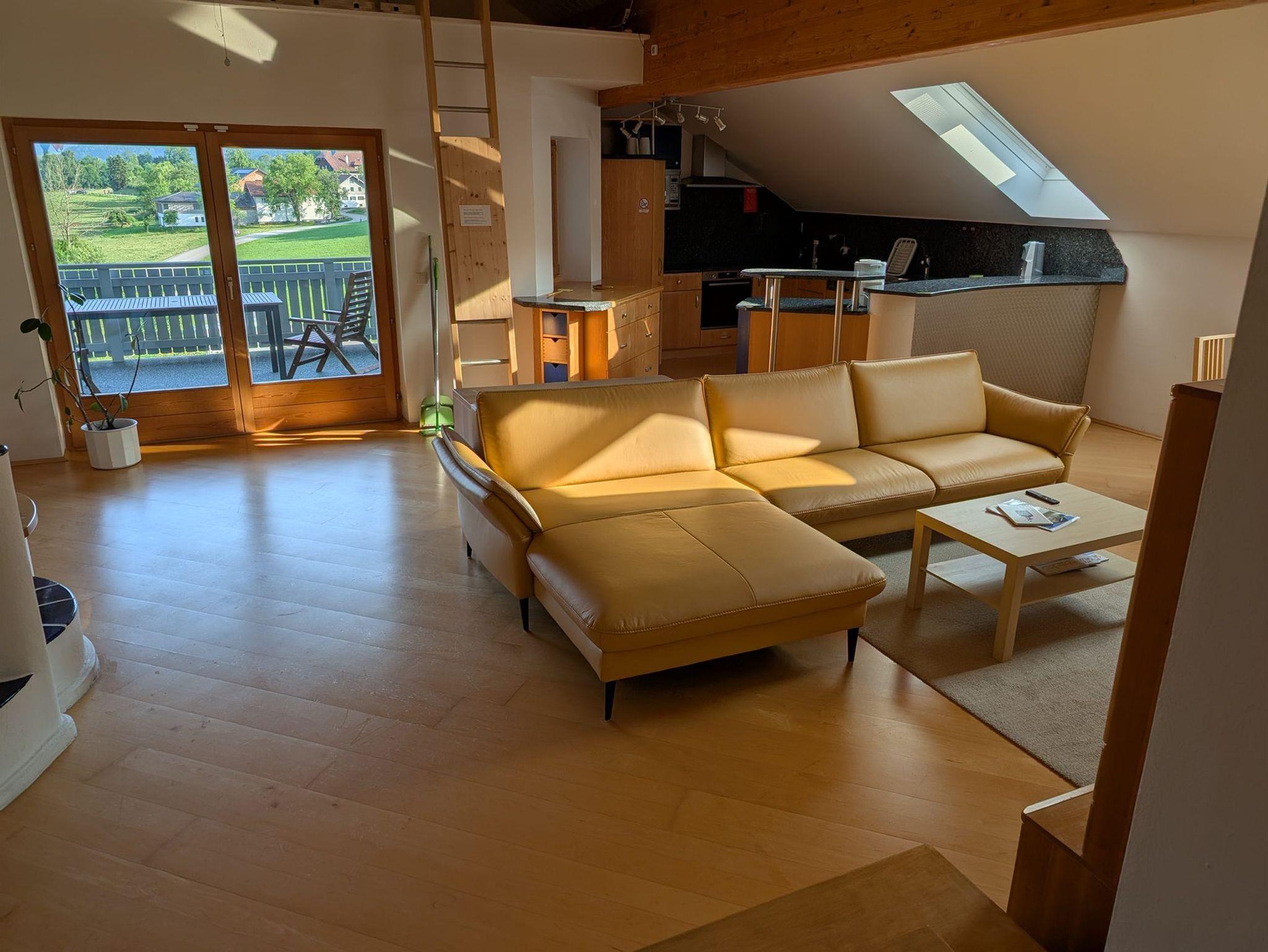 Die große 120m² Ferienwohnung mit überdachtem Balkon und Panoramablick. Unser Juwel im obersten Stock ist ideal für Familien. Für die kalten Tage haben wir auch einen romantischen Kachelofen anzubieten.