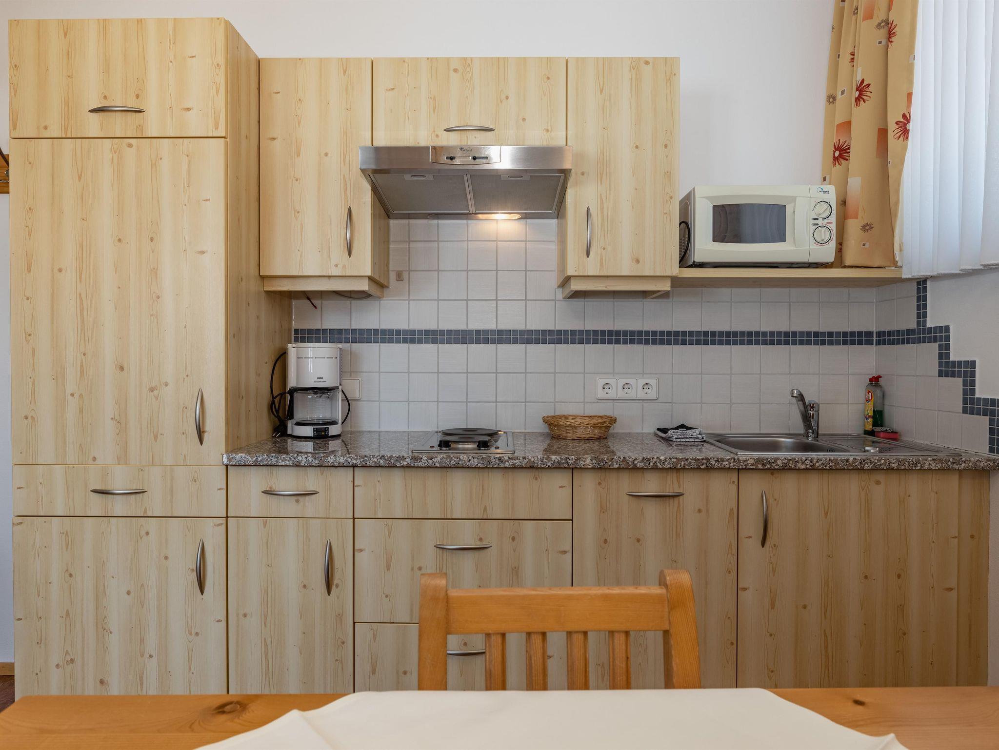 Die Appartements sind ca. 35 m2 groß im Nebengebäude (ca. 50m vom Haupthaus entfernt), haben 1 Schlafzimmer, Dusche/WC, Wohnküche mit ausziehbarer Couch (150x200, auf der die Kinder schlafen könnten), Mikrowelle, Herd, Kaffeemaschine und Kühlschrank mit Gefrierfach, Essecke, 2xSat-TV und Balkon; Nichtraucher