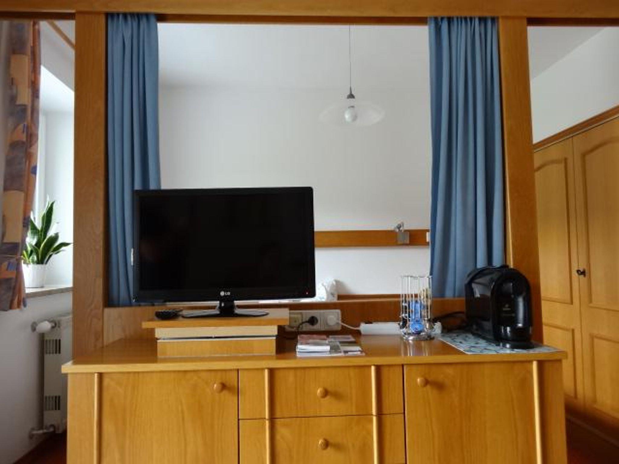 Details: Vorraum, Wohn-/schlafraum mit Kochnische, Balkon, Dusche und WC. Gratis W-LAN und SAT-TV. Die Kochnische ist mit Kühlschrank, Mikrowelle, Wasserkocher, Kaffeemaschine (Kapsel oder Filter je nach Wunsch) sowie Koch- und Essgeschirr ausgestattet. Bettwäsche, Hand- und Duschtücher, Geschirrtücher sind vorhanden.
